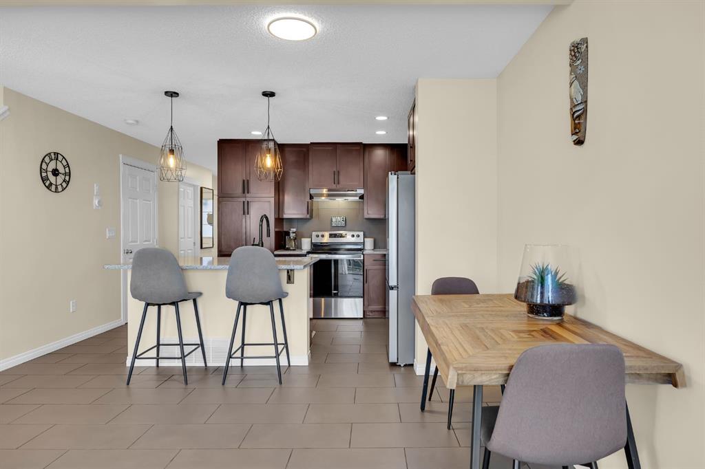 The main floor features a warm and welcoming living room highlighted by a cozy gas fireplace, perfect for relaxing evenings or entertaining. Large windows flood the space with natural light, complemented by tasteful lighting upgrades and dimmers throughout. The kitchen is both functional and stylish, offering granite countertops, ample cabinetry, a new stainless steel fridge (2025), and a dishwasher replaced in 2021. A convenient dining area opens directly to the south-facing back deck, complete with a gas BBQ line and peaceful views of the walking path behind the home, ideal for outdoor dining or enjoying your morning coffee.