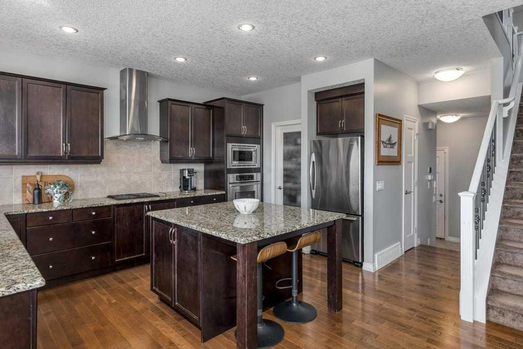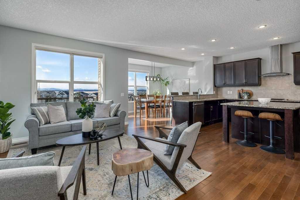 Stunning Mountain View Walkout in Sunset Ridge||Welcome to this exceptional two-storey walkout home in the highly sought-after community of Sunset Ridge in Cochrane, offering breathtaking mountain views from all three levels and backing directly onto a park—an ideal setting for families who value space, serenity, and community. From the moment you arrive, the expansive views set the tone for this special property. Inside, a large foyer with ceramic tile welcomes you and leads into a bright open-concept main floor featuring warm hardwood flooring throughout the kitchen, dining, and living areas. Designed for both everyday living and entertaining, the spacious kitchen offers abundant cabinetry, a large island, and raised breakfast bar seating. The dining area opens onto the back deck where you can soak in the panoramic mountain vistas, watch the kids play in the park behind, or enjoy grilling with friends using the natural gas BBQ hookup. The inviting living room features a gas fireplace, creating a warm and comfortable gathering space while taking in the spectacular views. Upstairs, the home continues to impress with a thoughtfully designed layout. The upper level includes three bedrooms, a huge bonus room with soaring 10-foot ceilings, a convenient laundry room, and a dedicated tech desk with two workspaces—perfect for homework, remote work, or family organization. The primary suite is a true retreat, featuring breathtaking mountain views, ample space for a king-sized bed, and a practical five-piece ensuite bathroom that leads to your walk-in closet.