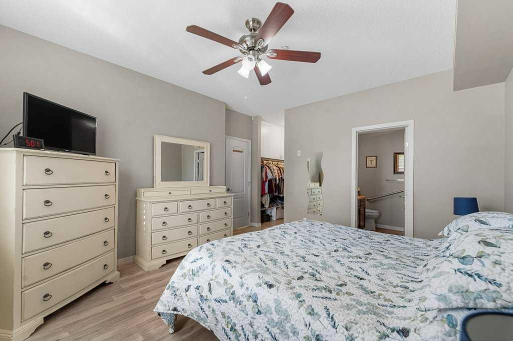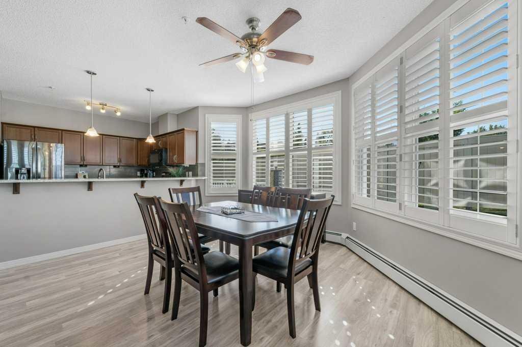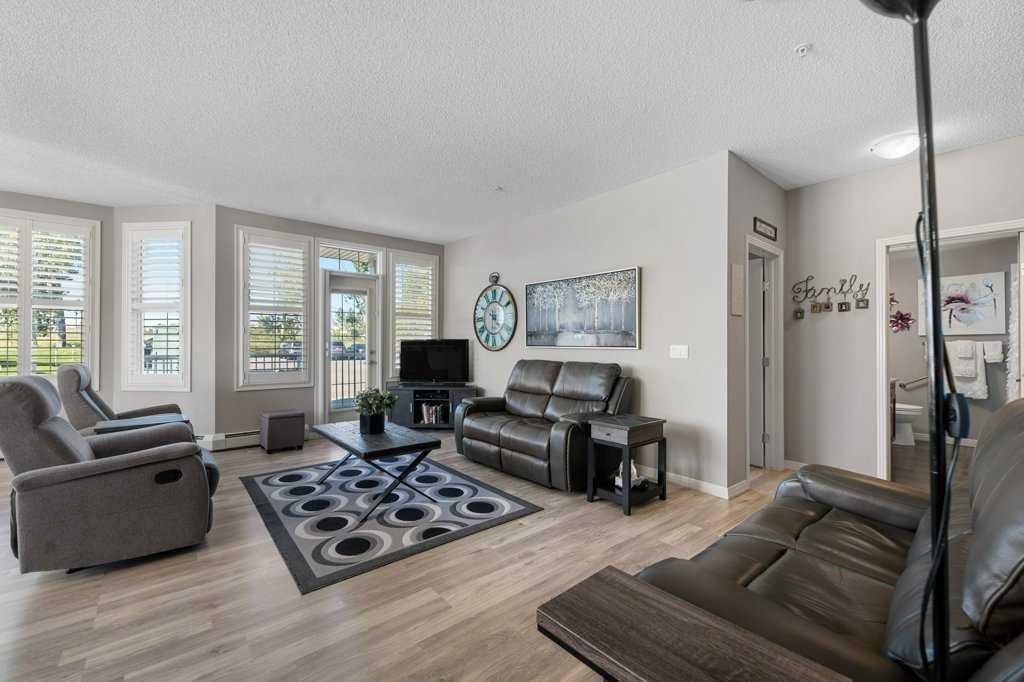 Welcome to this beautiful large corner “former show suite” – located on the main floor of the desirable Penncross complex. So much natural light from large windows throughout the living room and both bedrooms, this home offers a bright and open executive space. Thoughtful upgrades are found throughout, including high-end shutters on all windows, a corner built-in cabinet near the entry, a built-in “Murphy Bed” in the guest room, plus a full sized washer and dryer. The gourmet kitchen is large, with an abundance of cabinetry, plus granite counters, complimented by stainless steel appliances. The living room is spacious, allowing room for entertaining. The primary bedroom features a walk-in closet and a private updated 3-piece ensuite, while the second bedroom is generous in size and conveniently located next to a 4-piece main bathroom. Penncross offers outstanding amenities including a fitness centre, games room, library with fireplace, and indoor/outdoor putting greens—perfect for relaxing or entertaining. Just steps away is Crystal Ridge Golf Course, and your condo fees include year-round lake access to Crystal Shores. To top it all off, this unit comes with two titled underground parking stalls—a rare and valuable bonus. Enjoy executive-style living at an incredible value in one of Okotoks’ most desirable communities!