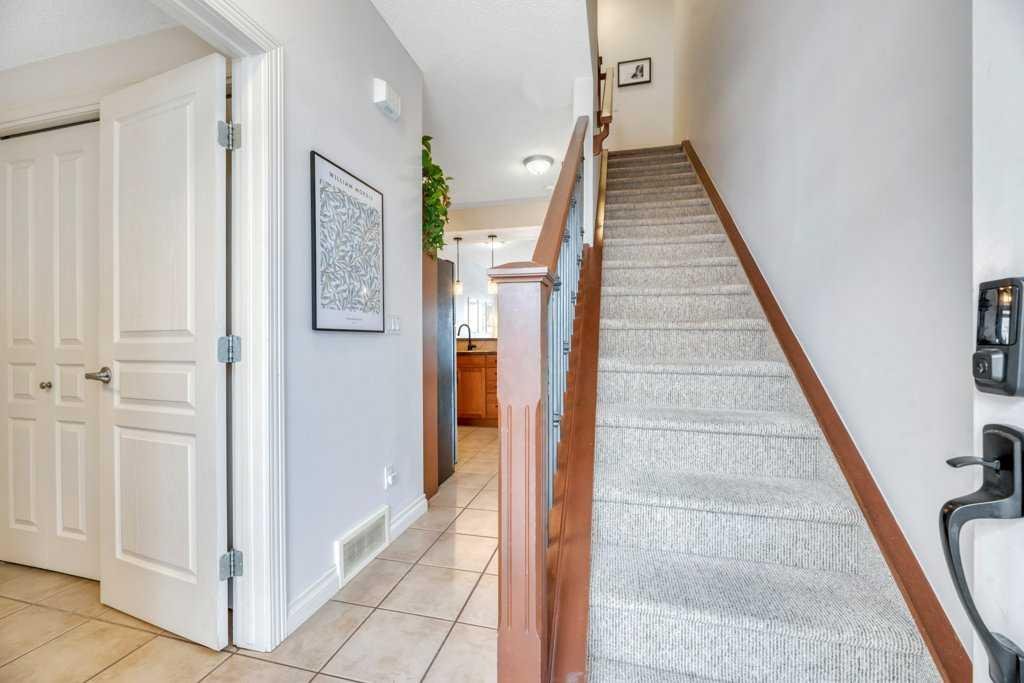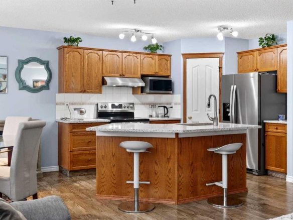 The main floor features 9’ ceilings, laminate and tile flooring, stainless steel appliances, and spindle railings. The kitchen offers a pantry and breakfast bar, opening into a bright dining and living area with direct access to a sunny, south-facing patio with mountain views and a gas line for BBQ.