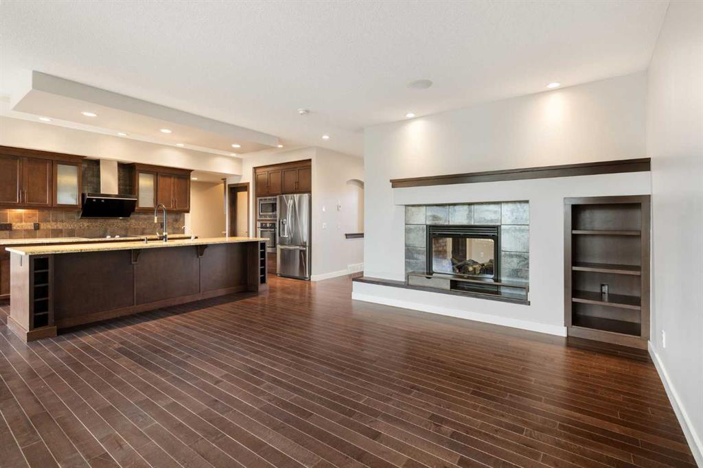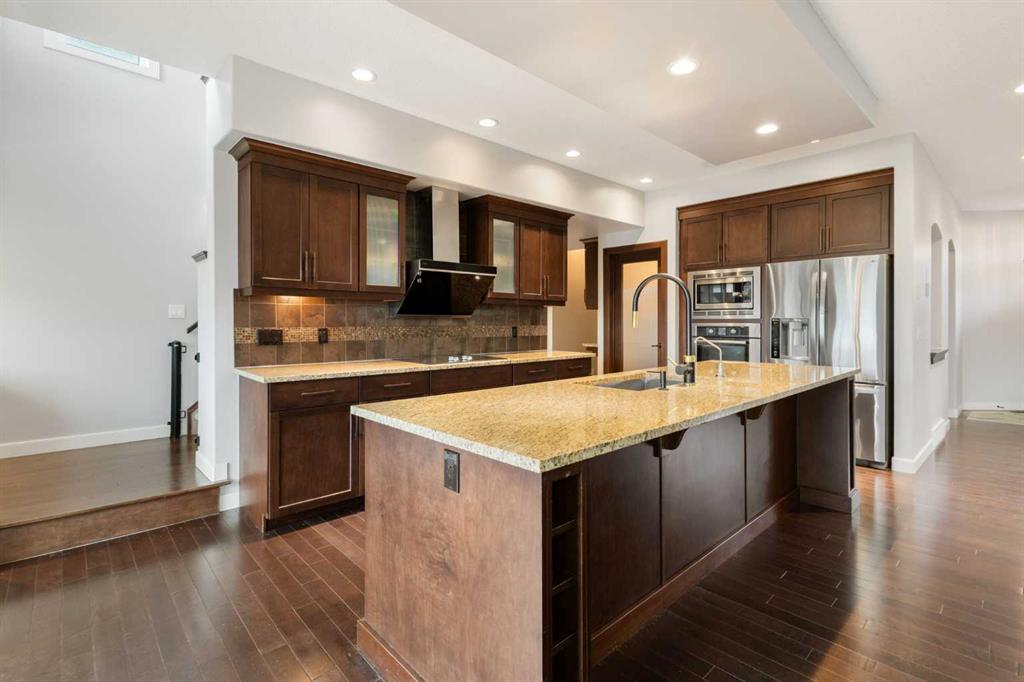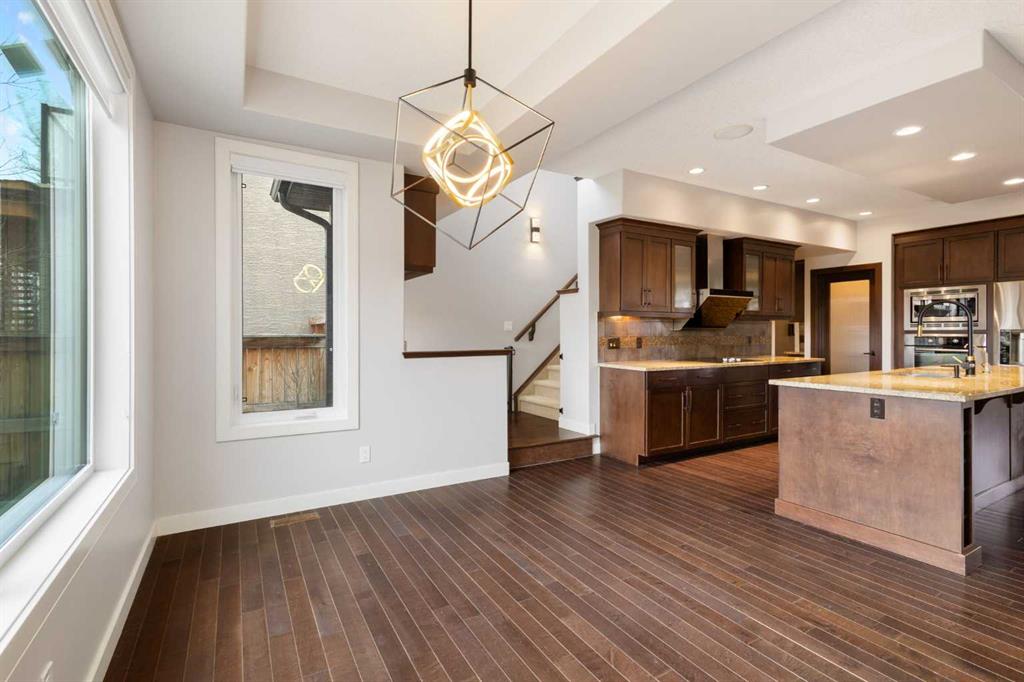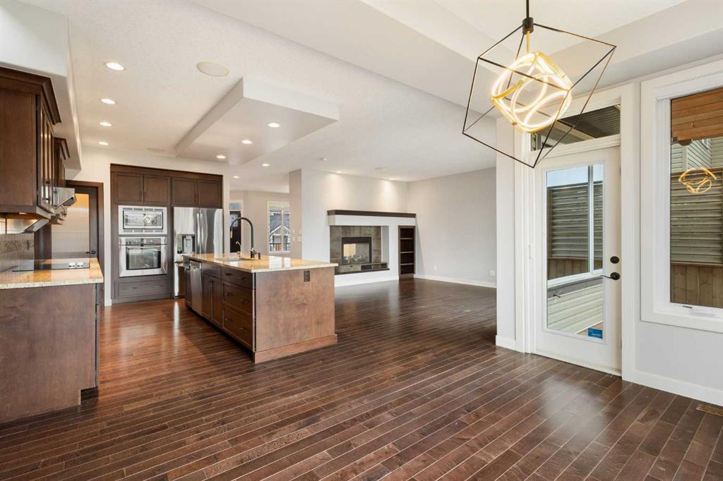 The main floor features a functional layout with separate living and family rooms divided by a fireplace, creating distinct spaces for daily living, hosting guests, or quiet family time. Rich hardwood flooring adds warmth and elegance throughout the main level, while upgraded lighting enhances the home’s bright and refined feel. The kitchen is both stylish and practical, featuring rich dark wood cabinetry, light-toned quartz countertops, stainless steel appliances, and a generous central island with excellent prep space, storage, and casual seating potential. The warm, classic colour palette gives the home a timeless feel, while the layout connects well with the dining and family areas for everyday use and entertaining.