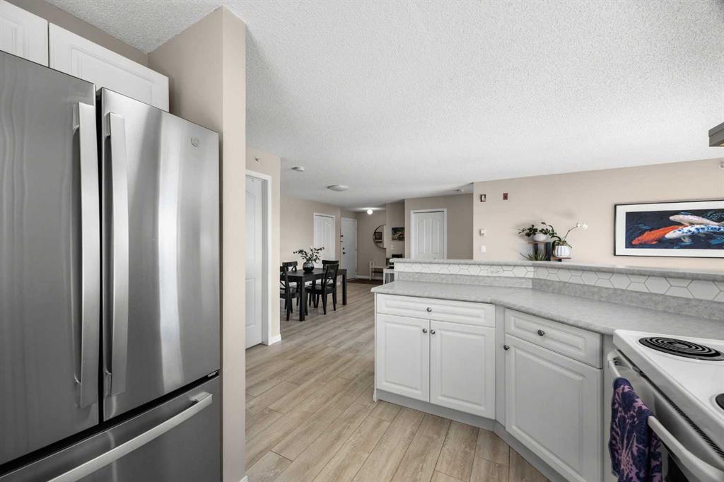 Step inside and be greeted by upgraded Vinyl Plank flooring and a spacious open-concept layout designed for easy everyday living and entertaining. The inviting Living Room is filled with natural light from its South-East-facing windows and enjoys open views toward the nearby greenspace and pathways. Patio doors lead to the private Balcony, where South-West-facing exposure provides an ideal setting to relax, enjoy the sunset, and take in the Rocky Mountain views.