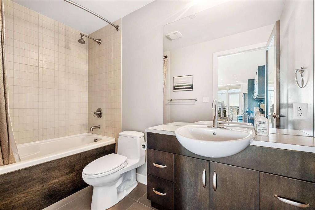The open-concept layout puts every square foot to work – no wasted hallway space. The kitchen features stainless steel appliances, granite countertops, soft-close cabinetry, a built-in wine bar, and updated lighting. Floor-to-ceiling windows and 9-foot ceilings with hardwood floors open directly onto the unit’s standout feature: a massive covered and Astroturfed wraparound patio of nearly 300 sq. ft. with natural gas hookup. Southwest-facing with prolonged sunshine, panoramic mountain and Beltline views, including direct sightline to the Stampede fireworks.