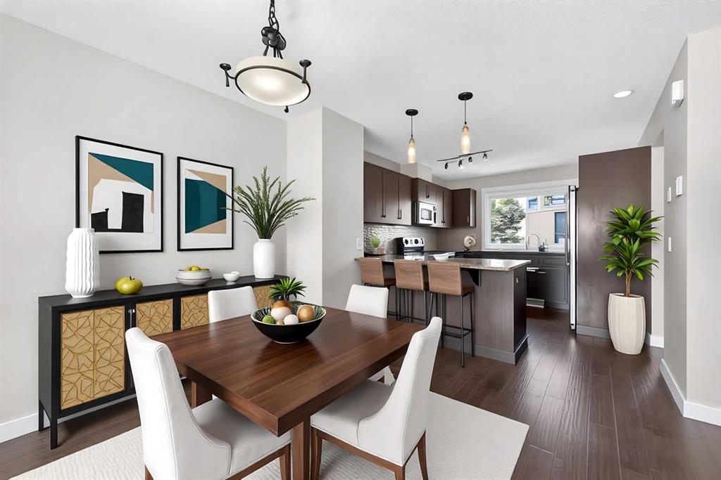 An open concept living room, dining room, and kitchen features engineered hardwood floors and is bathed in natural light. Your new deck just beyond the kitchen is perfect for enjoying a morning coffee or barbecuing and unwinding in the evening.