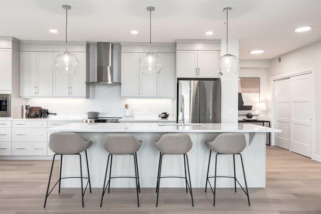 Your new home is set on one of Greenwich’s finest locations, perched atop an exceptional site with mountain, downtown, and WinSport views. The Greenwich shopping district and Farmers’ Market are just a five-minute walk away, and downtown Calgary is only a quick ten-minute drive. Your new MANHATTAN unit, located on the third floor, offers 1,308 sq. ft. (RMS measurement) and 1,469 sq. ft. (architectural measurement) of beautifully designed, single-level living space. This home truly feels like a bungalow in the sky, featuring 2 large bedrooms, a spacious den/office, and 2 full bathrooms. Your home comes complete with a chef-inspired kitchen, spa-style bathrooms, in-suite laundry, custom cabinetry, designer-selected tile, quartz countertops, premium fixtures/finishes, and stainless steel appliances. The MANHATTAN also boasts a large private corner patio with 180-degree views of the WinSport ski slopes, environmental reserve, and the Alberta skyline. Also available are the Lexington B (1,340 sq. ft. architectural measurement) and Liberty (1,304 sq. ft. architectural measurement) floor plans, each offering exceptional living space, larger than most traditional bungalows. Please ask your agent for details on these additional units. 16 West offers a selection of 1 bed, 1 bed + den, 2 bed, and 2 bed + den homes ranging from 564 sq. ft. to 1,469 sq. ft. All floor plans include one titled underground parking stall, along with spacious private patios equipped w/ gas lines for BBQ season. There are 4 designer selection packages to choose from and a plethora of upgrades including but not limited to AC, luxury hard surface flooring, fireplaces and so much more. The Building is not built yet. Construction is tentatively scheduled to begin in Q2/Q3 2026, with completion and possession anticipated in Q3/Q4 2027. Final legal plans and property taxes are yet to be confirmed. RMS based on architectural plans. Photos shown are from Cove Properties’ previous show suites & do not represent the exact units. This is a limited opportunity to secure one of our spacious “bungalow-in-the-sky” homes. Contact your agent today to arrange a visit to our sales centre to review all floor plans, pricing, finishes & upgrades.