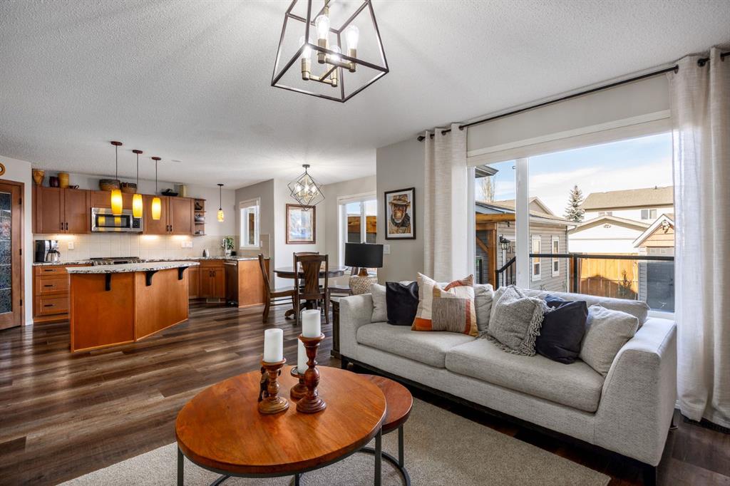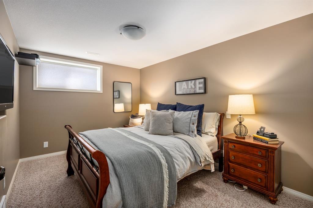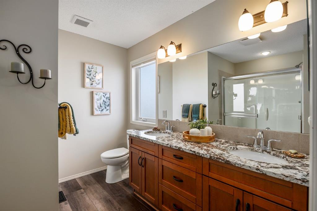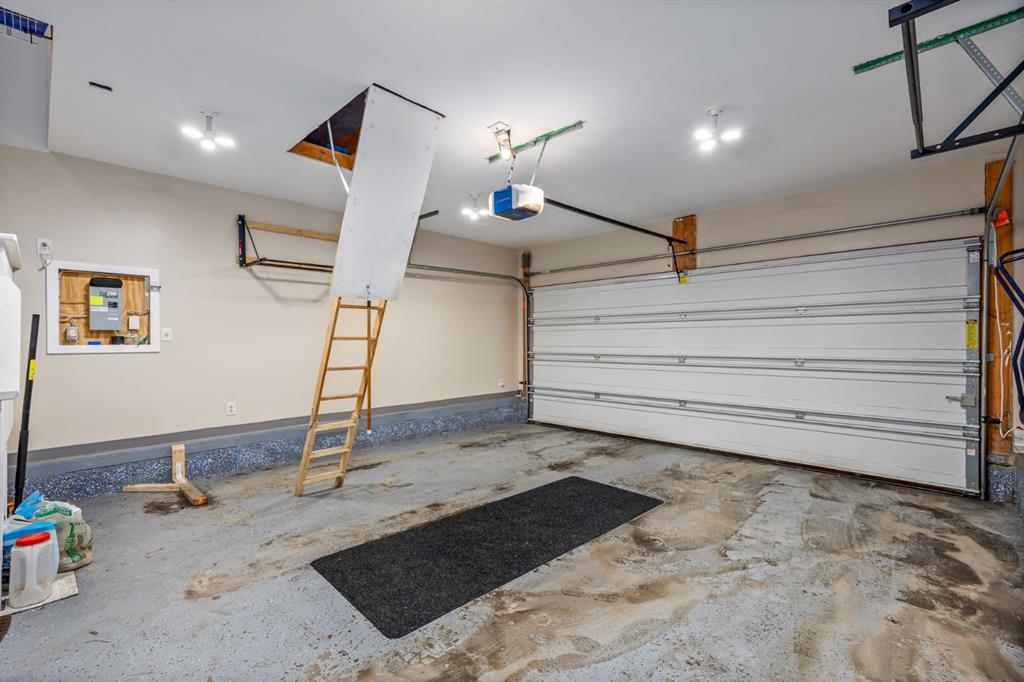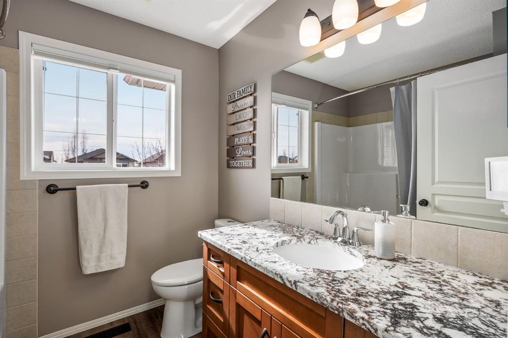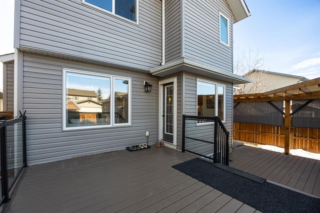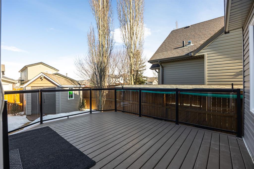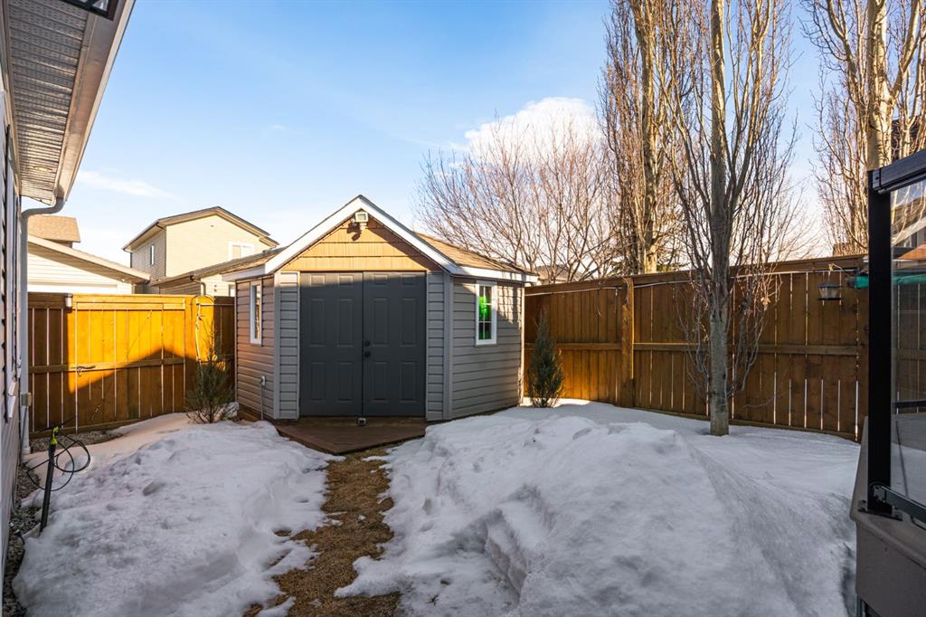 Step inside to a home that immediately feels inviting and thoughtfully finished. Designed for both comfort and everyday living, the space features luxury vinyl plank flooring and plush carpet throughout, paired with timeless granite countertops, Hunter Douglas blinds, and a cozy gas fireplace that anchors the main living area and sets the tone for the home. The kitchen is designed for ease with central vacuum and island kick, while main floor laundry adds everyday convenience. The fully developed basement expands your living space, perfect for movie nights, guests, or a home gym. Comfort and care shine throughout: air conditioning, new hot water tank (2022), new stove (2022), and furnaces that are professionally cleaned regularly with carpets cleaned annually. Storage is abundant with extra attic storage in the garage, plus a Vacuflo system. Step outside and you’ll find a backyard built for all seasons. Enjoy summer evenings on the two-tiered deck with cedar pergola and privacy shades, composite board landings, a propane rough-in for a fire pit on the lower patio, outdoor hot water bib, and hanging plant irrigation. There’s a shed, covered outdoor bicycle storage, and an extended driveway completed in 2024—perfect for extra parking or toys. This is more than a house—it’s a home that’s been loved, upgraded, and meticulously maintained. This beautifully maintained property offers the rare combination of a double attached garage complete with attic storage with a drop-down ladder plus a separate heated, fully finished single detached garage/shop—complete with electrical sub panel, more attic storage, alley access, and even a built-in basketball net on the concrete apron. Whether you’re dreaming of the ultimate man cave, workshop, or hobby space, this 200 sq ft heated shop (built in 2014) delivers. A rare opportunity in one of Airdrie’s most sought-after communities.