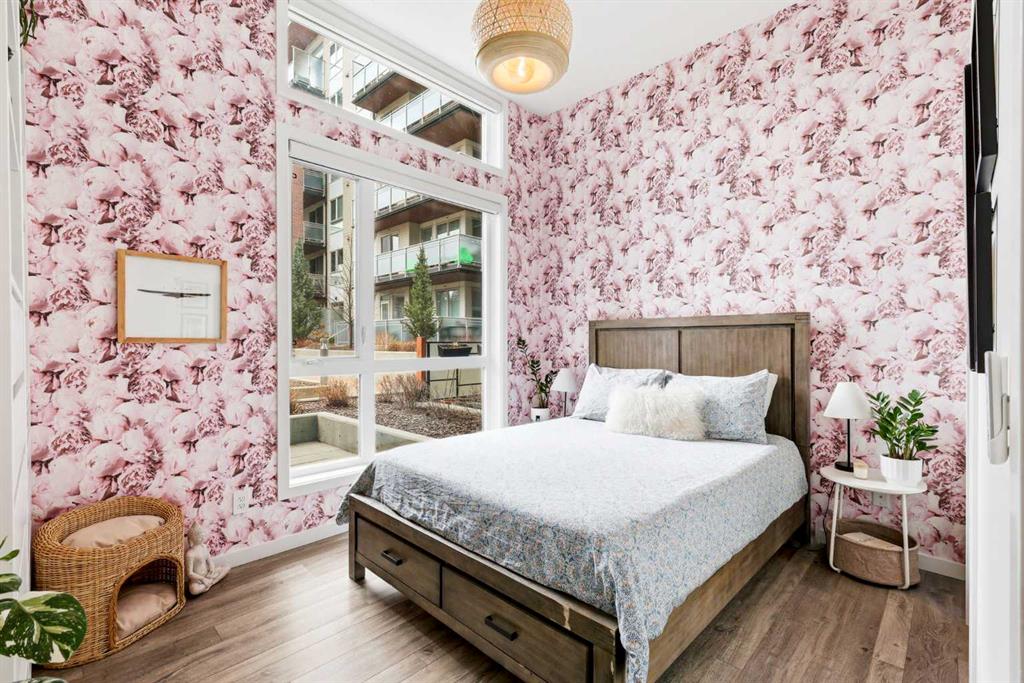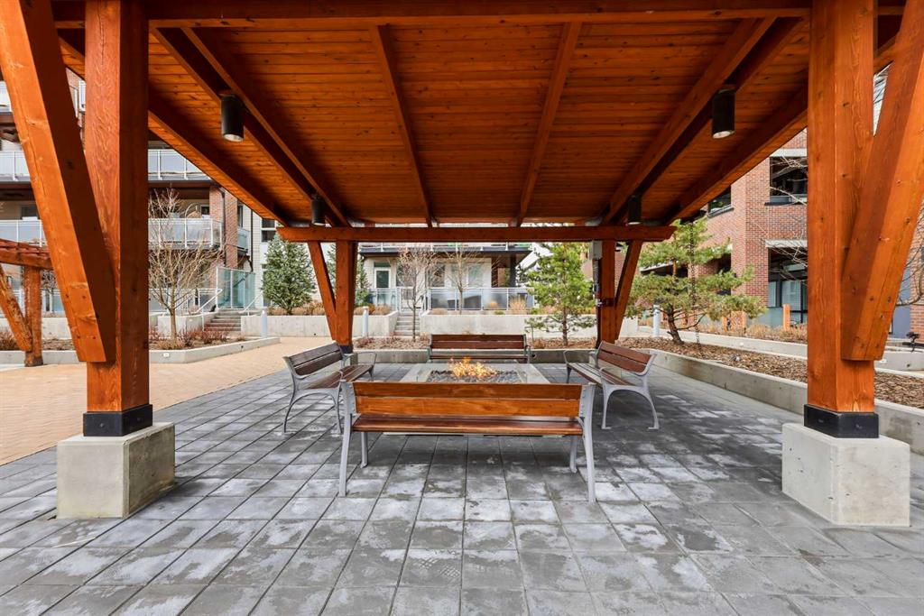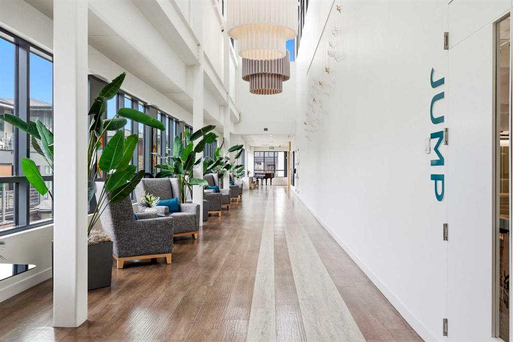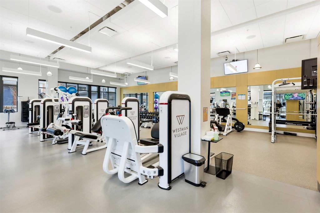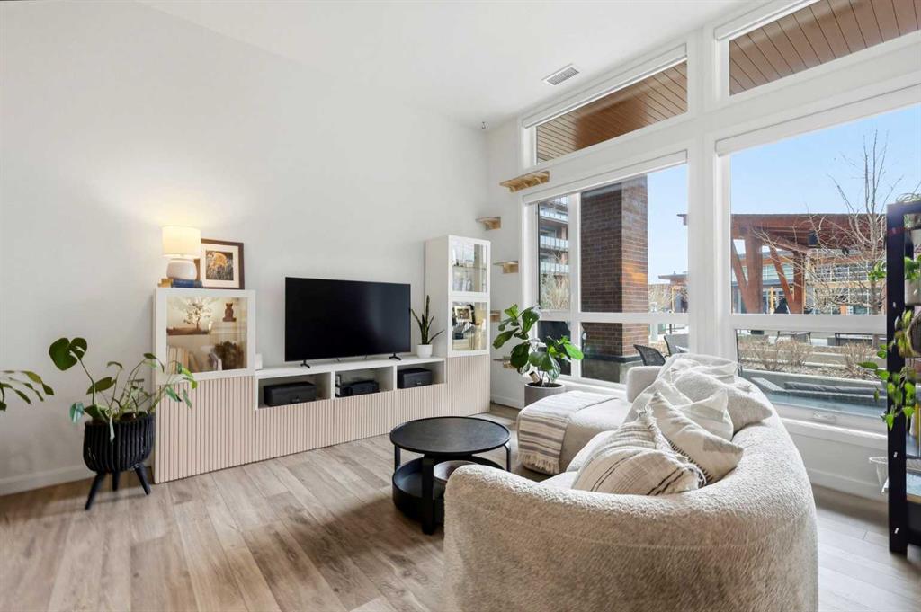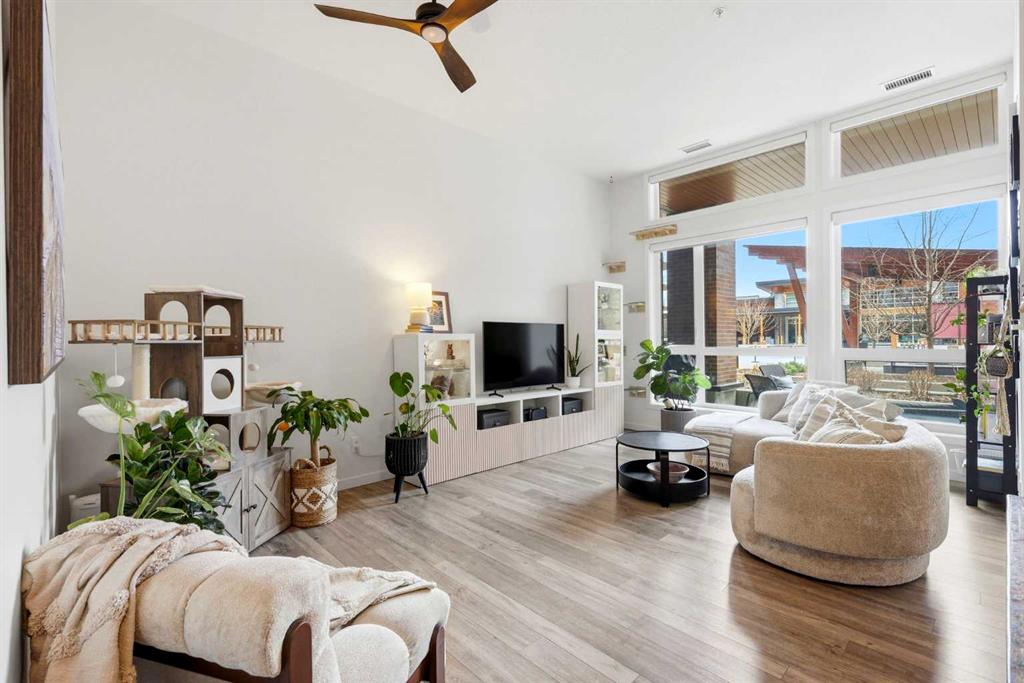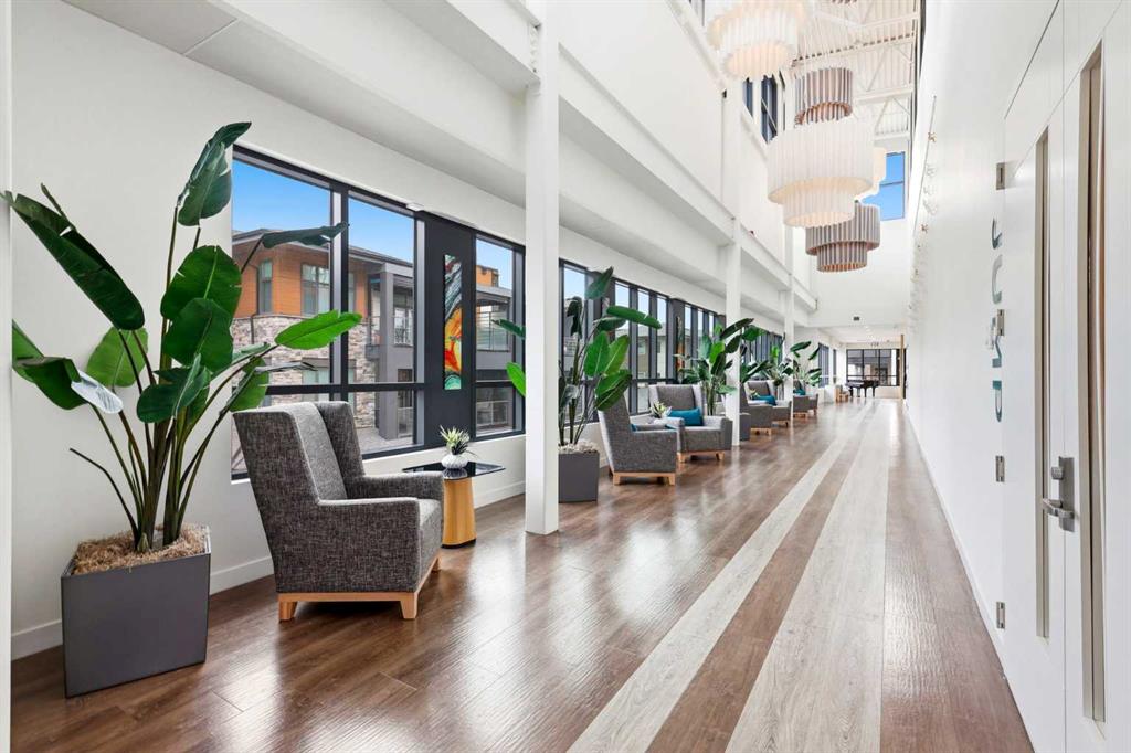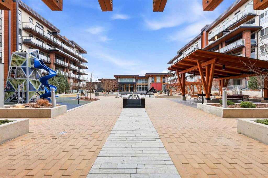 **Open House April 19th 2:00PM-5:00PM** Units like this don’t come up often. This is one of the rare ground floor layouts in Westman Village with its own private entrance, soaring 12 foot ceilings, and oversized windows that flood the space with natural light and make it feel far more like a townhome than a typical condo. The layout is clean and functional with a modern kitchen featuring a large island, sleek cabinetry, and stainless steel appliances that opens directly into the living and dining space, all of it oriented toward the courtyard. The patio is fully covered for year round use and looks into the interior courtyard where you get the sound of the water features and a quiet, private extension of your living space. The bedroom is generous with a walk in closet, there is full size in suite laundry, air conditioning, and titled underground heated parking with additional storage. From a pure livability standpoint, this unit just works. Then you layer in what Westman Village actually is. Full concierge, secure access, and an amenity package that is in a different category than almost anything else in the city. Indoor pool, hot tub, saunas, full fitness center, gymnasium, golf simulator, theatre room, wine vault, workshop, art studio, walking track, library, plus restaurants, café, and everyday essentials right inside the village. You are also just steps to Mahogany Lake with access to pathways, beaches, and everything the community offers. This is one of the few buildings where the condo fees actually make sense because you use what you’re paying for. Whether it’s a young professional, a couple, downsizer, or someone with a pet looking for that private entry setup, this is a rare opportunity to step into a lifestyle that’s hard to replicate anywhere else in Calgary.
