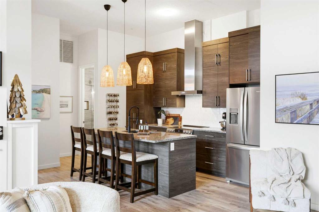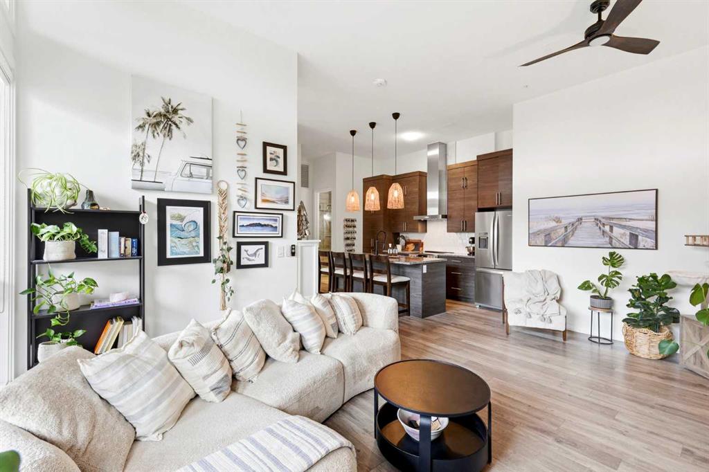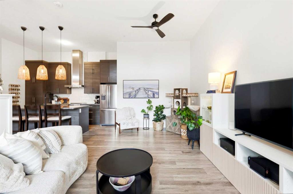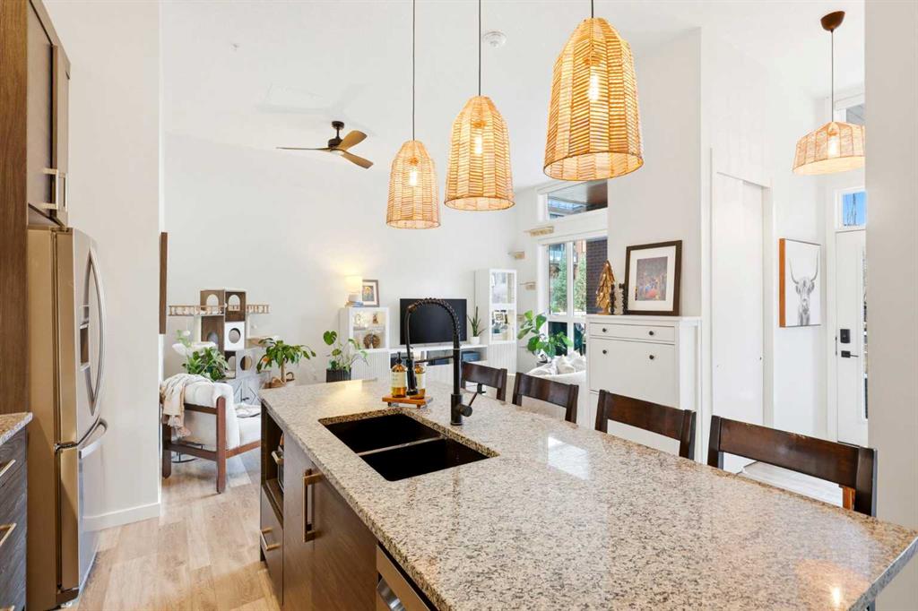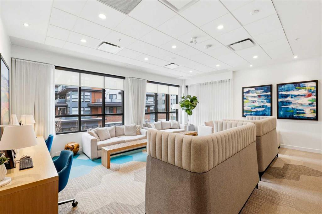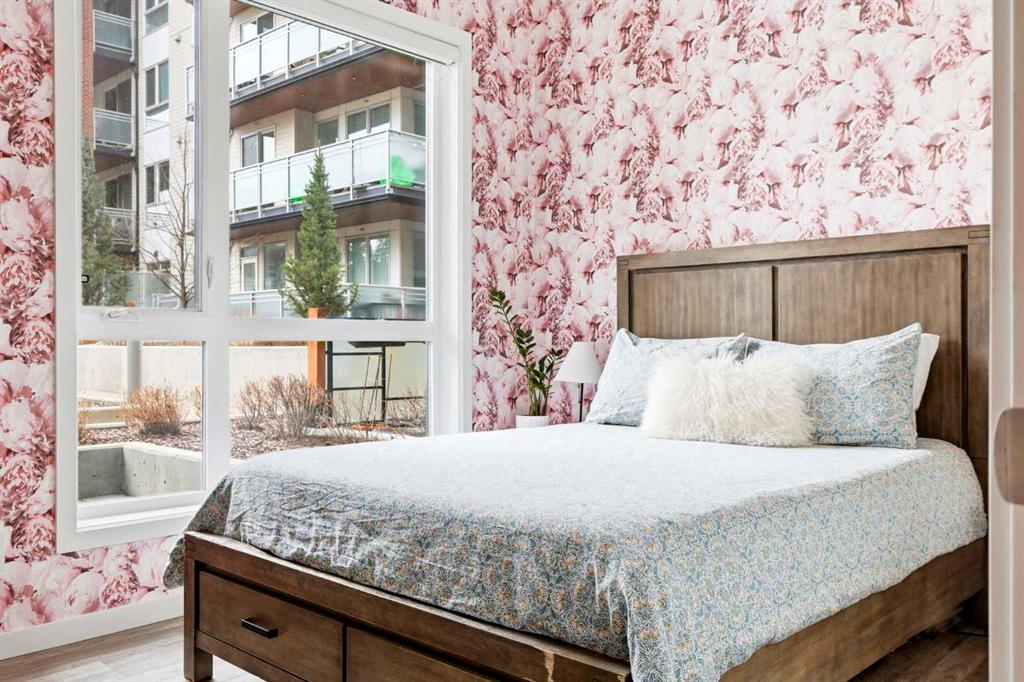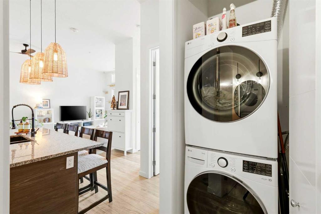 **Open House April 19th 2:00PM-5:00PM** Units like this don’t come up often. This is one of the rare ground floor layouts in Westman Village with its own private entrance, soaring 12 foot ceilings, and oversized windows that flood the space with natural light and make it feel far more like a townhome than a typical condo. The layout is clean and functional with a modern kitchen featuring a large island, sleek cabinetry, and stainless steel appliances that opens directly into the living and dining space, all of it oriented toward the courtyard. The patio is fully covered for year round use and looks into the interior courtyard where you get the sound of the water features and a quiet, private extension of your living space. The bedroom is generous with a walk in closet, there is full size in suite laundry, air conditioning, and titled underground heated parking with additional storage. From a pure livability standpoint, this unit just works. Then you layer in what Westman Village actually is. Full concierge, secure access, and an amenity package that is in a different category than almost anything else in the city. Indoor pool, hot tub, saunas, full fitness center, gymnasium, golf simulator, theatre room, wine vault, workshop, art studio, walking track, library, plus restaurants, café, and everyday essentials right inside the village. You are also just steps to Mahogany Lake with access to pathways, beaches, and everything the community offers. This is one of the few buildings where the condo fees actually make sense because you use what you’re paying for. Whether it’s a young professional, a couple, downsizer, or someone with a pet looking for that private entry setup, this is a rare opportunity to step into a lifestyle that’s hard to replicate anywhere else in Calgary.