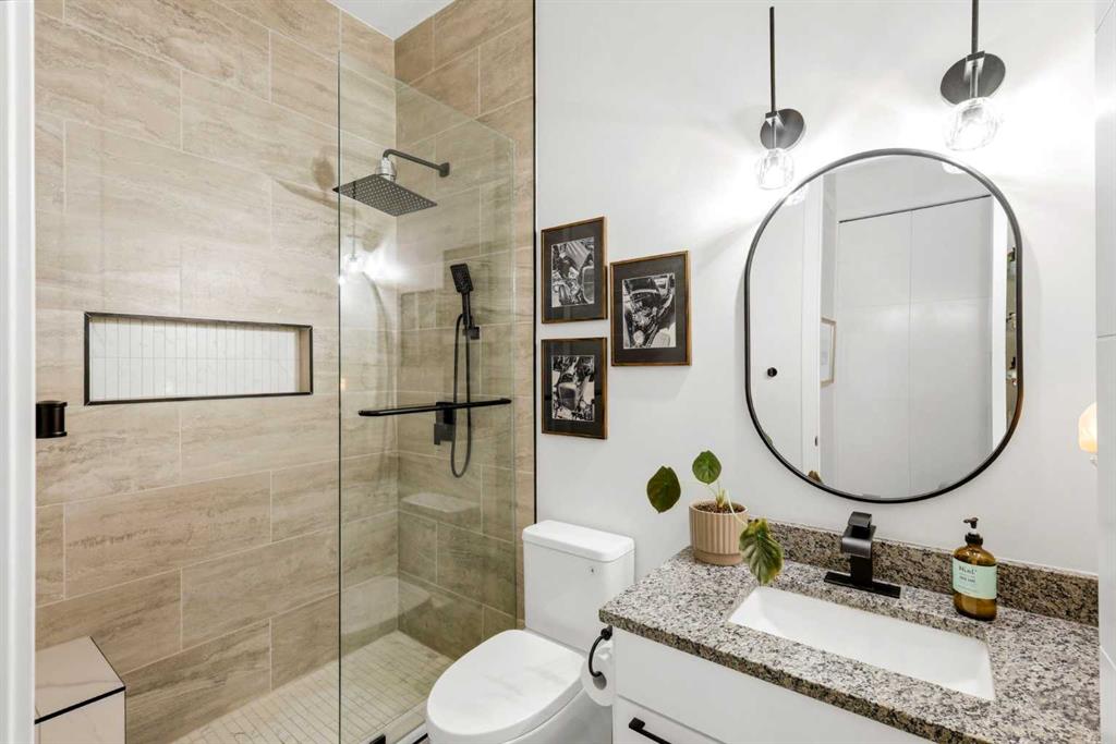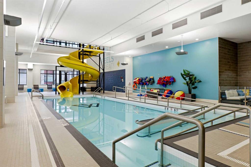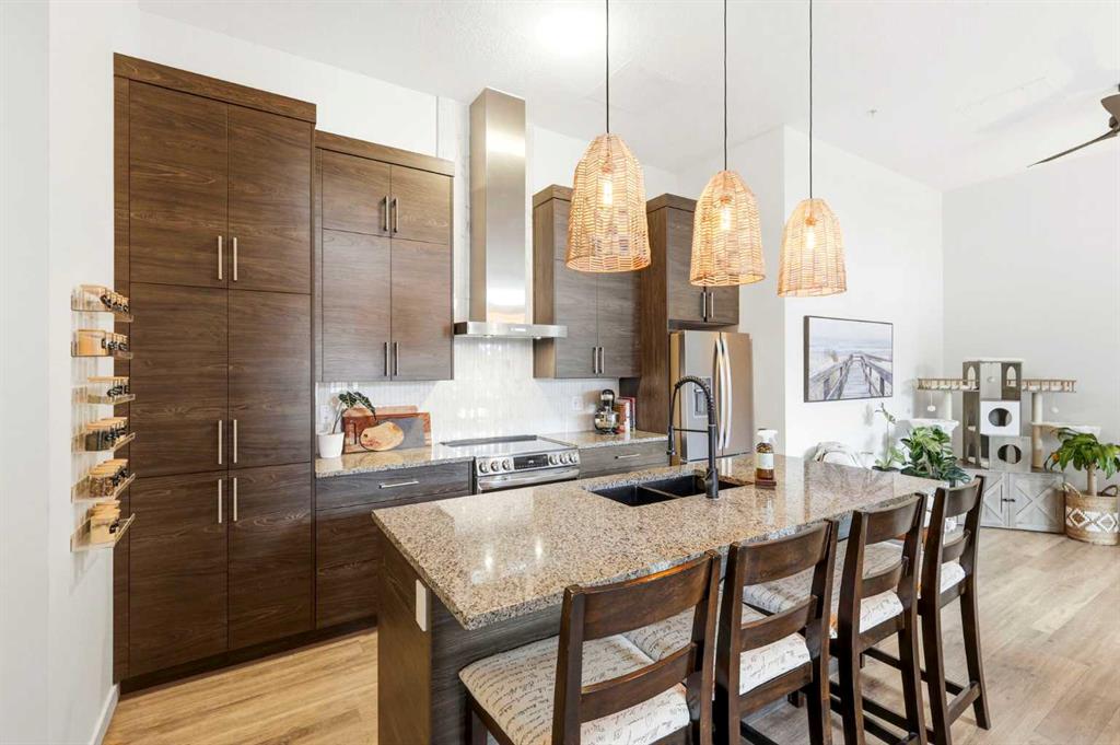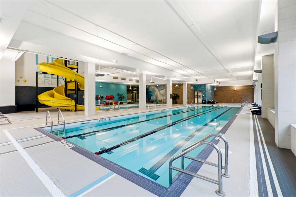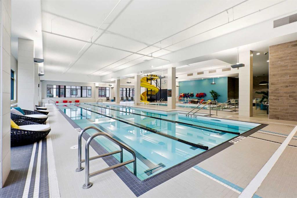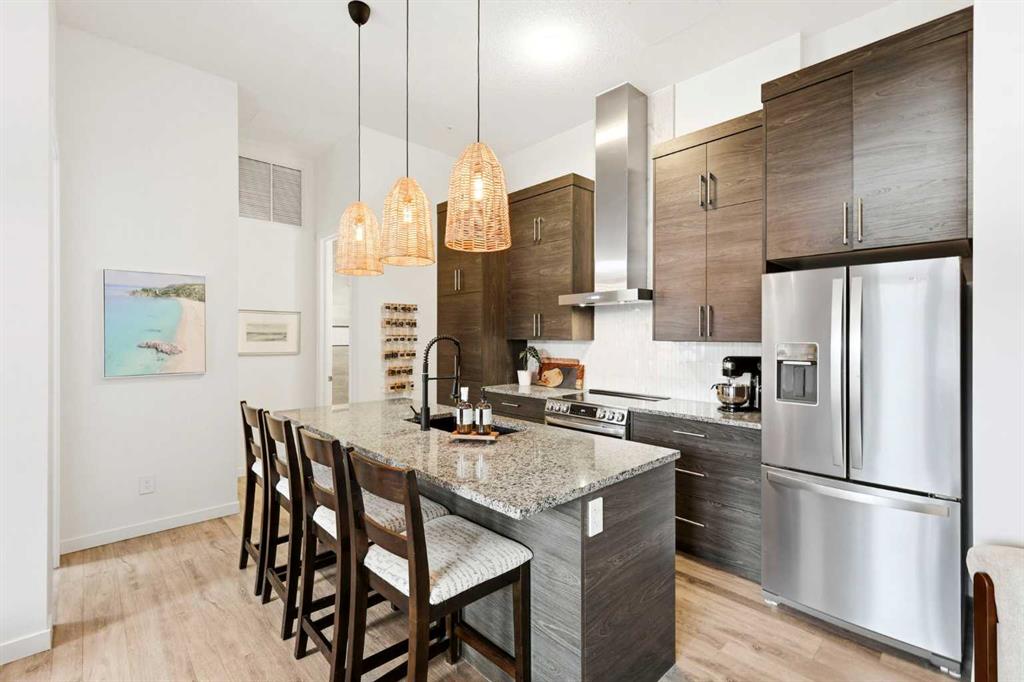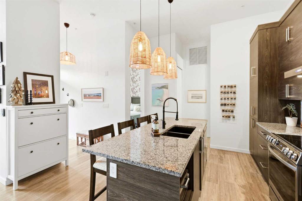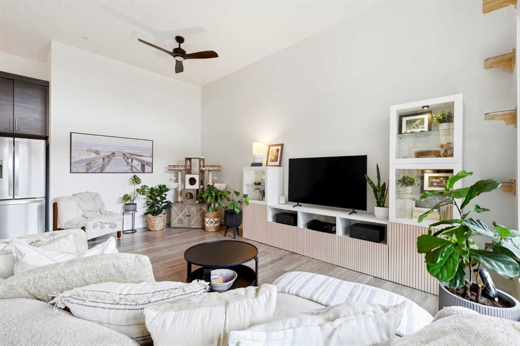 **Open House April 19th 2:00PM-5:00PM** Units like this don’t come up often. This is one of the rare ground floor layouts in Westman Village with its own private entrance, soaring 12 foot ceilings, and oversized windows that flood the space with natural light and make it feel far more like a townhome than a typical condo. The layout is clean and functional with a modern kitchen featuring a large island, sleek cabinetry, and stainless steel appliances that opens directly into the living and dining space, all of it oriented toward the courtyard. The patio is fully covered for year round use and looks into the interior courtyard where you get the sound of the water features and a quiet, private extension of your living space. The bedroom is generous with a walk in closet, there is full size in suite laundry, air conditioning, and titled underground heated parking with additional storage. From a pure livability standpoint, this unit just works. Then you layer in what Westman Village actually is. Full concierge, secure access, and an amenity package that is in a different category than almost anything else in the city. Indoor pool, hot tub, saunas, full fitness center, gymnasium, golf simulator, theatre room, wine vault, workshop, art studio, walking track, library, plus restaurants, café, and everyday essentials right inside the village. You are also just steps to Mahogany Lake with access to pathways, beaches, and everything the community offers. This is one of the few buildings where the condo fees actually make sense because you use what you’re paying for. Whether it’s a young professional, a couple, downsizer, or someone with a pet looking for that private entry setup, this is a rare opportunity to step into a lifestyle that’s hard to replicate anywhere else in Calgary.