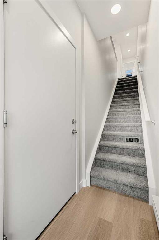 The main living level features a bright open-concept layout enhanced by luxury vinyl plank flooring and large windows that fill the space with natural light. The kitchen offers both style and functionality with quartz countertops, sleek cabinetry, modern appliances, and a convenient breakfast bar, providing ample prep space for everyday cooking or entertaining. The adjacent dining area flows seamlessly into the comfortable living room, creating a welcoming environment for relaxing or hosting guests. A convenient 2-piece powder room completes this level. Step outside to the private balcony, perfect for enjoying fresh air or morning coffee.
