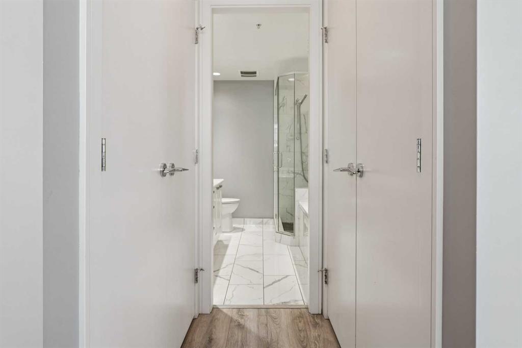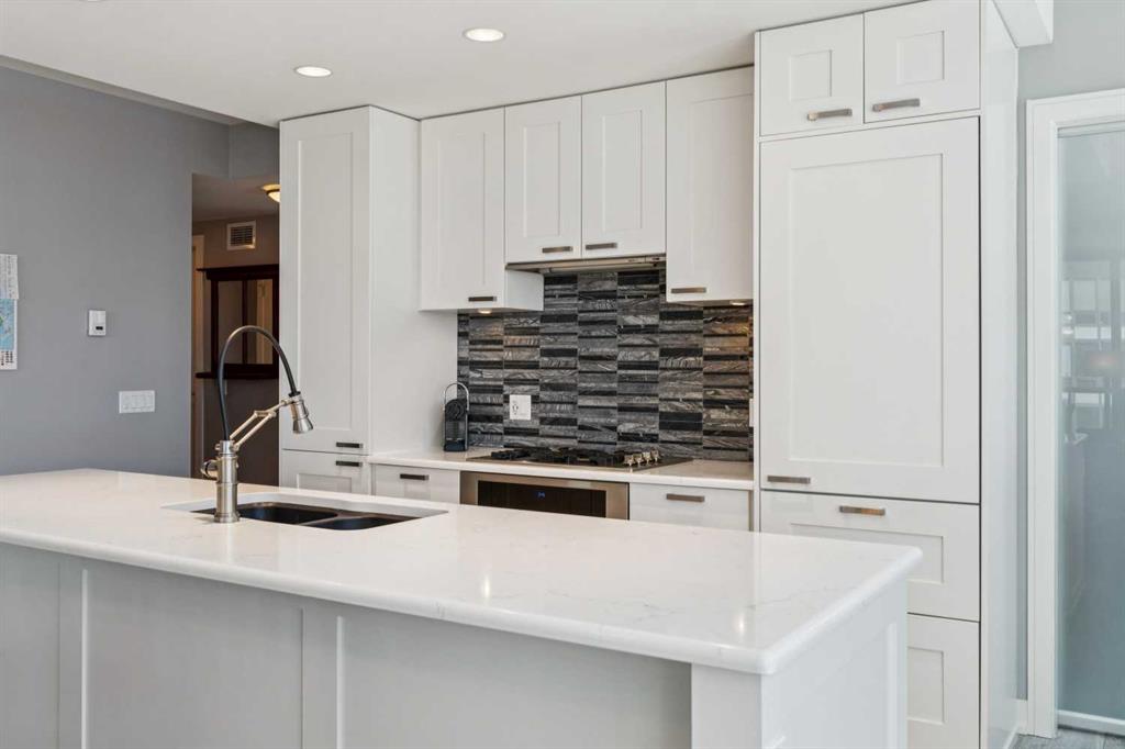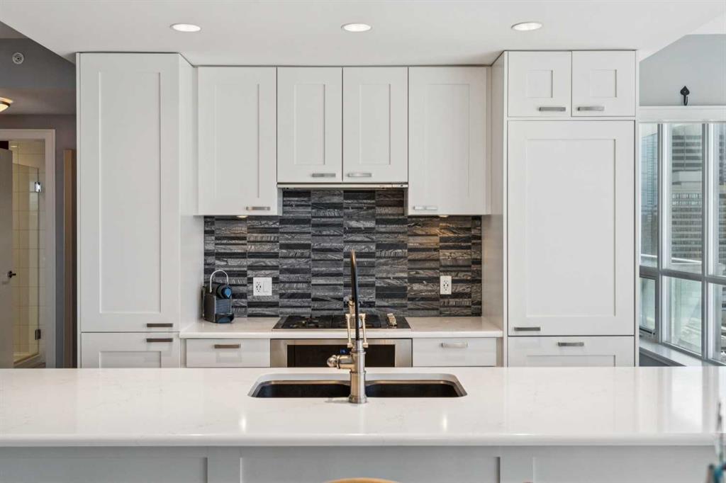 Sky-High Luxury Living in the Waterfront! Prime northwest corner location with spectacular views of Prince’s Island Park, Bow River, mountains, COP and the downtown city lights! The many large expansive corner windows provide an abundance of bright natural light while enhancing those incredible views from every room! Exceptional open floor plan that’s perfect for entertaining and great layout with opposite side bedrooms for complete privacy! Completely renovated kitchen, bathrooms, flooring and UV-Coated windows all in 2018. Immaculate home with gorgeous hardwood flooring, quartz counter-tops throughout, soft-close kitchen drawers, custom Hunter Douglas blinds and tasteful recessed lighting! You’ll be sure to enjoy the large covered balcony with incredible views, natural-gas fireplace, 5 pce ensuite bath with soaker tub and rain shower, custom closet organizers, separate office-den, open kitchen with large eat-in Island, gas range, 2 built-in freezer drawers, brand new dishwasher and microwave, separate laundry room with storage, high-end stack washer/dryer and spacious entrance to greet your guests. Comes with 2 very convenient SXS parking stalls across from elevator doors and storage locker in secure storage room. The luxurious Waterfront towers provide first-class amenities with concierge service, impressive lobby with comfortable seating area, fully equipped fitness center, hot tub area, steam room, yoga studio, social lounge with billiard table, awesome Theater room, private inner courtyard and car wash facilities! The location is extraordinary along the south bank of the Bow River next to Prince’s Island Park, world-class pathway system, near by shops and boutiques, great restaurants and cafes, Chinese Cultural Center and quick access to transportation and the LRT. Time to enjoy the ultimate in downtown urban living!
