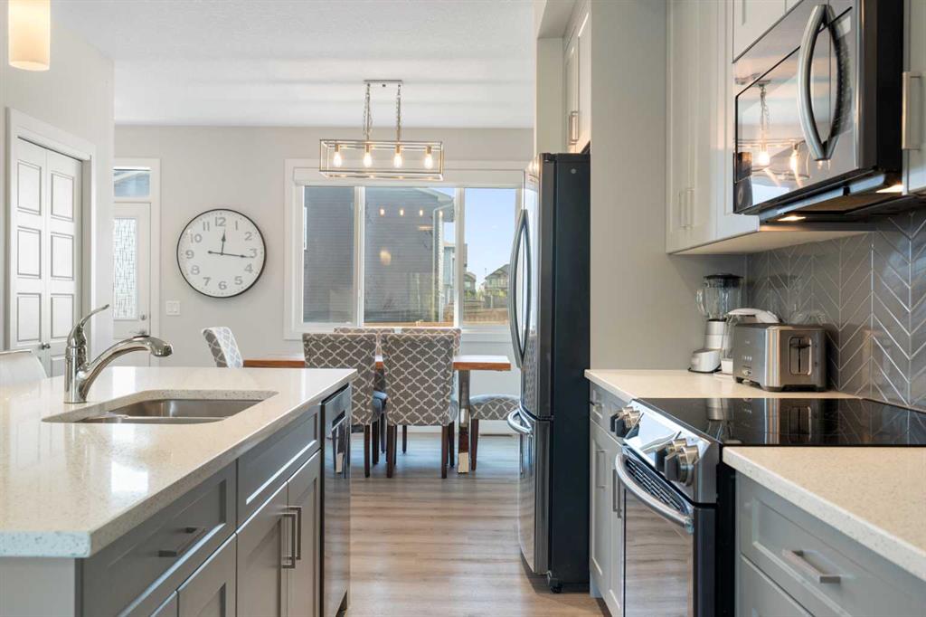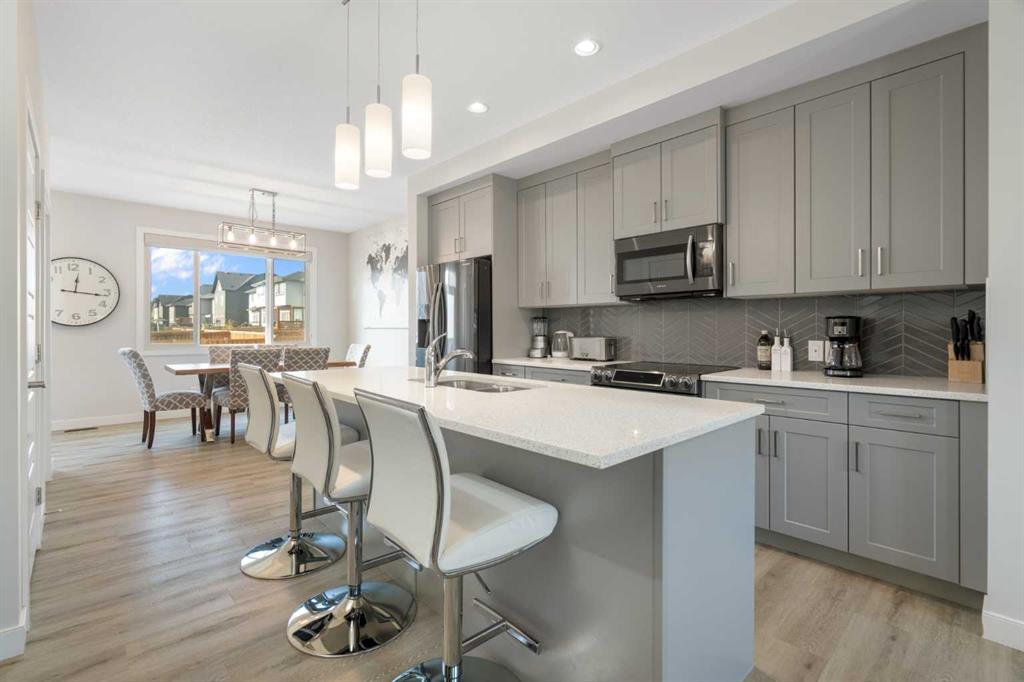 The home features a bright, open-concept layout with upgraded luxury vinyl plank flooring and a contemporary colour palette. The spacious kitchen is equipped with stainless steel appliances, quartz countertops in both the kitchen and bathrooms, and plenty of cabinetry for storage. The main floor flows seamlessly from kitchen to dining to living space, creating the perfect environment for everyday living and entertaining.