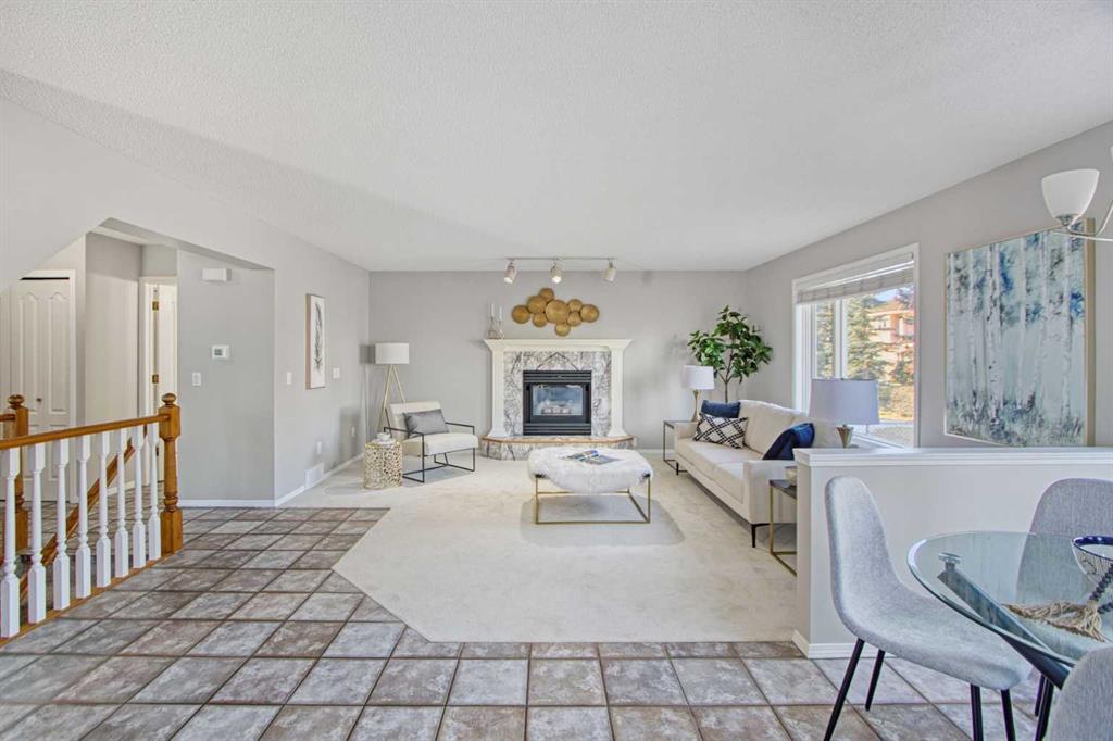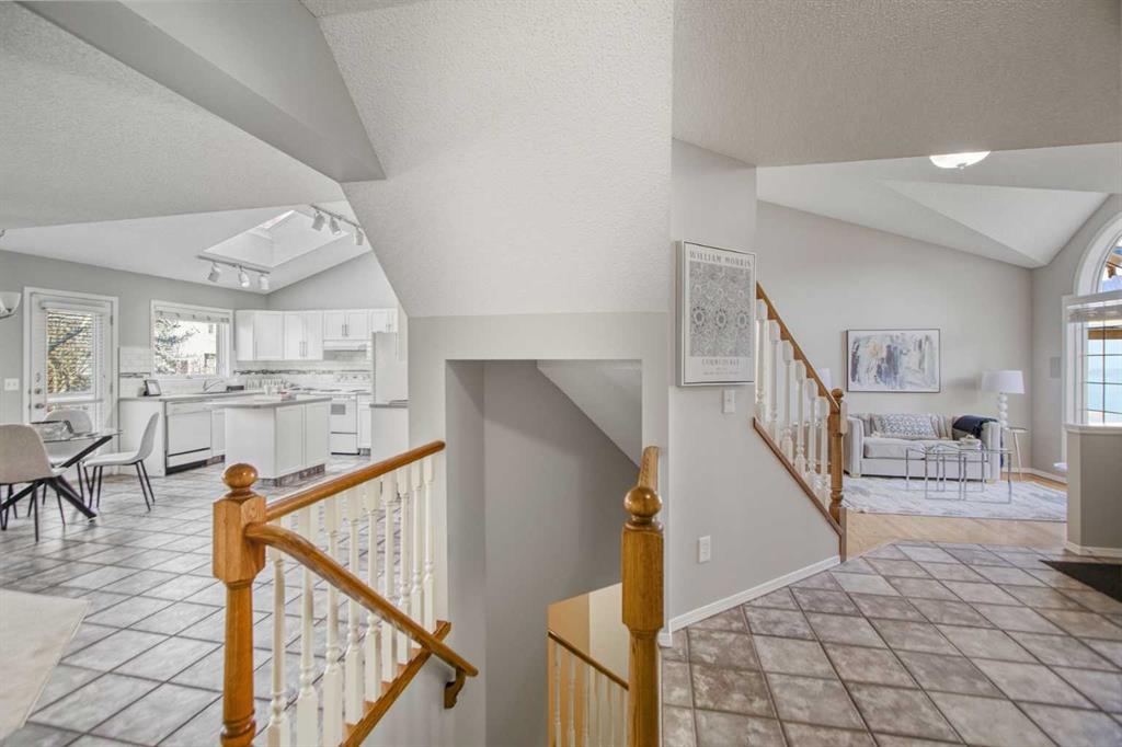 ** Step inside and you’re welcomed by a bright, airy main floor featuring a vaulted living room and dining area, a large tiled front entrance, and a sweeping staircase leading to the upper level.