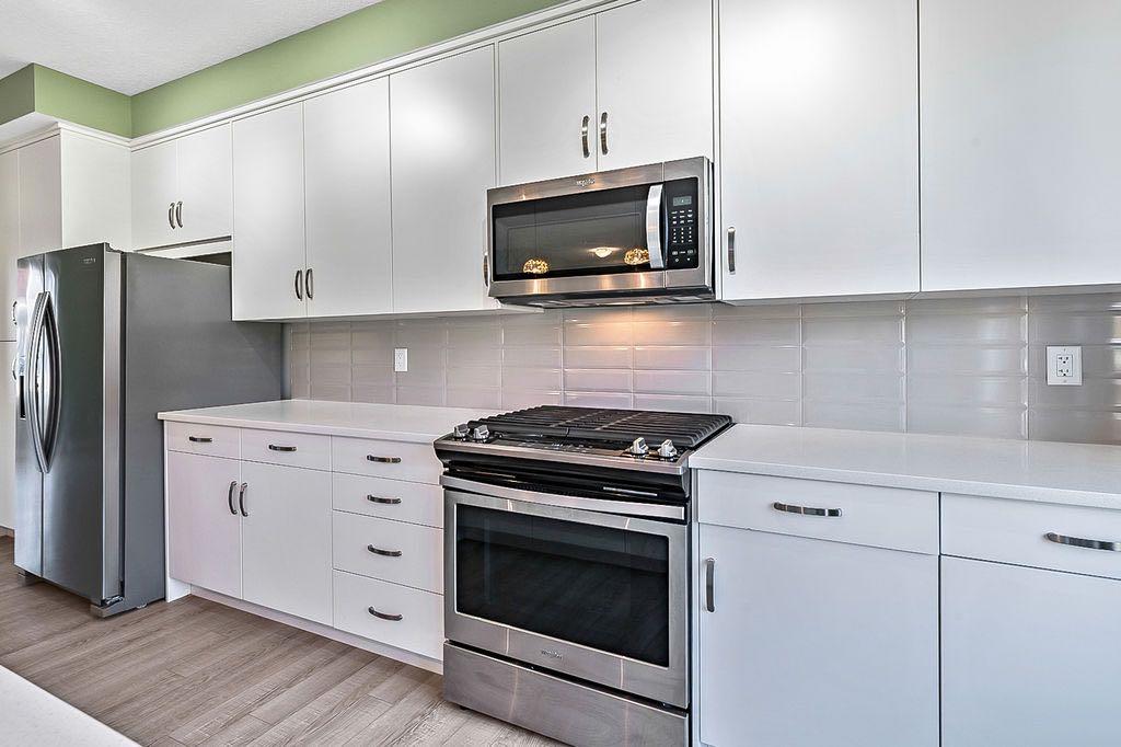 The upper level boasts a three-bedroom layout, including a spacious master bedroom with a walk-in closet and a private three-piece en suite. A convenient laundry area is also located on this level. The modern kitchen is equipped with quartz countertops and stainless steel appliances, combining style and functionality.