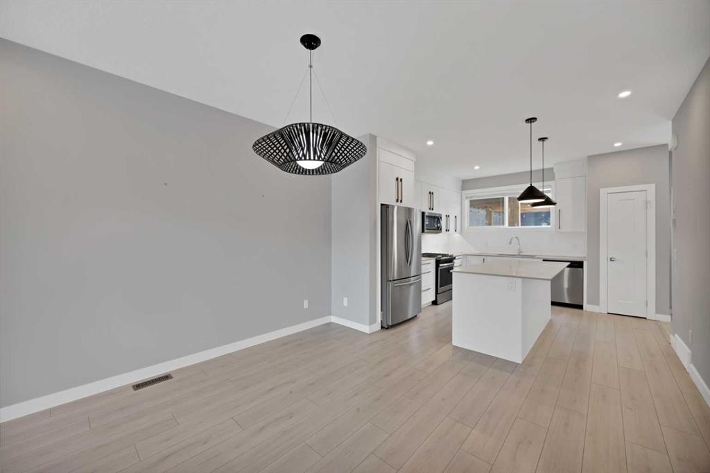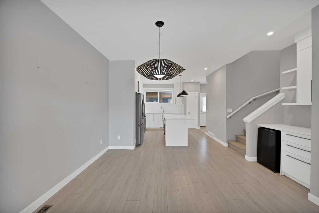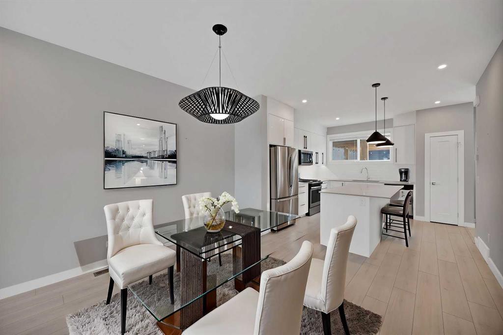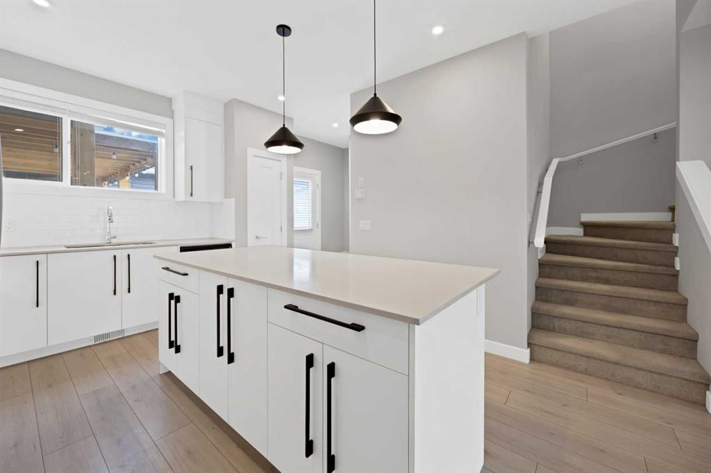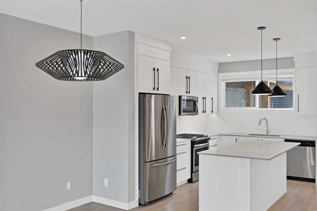 Welcome home to this stunning duplex with oversized detached GARAGE and covered large covered deck that perfectly blends modern elegance with functional design. This beautifully crafted home offers approximately 1,700 sq. ft. of living space perfectly blending comfort, style, and functionality. Built in 2022, this property is ideal for families looking for modern finishes and a thoughtfully designed layout. The main floor features an open-concept design with a spacious living and dining area. The stunning kitchen includes quartz countertops, a gas range, dual sink with a window, ample cabinetry, and a walk-in pantry. A custom-built bar adds a unique touch, making it perfect for entertaining. A convenient half bathroom completes the main level. Upstairs, you’ll find three bedrooms and two full bathrooms, including a luxurious primary suite featuring a tray ceiling, 5-piece ensuite with elegant ceramic tile and 10 mm glass shower. The bathrooms also include full-height mirrors for a sleek and modern look. Two additional bedrooms share another beautifully finished full bathroom with ceramic tile. A conveniently located laundry room, equipped with upgraded front-load washer and dryer, adds both comfort and practicality to your daily routine.Step outside to enjoy a large covered deck, a zero-maintenance backyard, and an oversized detached garage with convenient back alley access, offering plenty of space for parking and storage. The unfinished basement is ready for your creative ideas and features two windows, and a bathroom rough-in, providing excellent potential for future development. Some photos have been virtually staged. Conveniently located just minutes from major amenities, shopping, schools, green spaces, and Chestermere Lake, this home offers the perfect balance of suburban comfort and urban convenience. Book your private showing today…