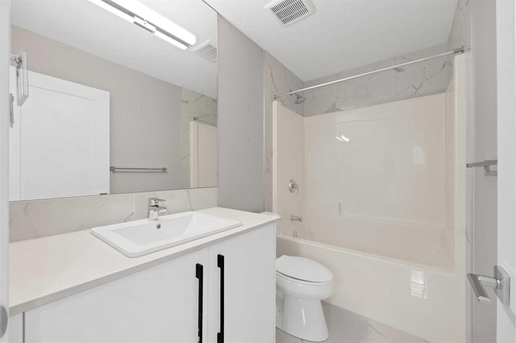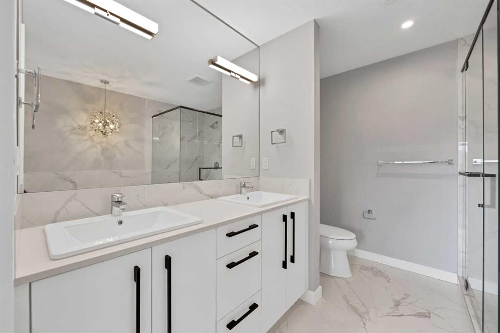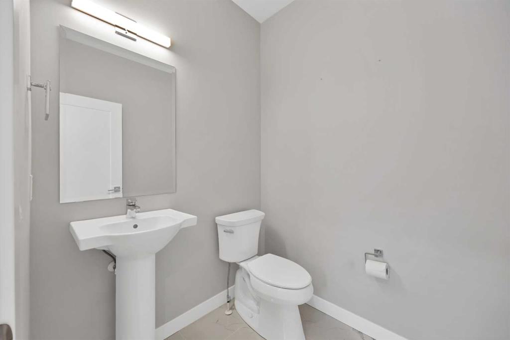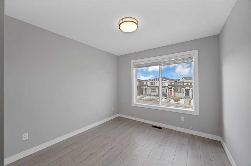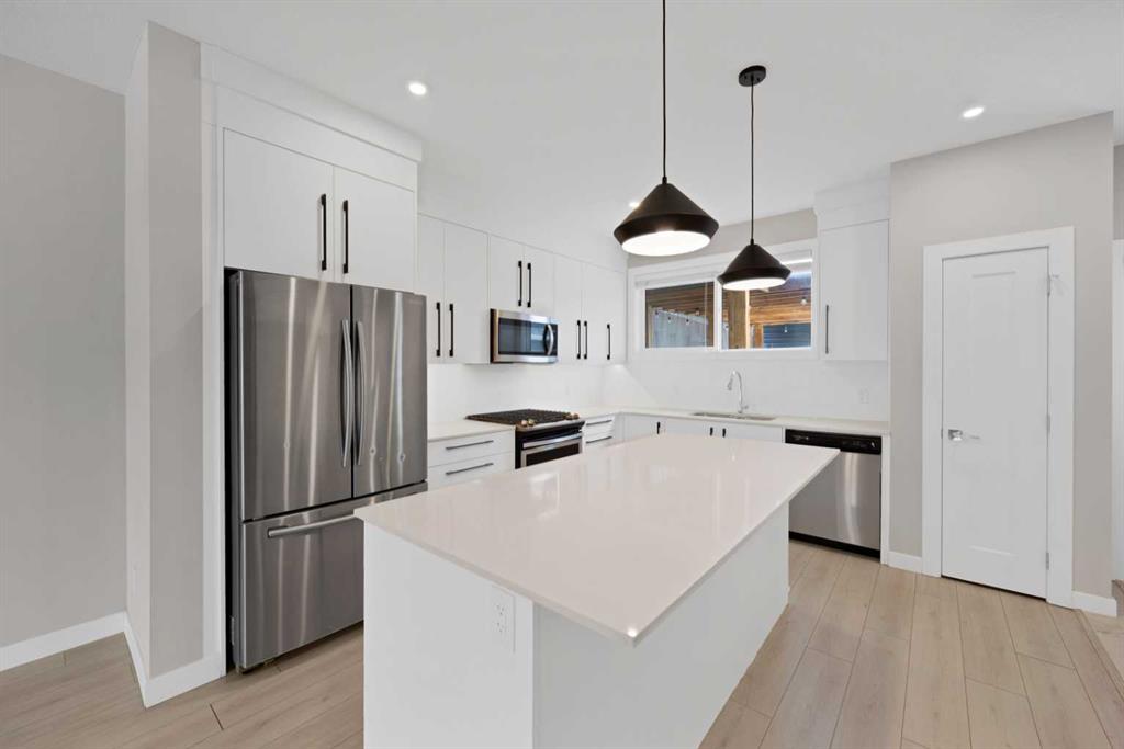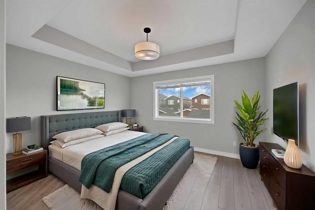 Welcome home to this stunning duplex with oversized detached GARAGE and covered large covered deck that perfectly blends modern elegance with functional design. This beautifully crafted home offers approximately 1,700 sq. ft. of living space perfectly blending comfort, style, and functionality. Built in 2022, this property is ideal for families looking for modern finishes and a thoughtfully designed layout. The main floor features an open-concept design with a spacious living and dining area. The stunning kitchen includes quartz countertops, a gas range, dual sink with a window, ample cabinetry, and a walk-in pantry. A custom-built bar adds a unique touch, making it perfect for entertaining. A convenient half bathroom completes the main level. Upstairs, you’ll find three bedrooms and two full bathrooms, including a luxurious primary suite featuring a tray ceiling, 5-piece ensuite with elegant ceramic tile and 10 mm glass shower. The bathrooms also include full-height mirrors for a sleek and modern look. Two additional bedrooms share another beautifully finished full bathroom with ceramic tile. A conveniently located laundry room, equipped with upgraded front-load washer and dryer, adds both comfort and practicality to your daily routine.Step outside to enjoy a large covered deck, a zero-maintenance backyard, and an oversized detached garage with convenient back alley access, offering plenty of space for parking and storage. The unfinished basement is ready for your creative ideas and features two windows, and a bathroom rough-in, providing excellent potential for future development. Some photos have been virtually staged. Conveniently located just minutes from major amenities, shopping, schools, green spaces, and Chestermere Lake, this home offers the perfect balance of suburban comfort and urban convenience. Book your private showing today…