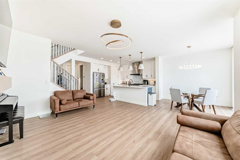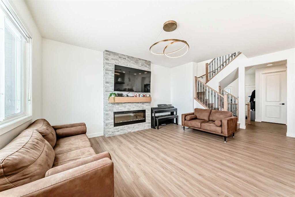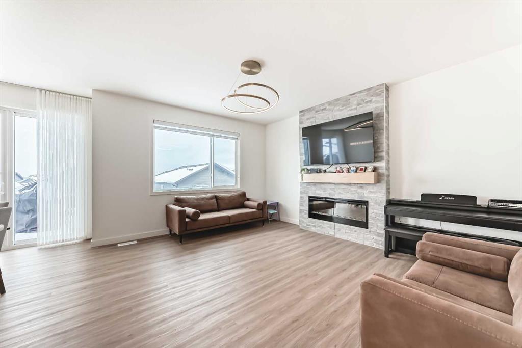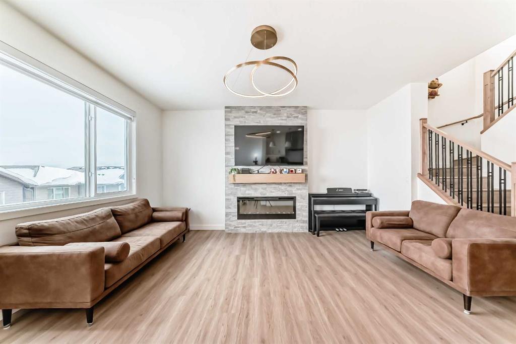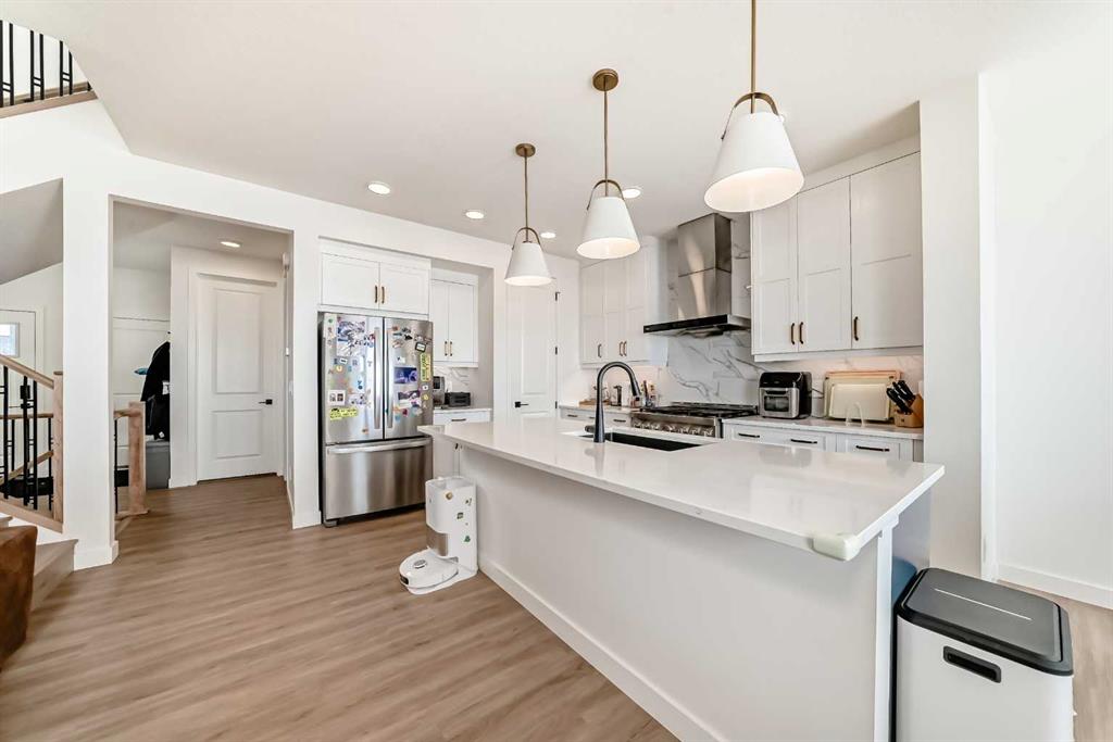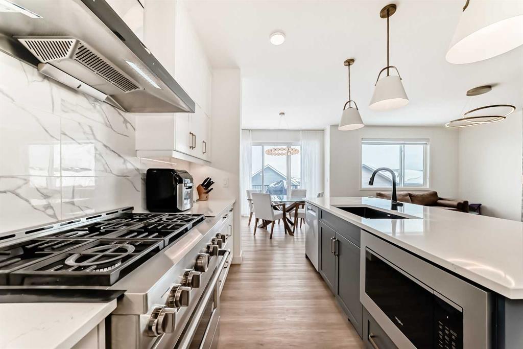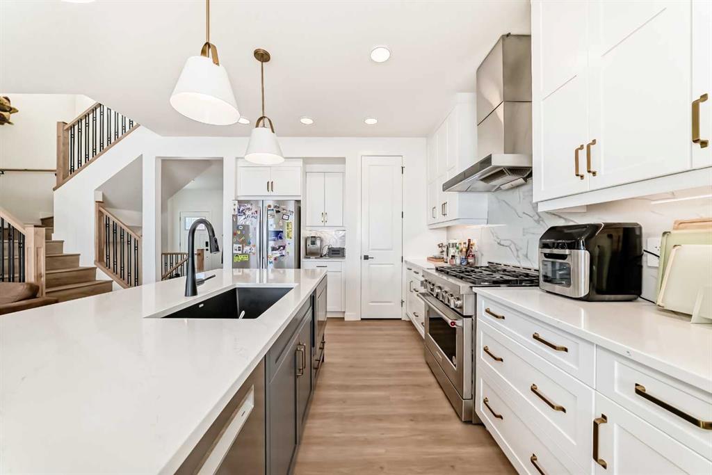 Welcome to this beautifully upgraded walkout home in the highly desirable, family-friendly community of Vermilion Hill in Alpine Park. Offering over 2,100 sq.ft. of thoughtfully designed living space, this home features over $150,000 in upgrades and showcases quality finishes throughout, including full flooring upgrades, upgraded lighting, and full-height lacquered kitchen cabinetry with adjustable LED cabinet lighting. The bright and spacious main level is filled with natural light and features a cozy fireplace, a stunning quartz island with sink and gold accents, high-end stainless steel appliances, a 36″ KitchenAid cooktop with 23,000 BTU, a 36″ 1300 CFM hood fan, Bosch 800 Series dishwasher, and a 3-piece bathroom. The dining and living area opens to a large rear deck, perfect for entertaining or relaxing outdoors. Upstairs, including the generous bonus room, convenient laundry, two additional good-sized bedrooms, a full 5-piece bathroom, and a spacious primary retreat with a luxurious 5-piece ensuite, and beautiful views of downtown and the Rocky Mountains. The 9-ft walkout basement offers excellent future potential. Additional features include a whole-home water softener and fully completed landscaping with concrete walkway and patio. Conveniently located close to schools, shopping, transit, and amenities, this exceptional home is one you do not want to miss.