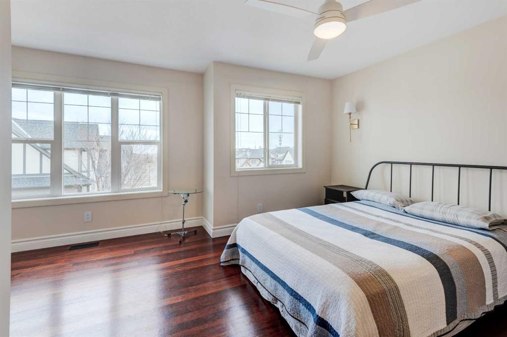 Welcome home to this 4-level split end unit townhome offering a unique & functional layout with great views! This bright & open home features a main living area with soaring 12.5-foot ceilings, large windows that flood the space with natural light & a gas fireplace with a floor-to-ceiling stone façade. The island kitchen is finished with white quartz countertops & white cabinetry & opens to a generous dining area overlooking green space & a playground. This home features a desirable dual primary bedroom layout, with both bedrooms offering full ensuites, walk-in closets, & cozy seating nooks. The main primary retreat also enjoys views of the pond. The fully finished fourth level provides a versatile space ideal for a family room or home theatre, along with plenty of additional storage. Exotic Merbau hardwood flooring runs throughout the home, adding warmth & character. Enjoy the low-maintenance outdoor space with composite decking & a fully fenced yard. Complete with a double attached garage. Ideally located with easy access to Stoney Trail & Macleod Trail, & close to shopping, schools, playgrounds, coffee shops, & everyday amenities. Just minutes from Fish Creek Park. You’ll love living here!