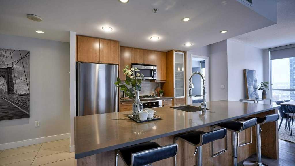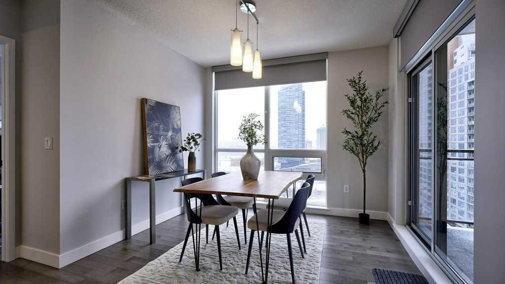 Panoramic city skyline views surround this sleek 14th-floor corner residence, featuring expansive floor-to-ceiling windows with custom blinds and a contemporary 2-bed, 2-bath layout. Freshly painted from top to bottom, including all trim and baseboards, for a crisp, move-in-ready finish. Step into a generous entryway with rich hardwood floors that extend into the bright, open-concept living space. The modern kitchen features extensive cabinetry with convenient pull-out shelves, sleek stainless steel appliances, and elegant quartz countertops. The kitchen flows seamlessly into the sun-filled living room and open dining area, which extends onto a glass-railed balcony offering uninterrupted city views. Thoughtfully designed with bedrooms on opposite sides, this layout ensures maximum privacy. The primary suite offers a spacious walkthrough closet and a luxurious 5-piece ensuite complete with double sinks, a deep soaker tub, and an oversized shower. The second bedroom provides two closets and a stylish 3-piece ensuite featuring a fully tiled shower and contemporary vanity. The flex room offers versatility as a den, home office (with cable and electrical outlets), or generous in-suite storage. Convenient in-suite laundry includes a Bosch washer and dryer. Residents of Nova enjoy a wealth of amenities: a state-of-the-art fitness Centre, inviting social room, guest suites, secure bike storage, 24-hour concierge/security, and a beautifully maintained outdoor garden on the second floor. The pet-friendly location is exceptional—Co-op and Tim Hortons are right across the street, the C-Train is just three blocks away, and 17th Avenue’s vibrant dining, shopping, parks, and off-leash dog parks are all within easy walking distance.