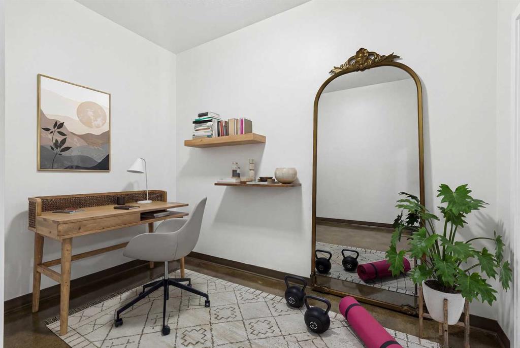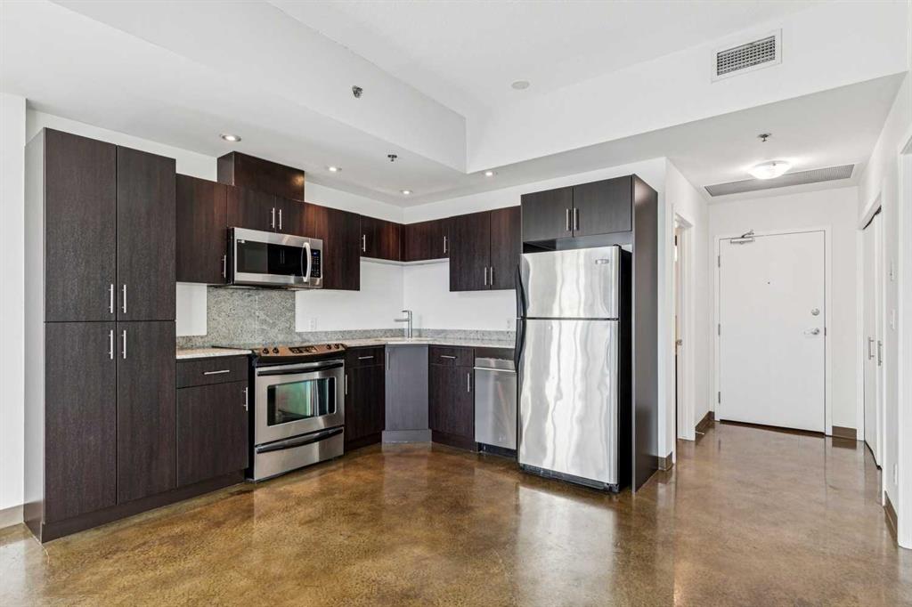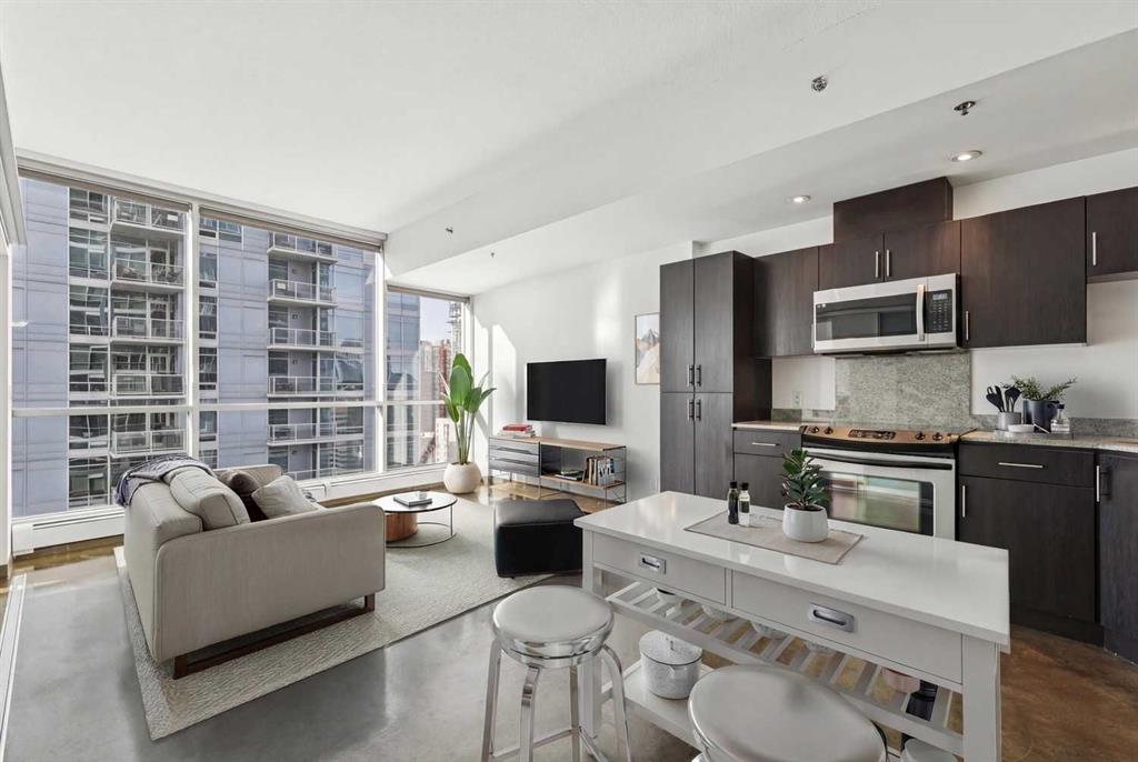 Step into urban living at Colours, where architecture, light, and location come together in all the right ways. This west-facing one bedroom plus den residence delivers a front-row seat to Calgary’s skyline, with sweeping Downtown and Rocky Mountain views showcased through an impressive wall of floor-to-ceiling glass. As the sun sets, the entire space is washed in warm afternoon and evening light—an everyday luxury you’ll never tire of. The open-concept layout is designed for both style and function. The kitchen anchors the home with sleek ebony flat-panel cabinetry, granite countertops, and stainless steel appliances, offering a modern, streamlined aesthetic that pairs perfectly with the building’s industrial edge. Acid-stained polished concrete floors and 9-foot ceilings reinforce the loft-inspired feel, while central air conditioning keeps the space comfortable year-round. The versatile den is ideal for a 2nd bedroom, home office, creative studio, or reading nook—proof that smart design can do more with less. The bedroom enjoys the same west exposure and city outlook, while the contemporary four-piece bathroom, in-suite laundry, and sliding glass door to the window wall complete the interior. A titled underground parking stall adds everyday convenience and long-term value. Colours is known for its bold glass façade and unmistakable presence in the streetscape, reflecting the energy of the neighborhood itself. Located in Victoria Park, you’re surrounded by an eclectic mix of culture, cuisine, and nightlife. From 17th Avenue to the Downtown Core, and from Mission to Inglewood, everything Calgary has to offer is just minutes away. This is more than a condo—it’s a lifestyle defined by views, vibrancy, and walkable city living.