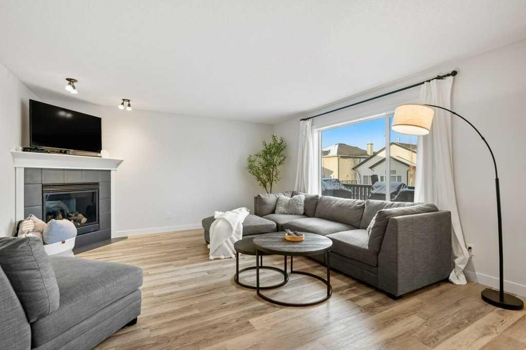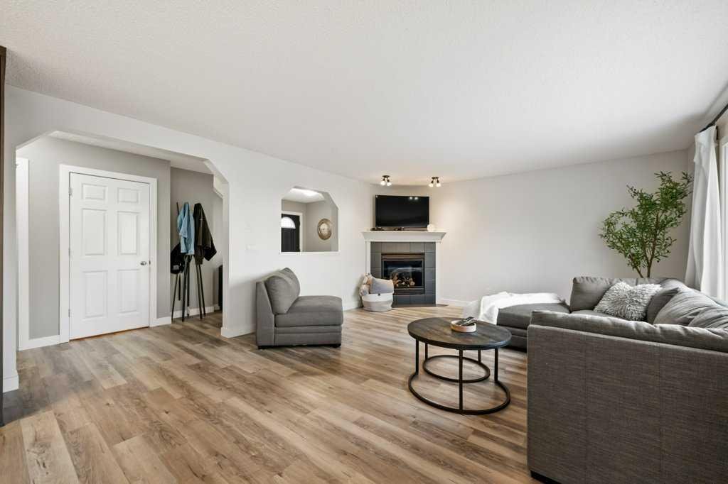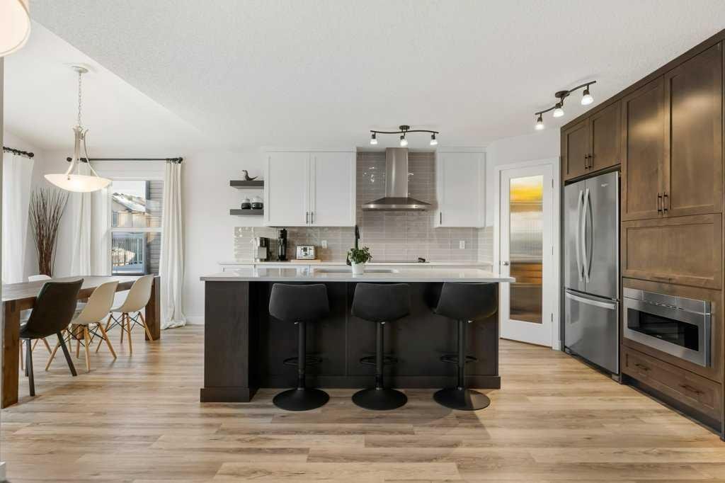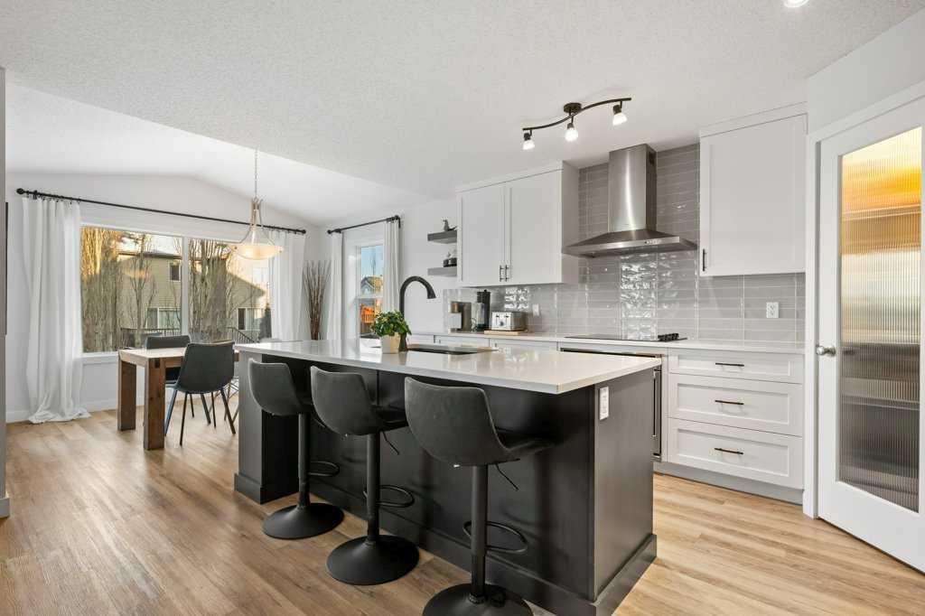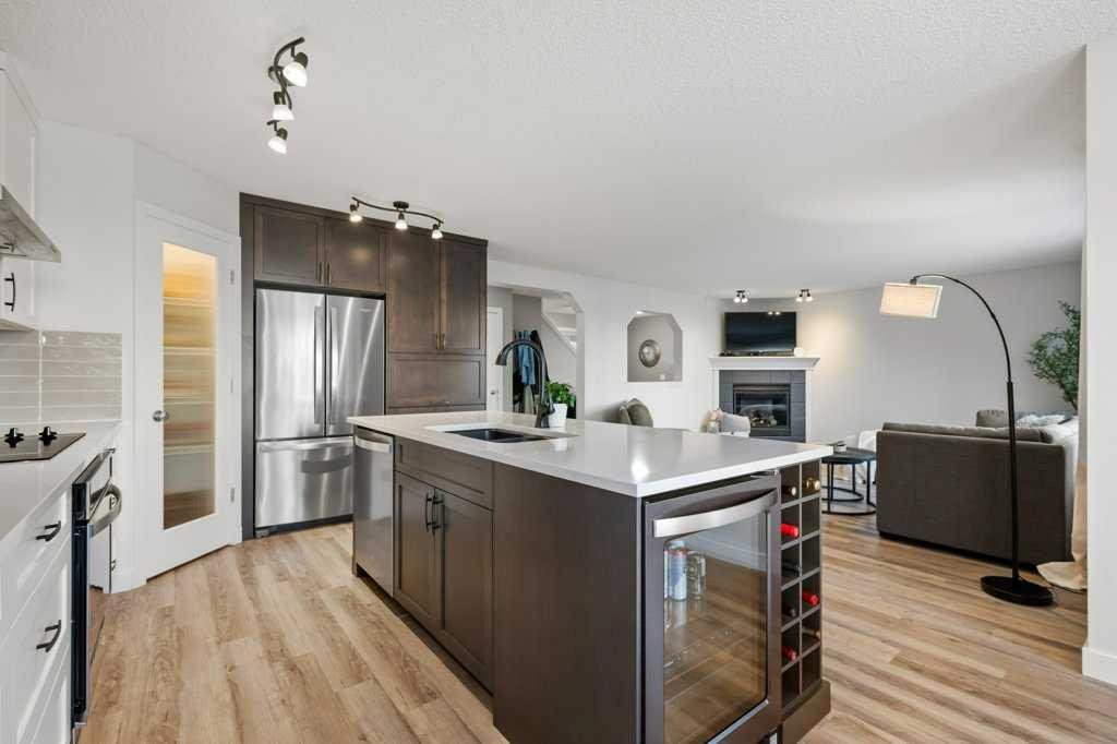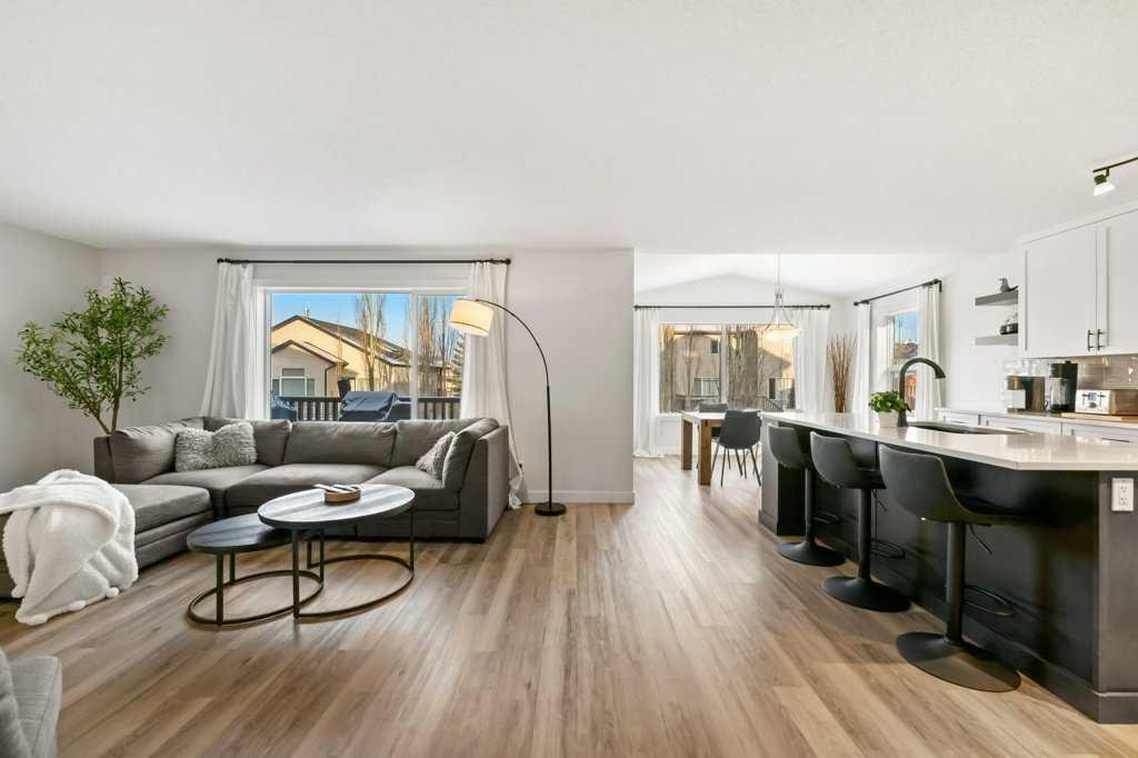 Perfectly situated in a family-friendly location, this beautifully updated home offers the ideal balance of walkability, lifestyle, & thoughtful design. Just steps from Our Lady of Wisdom School and Rainbow Creek Elementary, with nearby commercial amenities close at hand, residents will also enjoy easy access to a nearby bike park & scenic canal pathways. Quick access to Lakeside Golf Greens, Chestermere Lake, & Chestermere Lake Middle School further enhances the appeal of this exceptional location. The main floor welcomes you with fresh vinyl plank flooring, neutral paint tones, & the comfort of central air conditioning. Natural light flows through vinyl windows, while the layout has been carefully curated for both function & style. Direct access from the double attached garage leads into a well-designed mudroom & laundry area finished with hex tile flooring, added cabinetry & raw wood and metal shelving that adds character & warmth. A chic two-piece bathroom completes this level, featuring a counter-height standalone vanity & designer wallpaper. The lifestyle room invites relaxation with a gas fireplace framed by a tiled surround, creating a cozy focal point for everyday living. The heart of the home is the stunning kitchen, designed & renovated by Bjornson Design. White and grey cabinetry with soft-close mechanics, dovetail inlays, extended-height uppers, & a tiled backsplash set a timeless tone, while thoughtful details such as a garbage pull-out, built-in wine rack, beverage fridge, floating shelves, & premium built-in appliances elevate both form & function. The adjoining dining area is highlighted by a vaulted ceiling and opens through a garden door onto the deck, overlooking the the massive backyard & creating a seamless indoor-outdoor connection. Upstairs, vinyl plank flooring continues through a well-planned split-bedroom design. A front bonus room with a vaulted ceiling provides flexible space for a family room, office, or play area. Two additional bedrooms are privately positioned toward the back & side of the home, while the main four-piece bathroom offers a storage vanity, tub surround, & added tile accents. The primary bedroom is a peaceful retreat with backyard views, generous space for a king-size bed, & a walk-in closet. The renovated ensuite showcases a spa-inspired design with a water closet, soaker tub with tiled skirting, counter-height storage vanity in classic white cabinetry with Scandinavian-style countertop, an upper vessel sink, & a full-size stand-up shower accented with tile. The developed walkout basement, expands the living space with 9-foot ceilings, plush carpeting, & a large fourth bedroom. A three-piece bathroom with a storage vanity & corner shower adds convenience, while the recreation room features a second garden door that walks out to a lower concrete patio. Outside, the fully fenced walkout yard is fenced & framed by mature trees, garden beds & includes a corner storage shed for your convenience