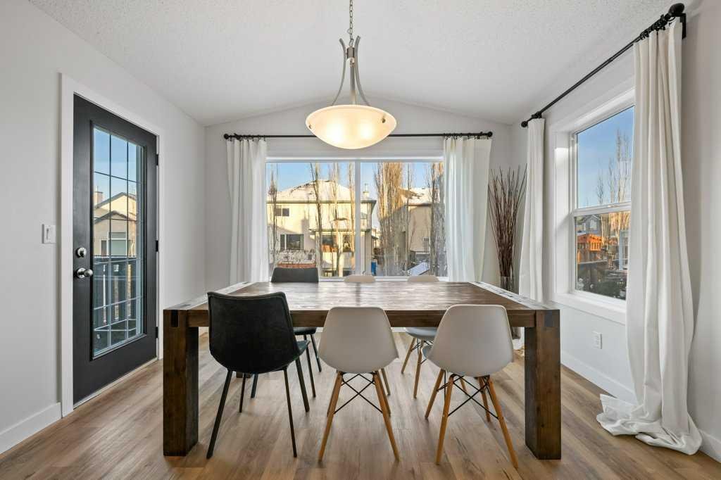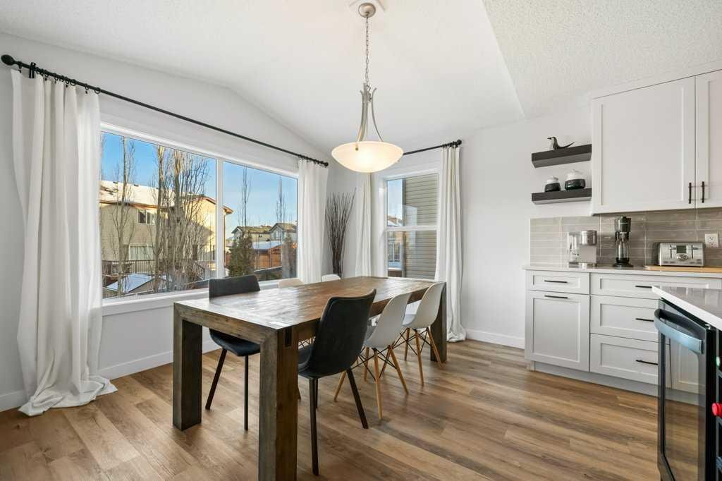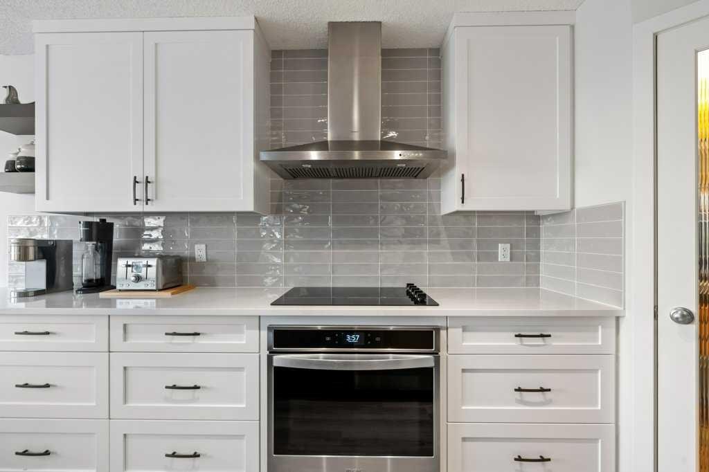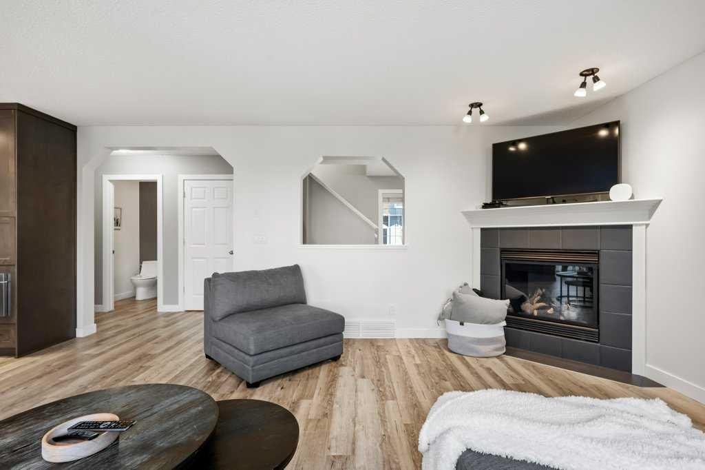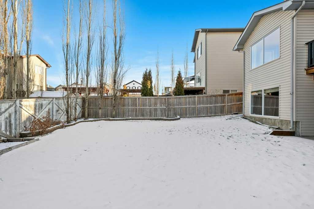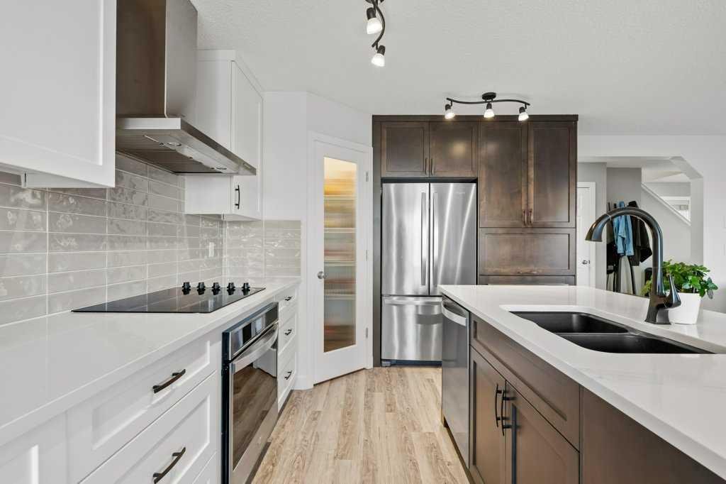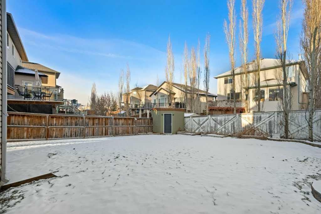 Perfectly situated in a family-friendly location, this beautifully updated home offers the ideal balance of walkability, lifestyle, & thoughtful design. Just steps from Our Lady of Wisdom School and Rainbow Creek Elementary, with nearby commercial amenities close at hand, residents will also enjoy easy access to a nearby bike park & scenic canal pathways. Quick access to Lakeside Golf Greens, Chestermere Lake, & Chestermere Lake Middle School further enhances the appeal of this exceptional location. The main floor welcomes you with fresh vinyl plank flooring, neutral paint tones, & the comfort of central air conditioning. Natural light flows through vinyl windows, while the layout has been carefully curated for both function & style. Direct access from the double attached garage leads into a well-designed mudroom & laundry area finished with hex tile flooring, added cabinetry & raw wood and metal shelving that adds character & warmth. A chic two-piece bathroom completes this level, featuring a counter-height standalone vanity & designer wallpaper. The lifestyle room invites relaxation with a gas fireplace framed by a tiled surround, creating a cozy focal point for everyday living. The heart of the home is the stunning kitchen, designed & renovated by Bjornson Design. White and grey cabinetry with soft-close mechanics, dovetail inlays, extended-height uppers, & a tiled backsplash set a timeless tone, while thoughtful details such as a garbage pull-out, built-in wine rack, beverage fridge, floating shelves, & premium built-in appliances elevate both form & function. The adjoining dining area is highlighted by a vaulted ceiling and opens through a garden door onto the deck, overlooking the the massive backyard & creating a seamless indoor-outdoor connection. Upstairs, vinyl plank flooring continues through a well-planned split-bedroom design. A front bonus room with a vaulted ceiling provides flexible space for a family room, office, or play area. Two additional bedrooms are privately positioned toward the back & side of the home, while the main four-piece bathroom offers a storage vanity, tub surround, & added tile accents. The primary bedroom is a peaceful retreat with backyard views, generous space for a king-size bed, & a walk-in closet. The renovated ensuite showcases a spa-inspired design with a water closet, soaker tub with tiled skirting, counter-height storage vanity in classic white cabinetry with Scandinavian-style countertop, an upper vessel sink, & a full-size stand-up shower accented with tile. The developed walkout basement, expands the living space with 9-foot ceilings, plush carpeting, & a large fourth bedroom. A three-piece bathroom with a storage vanity & corner shower adds convenience, while the recreation room features a second garden door that walks out to a lower concrete patio. Outside, the fully fenced walkout yard is fenced & framed by mature trees, garden beds & includes a corner storage shed for your convenience