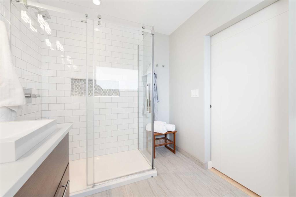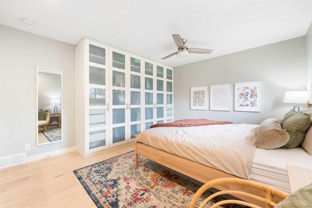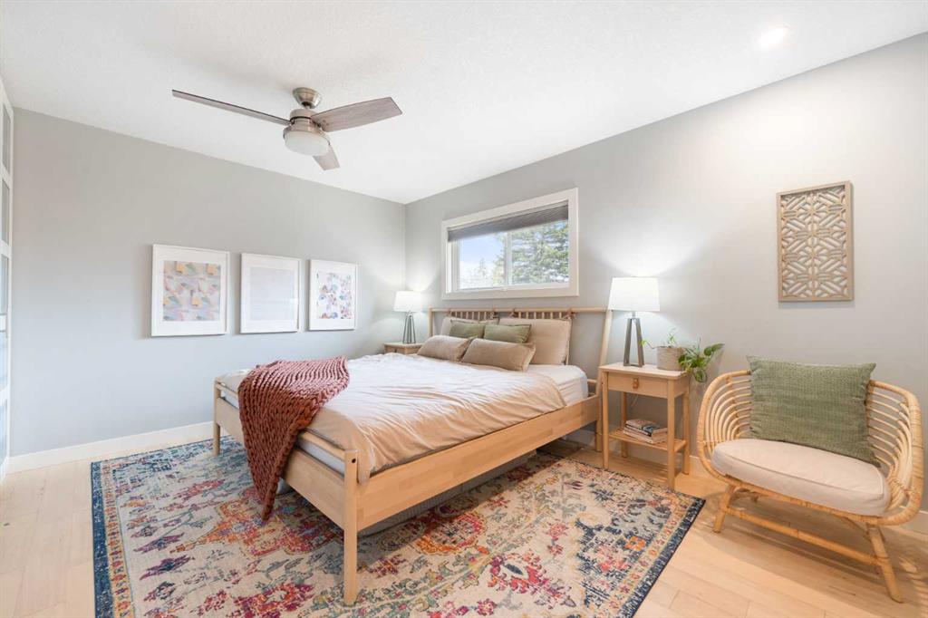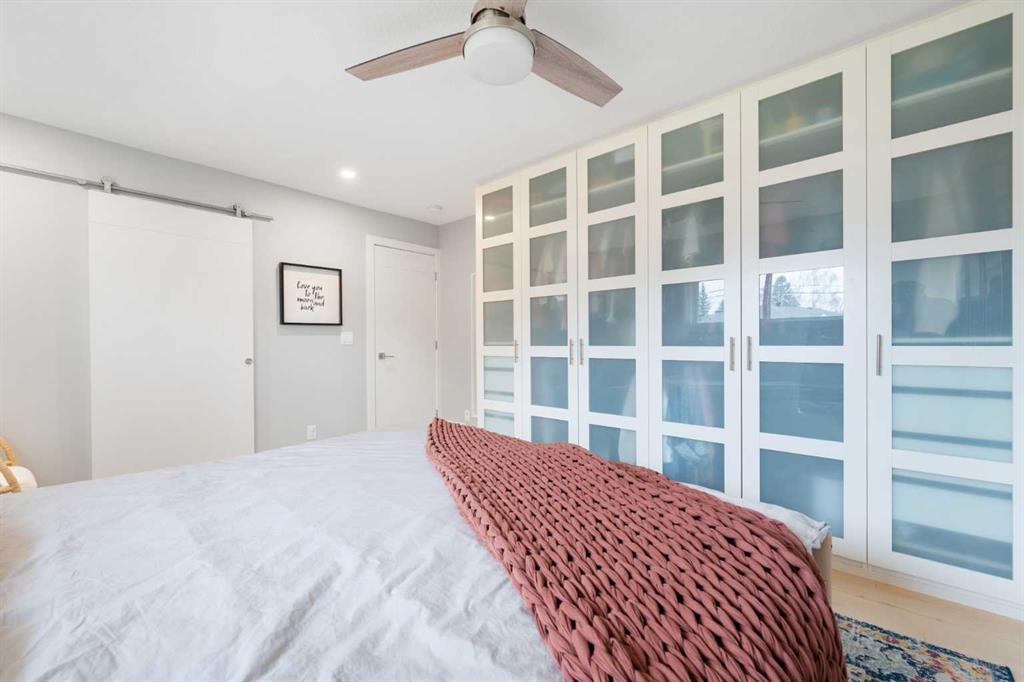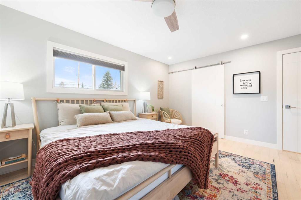 Step inside to discover a bright, open-concept main floor designed for both everyday living and effortless entertaining. The spacious living room is flooded with natural light from large south-facing bay windows, perfectly complementing the rich hardwood floors throughout. The kitchen is a true standout, featuring quartz countertops, crisp white cabinetry, stainless steel appliances, and a charming bay window above the sink—bringing warmth and light into the heart of the home. Two well-appointed bedrooms, including a serene primary retreat complete with custom closet built-ins, a ceiling fan, and a stylish barn door leading to your private 4-piece ensuite. This spa-inspired space boasts dual sinks, a tiled floor, and a glass-enclosed shower. A second fully renovated 4-piece bathroom completes the upper level.