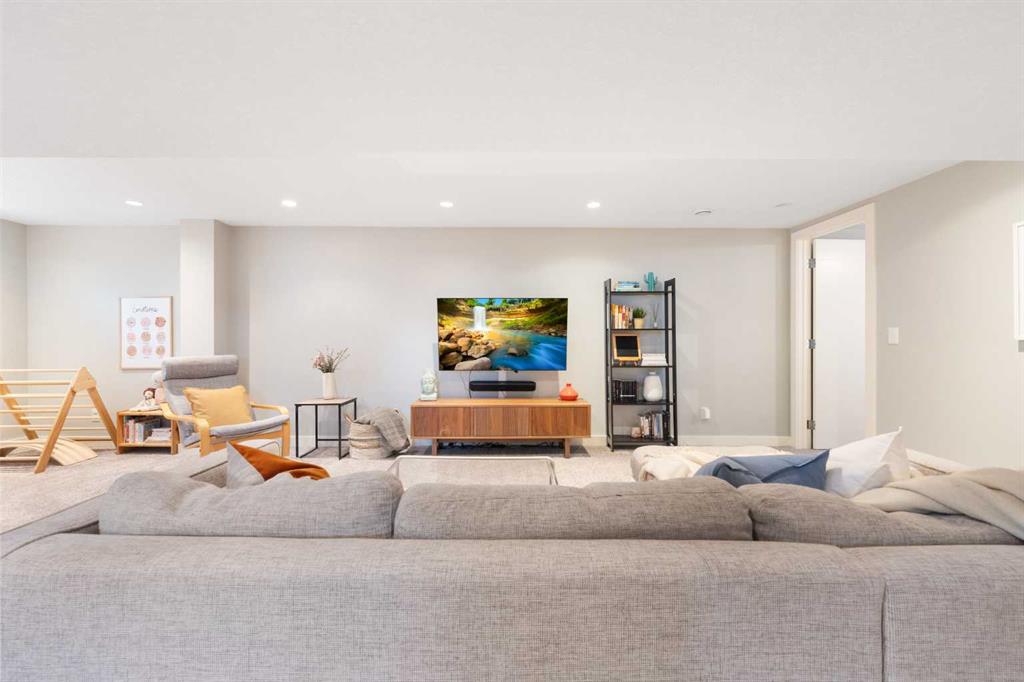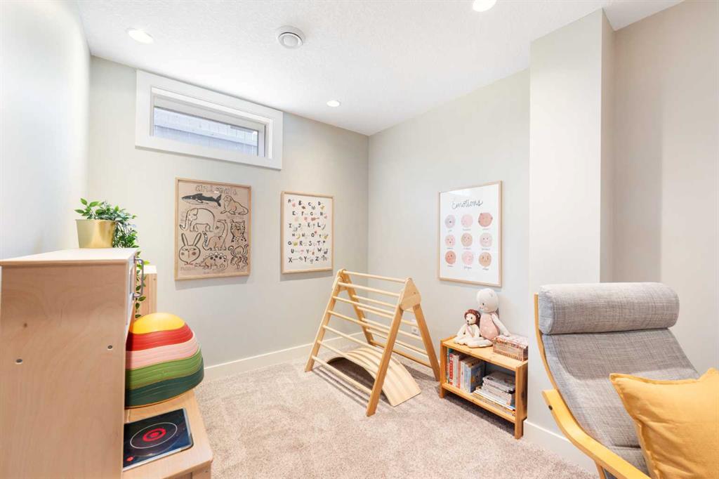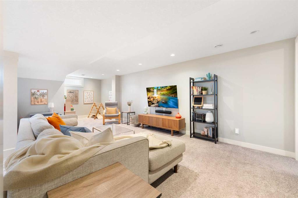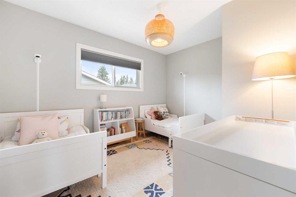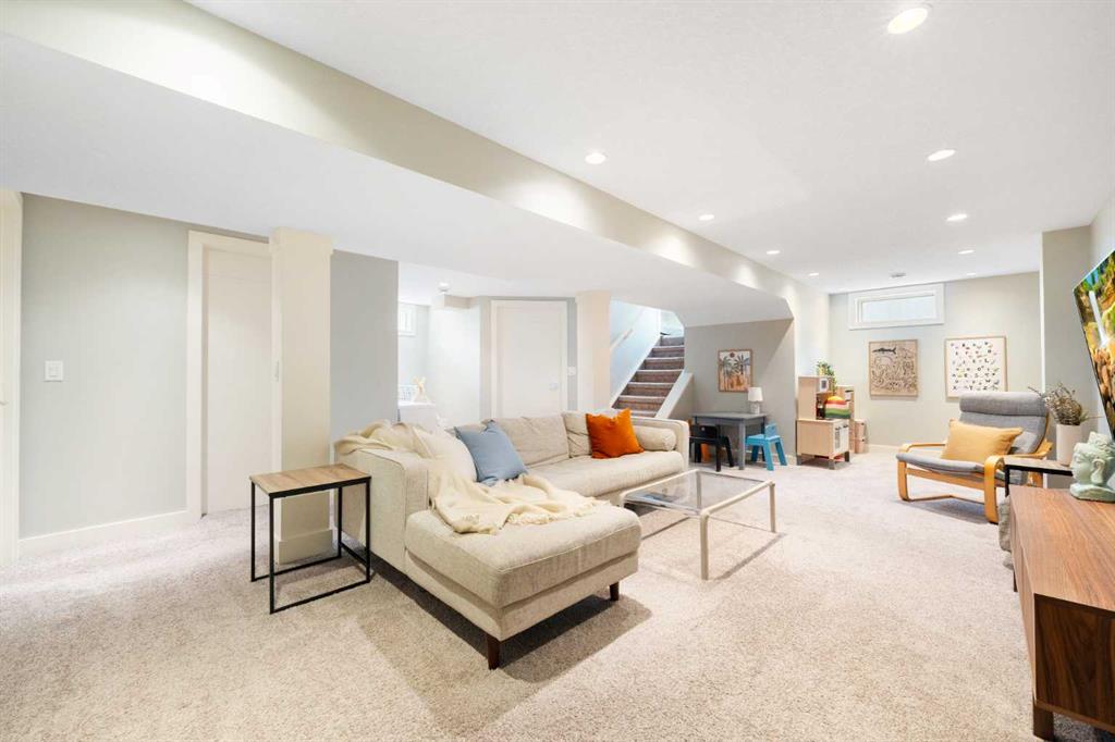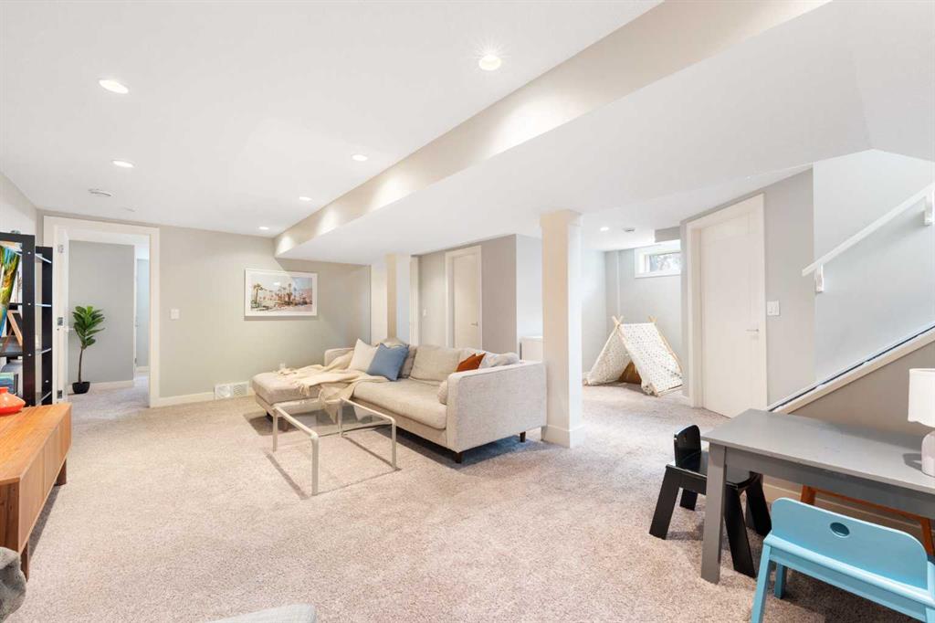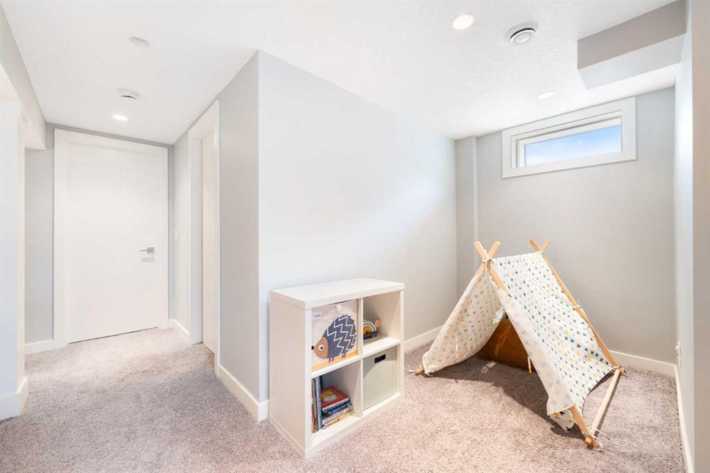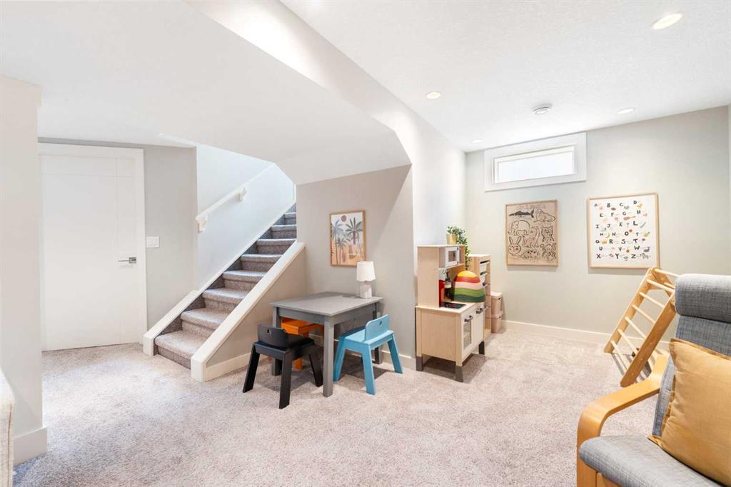 The fully finished basement offers incredible versatility with two additional large bedrooms, a spacious recreation area, and a cozy nook—perfect as a kids’ play space, reading corner, or extra storage zone. You’ll also find a beautifully finished 4-piece bathroom with tiled shower and built-in shelving, along with a convenient laundry area featuring a sink. A split-level landing between the main and lower floors provides direct access to the backyard, adding both function and flow to the home.