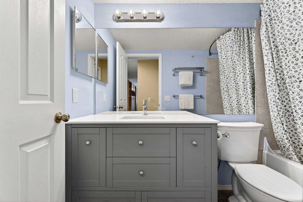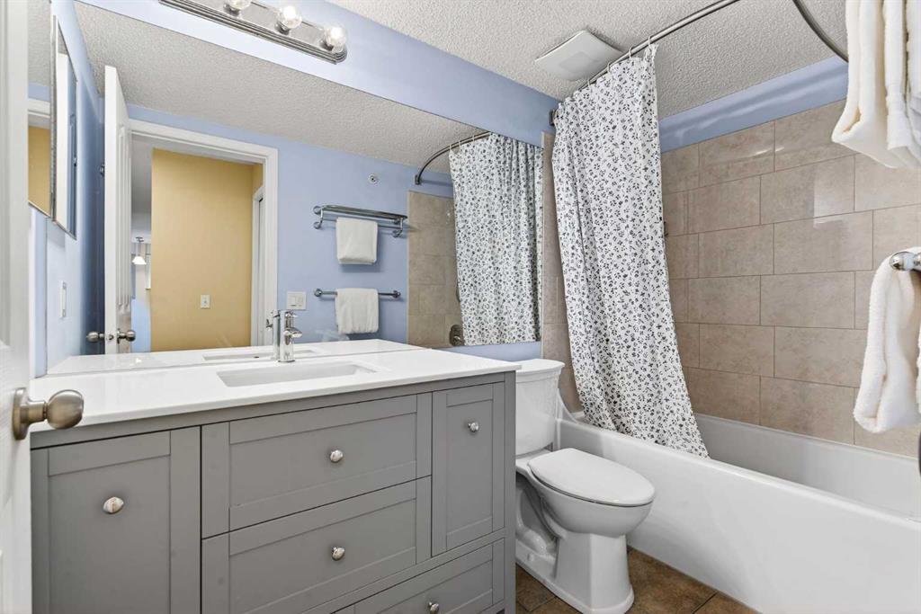 The kitchen features white cabinetry, stainless appliances, and tiled flooring — with all appliances replaced in 2022 for added peace of mind. The bathroom has been completely renovated and includes a tiled bathtub, a modern vanity with plenty of drawers, a wide mirror, and a convenient medicine cabinet.