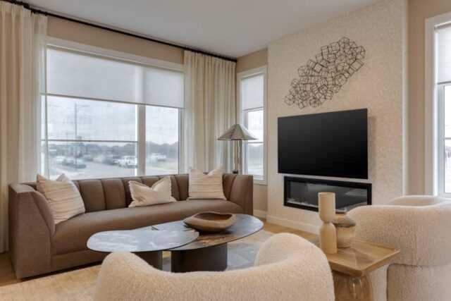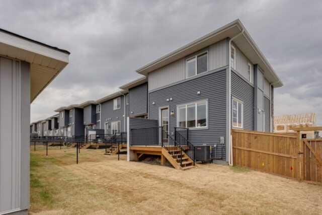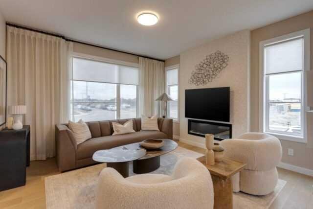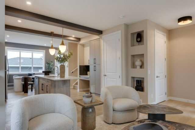 Discover the St. Andrews, expertly crafted by Douglas Homes. This 1294sqft. end-unit, fee simple townhouse delivers a turnkey lifestyle with a convenient side entrance and no condo fees. Located in the sought-after community of AmbleRidge, one of Calgary’s newest neighborhoods, this home stands out with quality upgrades already included. Enjoy 9-foot knockdown ceilings, luxury vinyl plank flooring, quartz countertops, and 42-inch upper cabinets. The bright, open-concept main floor showcases a spacious great room with oversized windows and an optional fireplace. The impressive 9-foot kitchen island comfortably seats 6–8, making it ideal for entertaining, while the adjoining dining area overlooks the sunny west backyard. Upstairs, the primary suite features a walk-in closet and a stylish 3-piece ensuite with quartz counters and a vanity with drawers. Two additional generously sized bedrooms provide plenty of space for family, guests, or a home office. A well-appointed 4-piece main bath includes quartz surfaces, a generous vanity, and a deep soaker tub. You’ll also appreciate the convenience of an upper-floor laundry room The basement is thoughtfully designed and ready for future development. Outside, the home is fully landscaped and includes a rear deck, fenced yard, and double garage. Don’t miss your chance—schedule your viewing today. Photos shown are from a previously built home and are intended to illustrate style and finishes; actual layouts and features may vary. First-Time Home Buyers’ GST Rebate: Eligible buyers may receive up to $50,000 on a new home purchase. Applicants must be 18 or older, a Canadian citizen or permanent resident, and not have owned or lived in a home owned by themselves or their spouse/common-law partner in the past four years. All terms and conditions are subject to Government of Canada/CRA guidelines.