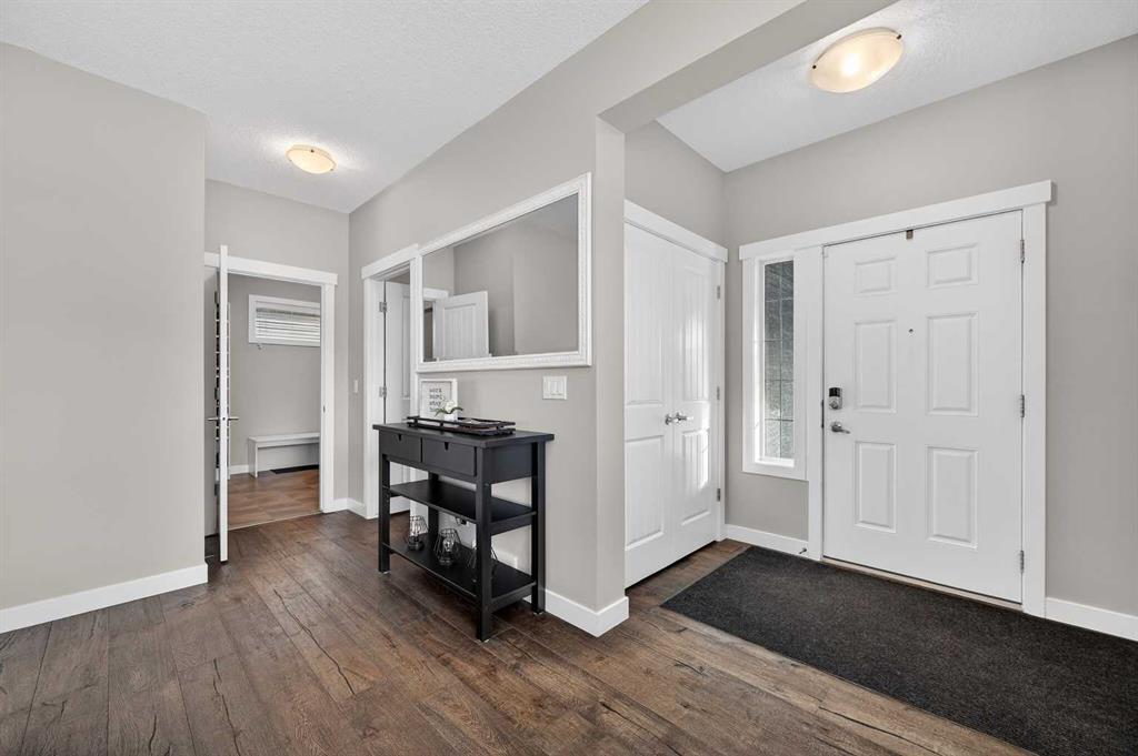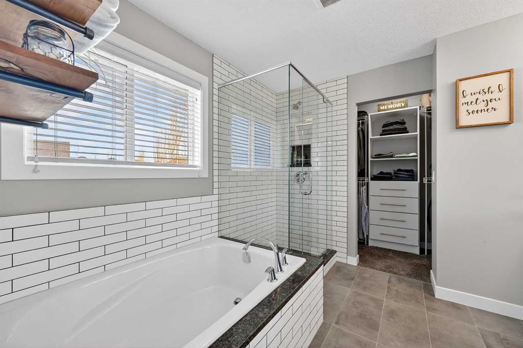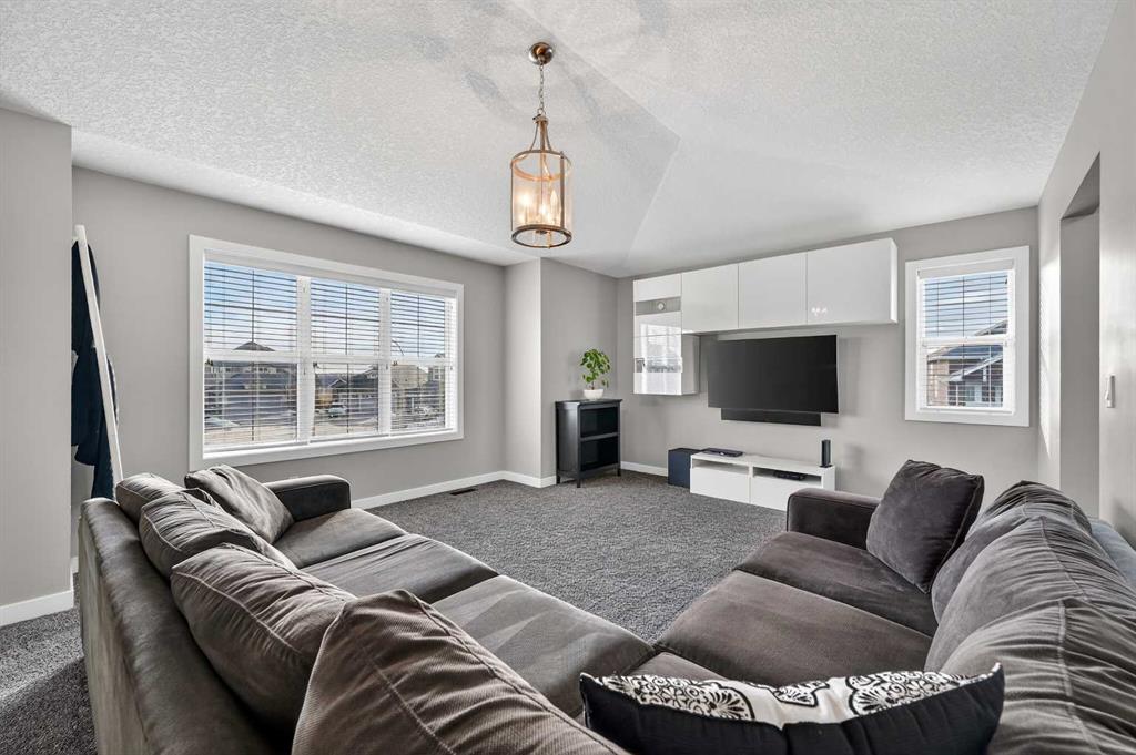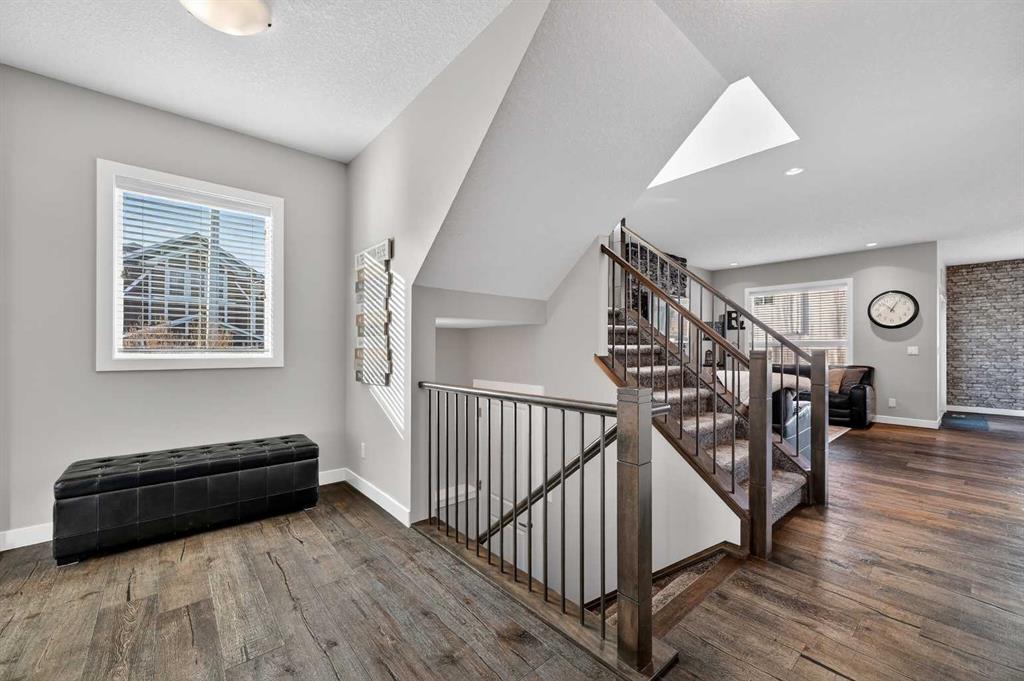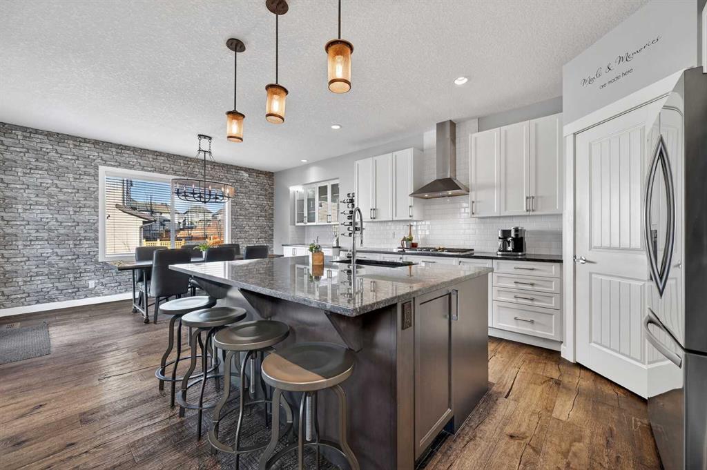 Welcome to this beautifully maintained 2-storey home in the heart of Cranston — a community known for its family-friendly atmosphere, scenic pathways, and quick access to schools, shopping, and the Bow River ridge. Situated on a desirable corner lot, this property offers both space and comfort, along with thoughtful upgrades throughout. Stepping inside, you’re greeted by a large, inviting entryway that opens into a bright main floor with engineered hardwood and 9-ft knockdown ceilings. The open-concept layout creates an easy flow between the dining area and the cozy living room, where a striking stone-faced electric fireplace becomes the natural gathering point. The kitchen is designed for those who love to cook and entertain — featuring stainless steel appliances including a chimney-style hood fan, built-in double ovens, and a gas cooktop. Granite counters, ample white cabinetry, a tile backsplash, a built-in hutch, and a spacious walk-in pantry provide both style and functionality. The oversized island with a silgranit sink, breakfast bar, pendant lighting, and extra storage ties it all together. From the dining area, a door leads to the large exposed-aggregate patio, perfect for summer evenings outdoors. The main level also includes a convenient laundry room with a sink, a 2-piece bathroom, and access to the double attached garage — complete with a built-in dog run and exterior door for easy outdoor access. Central air conditioning and built-in exterior LED lighting add comfort and curb appeal year-round. Upstairs, the primary bedroom offers a peaceful retreat with a generous walk-in closet and a 4-piece ensuite featuring ceramic tile flooring, granite counters, a large soaker tub, a walk-in shower, and a bright window. Three additional well-sized bedrooms, a full 4-piece bathroom, a linen closet, and a spacious bonus room with a vaulted ceiling complete the upper level — giving the whole family room to spread out. The basement is partly finished with framing and electrical already completed, making it easy to customize the space to your needs. It’s laid out for a future bedroom, full bathroom, large family or media room, and plenty of storage.