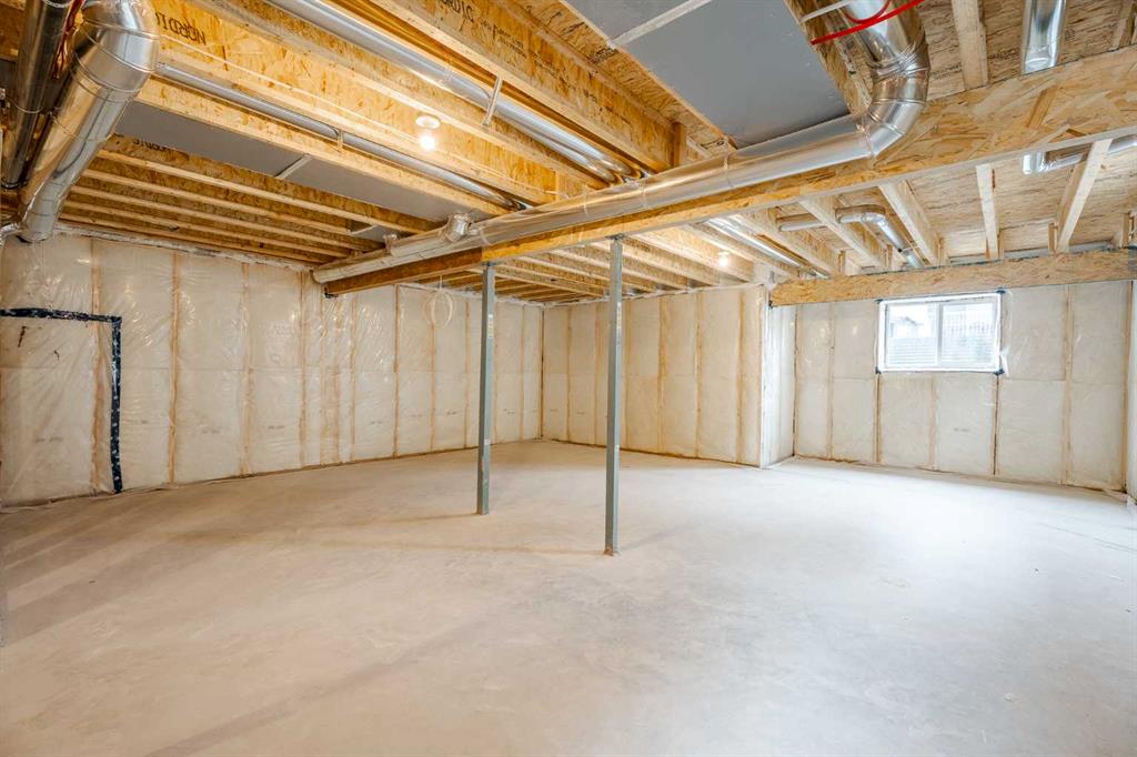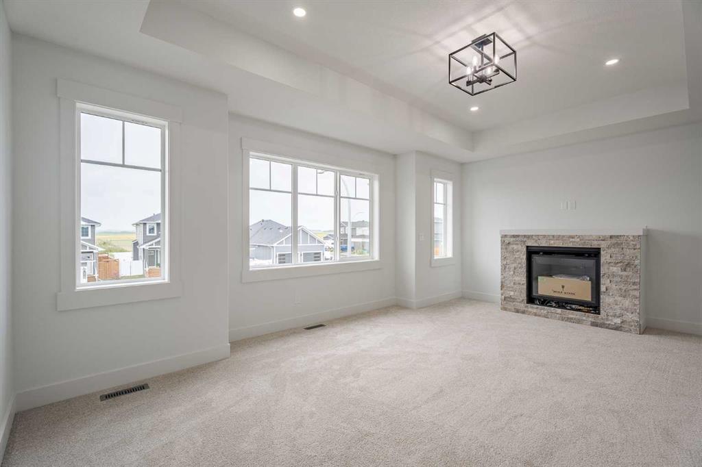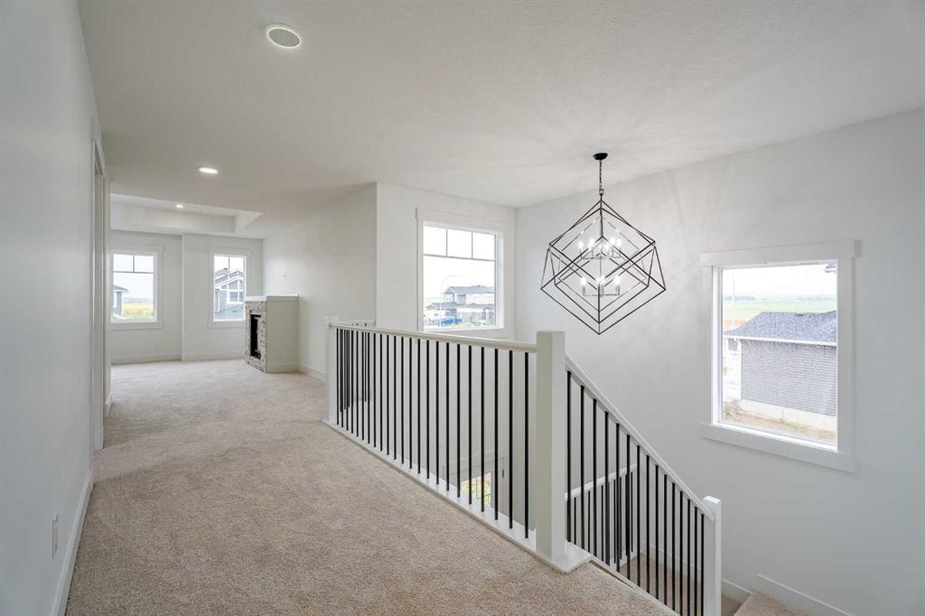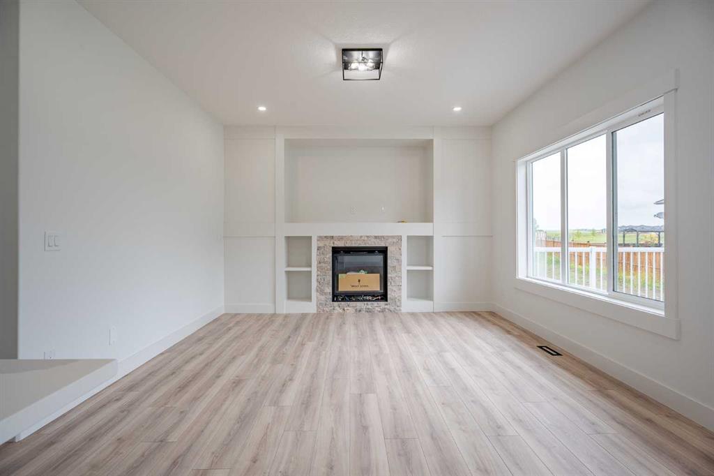 Quick Possession and Brand New with Triple Garage on a spacious lot with 51′ frontage and 120′ deep. Quick possession is available, and a Fall Special allows buyers to inquire about discount pricing to add a complete basement development. 2,372 sq.ft. two story with attached triple garage (28′ x 23′) and side access walk-up basement. Bright, open plan with spacious main level dining nook, kitchen with island and walk-through pantry (wood shelving) to spacious mud room (wood bench + shelves), family room with built-in shelves and fireplace, private Work From Home Office, two piece bath and spacious open cathedral front entry. Three bedrooms on the upper level including 15’9″ x 14′ Primary suite with raised tray ceiling and large walk-in closet (wood shelving), 5 piece Ensuite, bonus room with raised tray ceiling and fireplace, laundry room and 4 piece main bath. Bright undeveloped side access basement has high efficiency mechanical, roughed-in bath plumbing, and large windows for lots of natural light. Will be nicely appointed with ceiling height cabinets, quartz counter tops, upgraded lighting, vinyl plank, tile + carpet flooring, wood shelving in all closets, upgraded exterior and stonework. Includes GST (rebate to builder), new home warranty, rear deck with vinyl cover, front sod + tree, and $5,000 appliance allowance. Great family community with school, park and pond nearby, recreation facilities, and a quick commute to Airdrie, Balzac Mall, Calgary, or hospital nearby at Didsbury. A little drive, a lot of savings!