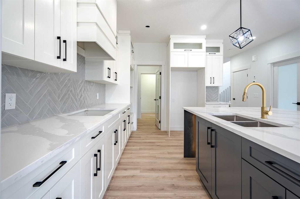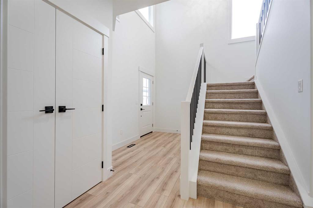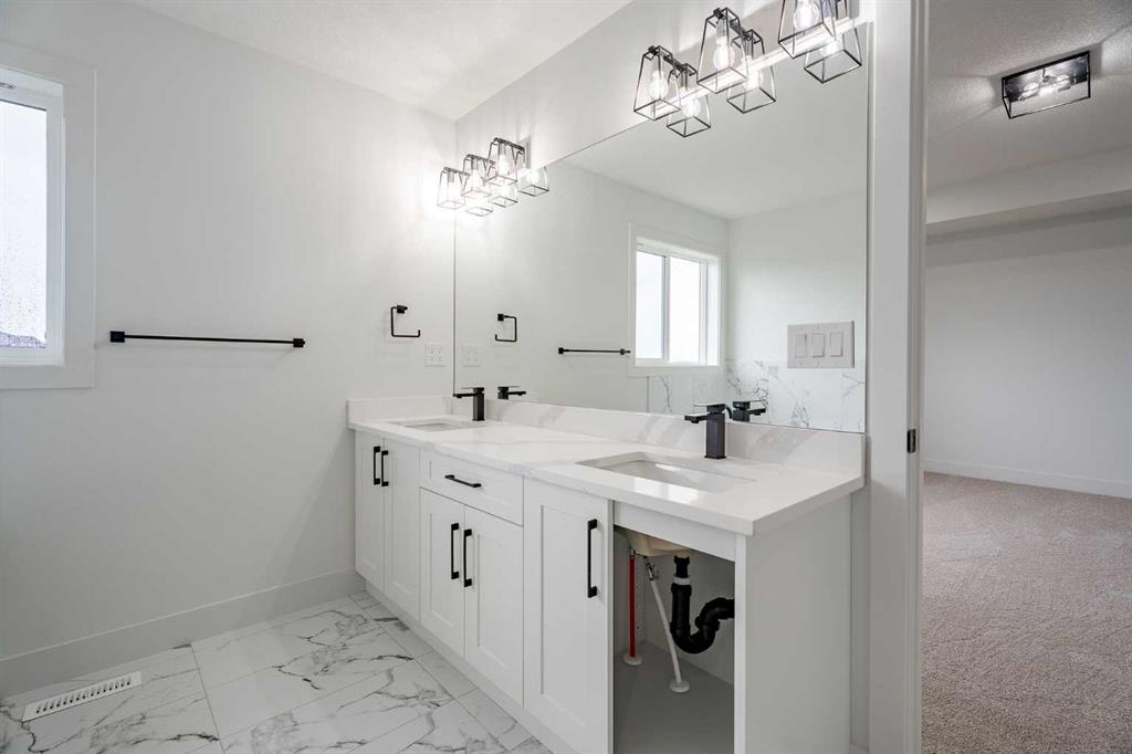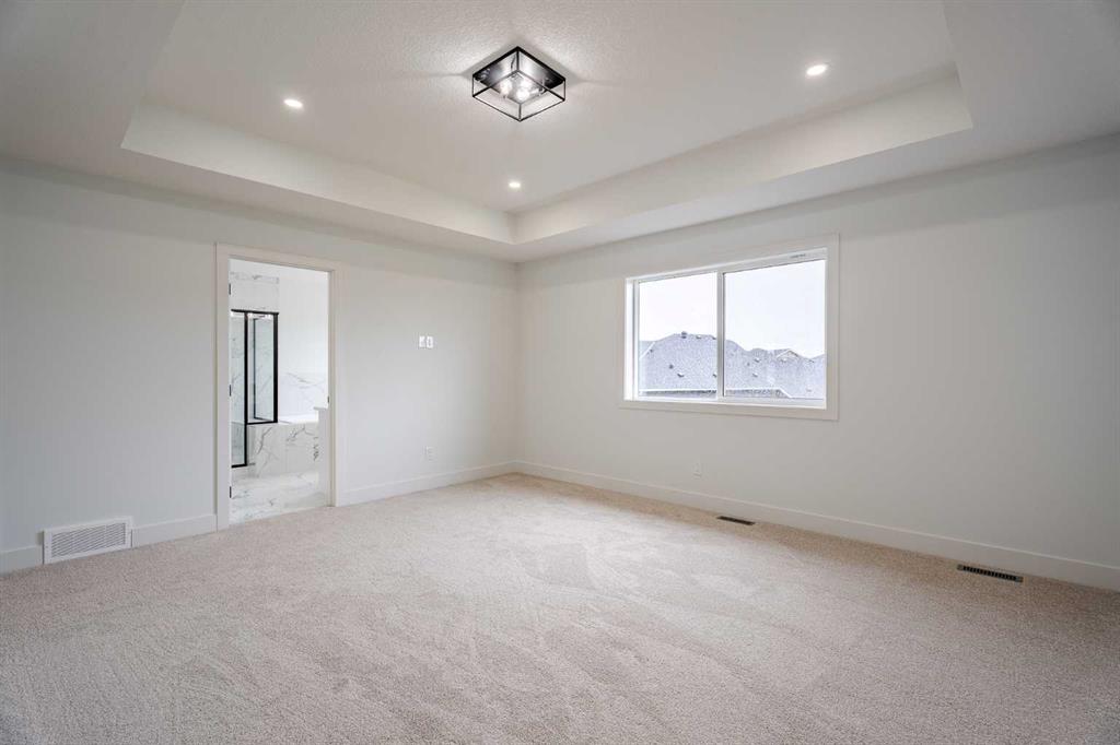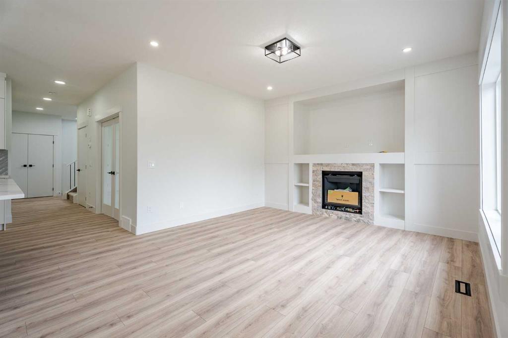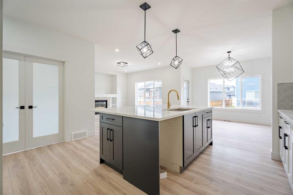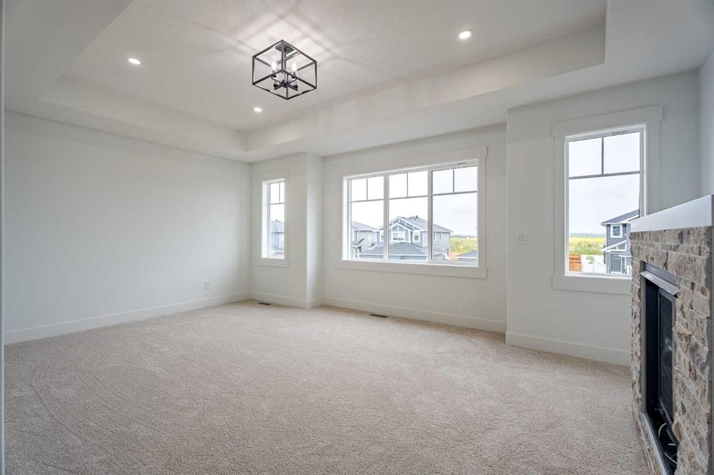 Quick Possession and Brand New with Triple Garage on a spacious lot with 51′ frontage and 120′ deep. Quick possession is available, and a Fall Special allows buyers to inquire about discount pricing to add a complete basement development. 2,372 sq.ft. two story with attached triple garage (28′ x 23′) and side access walk-up basement. Bright, open plan with spacious main level dining nook, kitchen with island and walk-through pantry (wood shelving) to spacious mud room (wood bench + shelves), family room with built-in shelves and fireplace, private Work From Home Office, two piece bath and spacious open cathedral front entry. Three bedrooms on the upper level including 15’9″ x 14′ Primary suite with raised tray ceiling and large walk-in closet (wood shelving), 5 piece Ensuite, bonus room with raised tray ceiling and fireplace, laundry room and 4 piece main bath. Bright undeveloped side access basement has high efficiency mechanical, roughed-in bath plumbing, and large windows for lots of natural light. Will be nicely appointed with ceiling height cabinets, quartz counter tops, upgraded lighting, vinyl plank, tile + carpet flooring, wood shelving in all closets, upgraded exterior and stonework. Includes GST (rebate to builder), new home warranty, rear deck with vinyl cover, front sod + tree, and $5,000 appliance allowance. Great family community with school, park and pond nearby, recreation facilities, and a quick commute to Airdrie, Balzac Mall, Calgary, or hospital nearby at Didsbury. A little drive, a lot of savings!