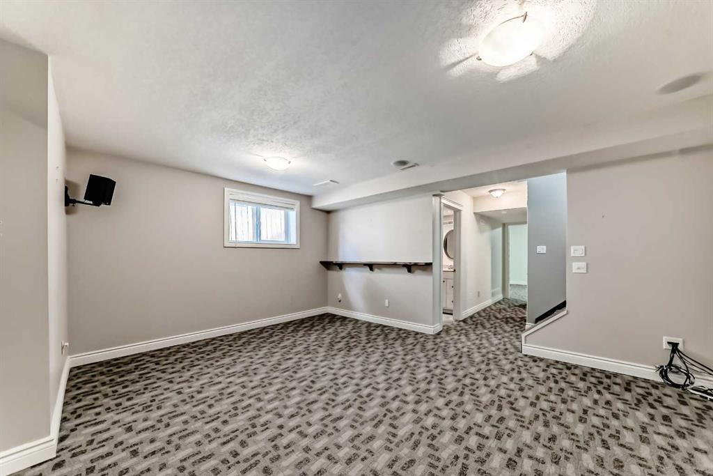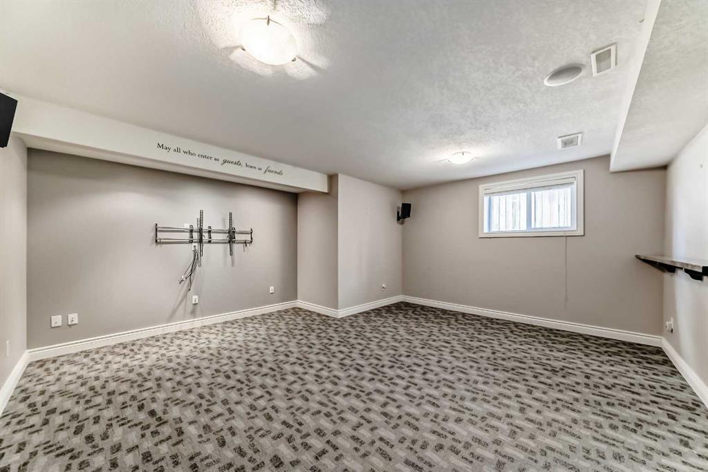 Additional highlights include wired-in sound throughout, skylight, projector and screen setup, HRV system, and central vacuum. The fully developed basement provides additional living space, a bedroom, and bathroom flexibility.