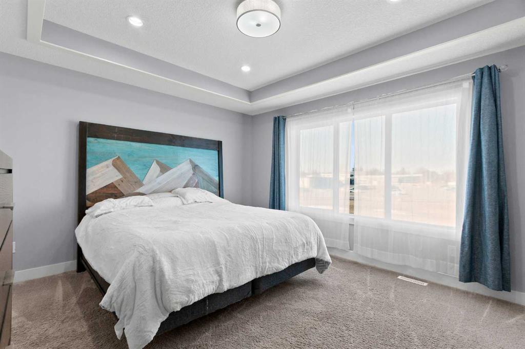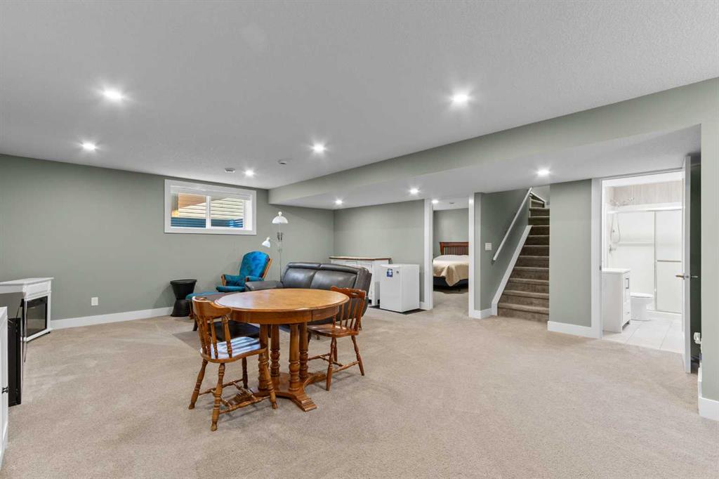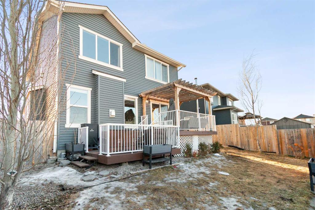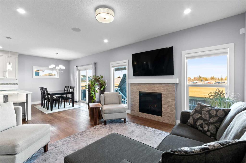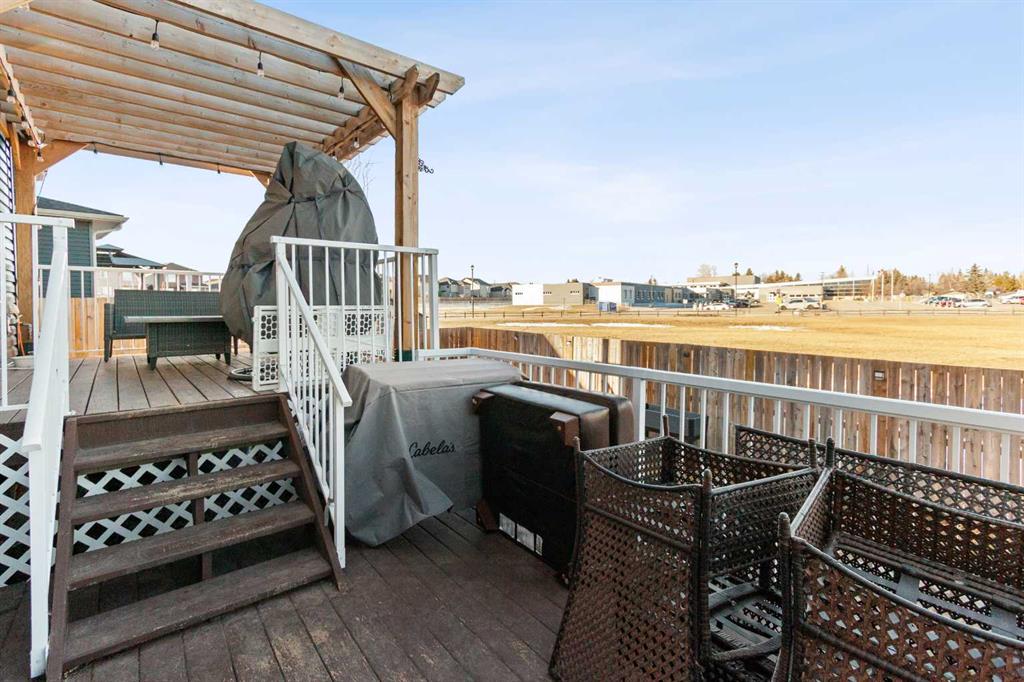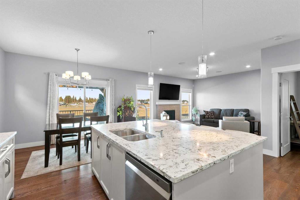 Welcome to this fully developed, 4 bedroom home backing onto a greenspace, located in the family-friendly community of Carstairs, known for its small-town charm, great schools, and easy access to everyday amenities. A large front porch invites you inside to a spacious foyer, leading into a bright, open-concept main floor. The large living room with a gas fireplace and engineered hardwood floors creates a warm, welcoming space for relaxing or entertaining. The chef’s kitchen offers a generous island with ample storage, gas stove, and a walk-through pantry that connects seamlessly to a large mudroom. The spacious dining area opens onto a private deck where you can enjoy peaceful views of the greenspace behind. A main floor office and 2-piece powder room complete this level. The upper level offers 3 generously sized bedrooms, including 2 large secondary bedrooms perfect for a growing family. You will also appreciate the convenience of upstairs laundry and a spacious bonus room complete with a second gas fireplace. The primary suite is a true retreat, featuring a 5-pc ensuite with a makeup area and a large walk-in closet. The fully developed basement adds even more living space with a very large bedroom, generous family room, and an additional bathroom, ideal for guests or teens. Central air conditioning will ensure summer comfort. Set in a welcoming community and backing onto greenspace, this is a home you will enjoy for years to come.