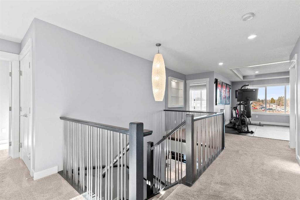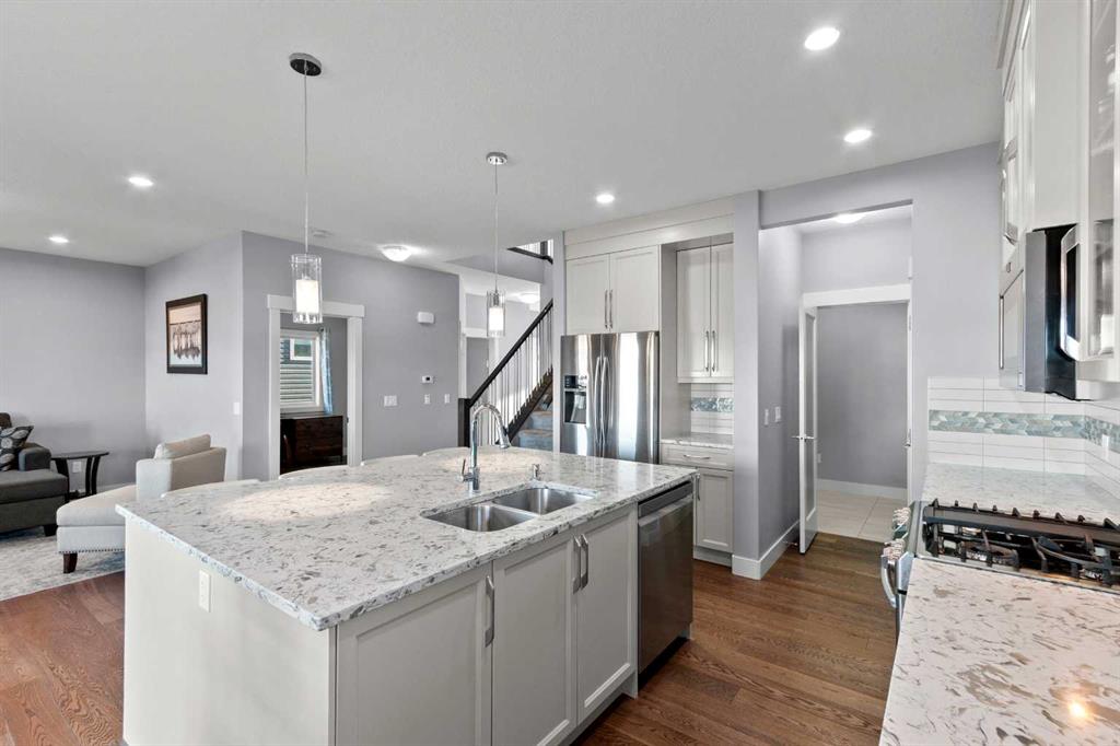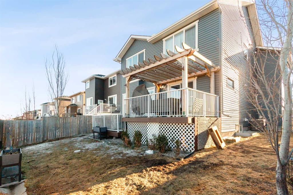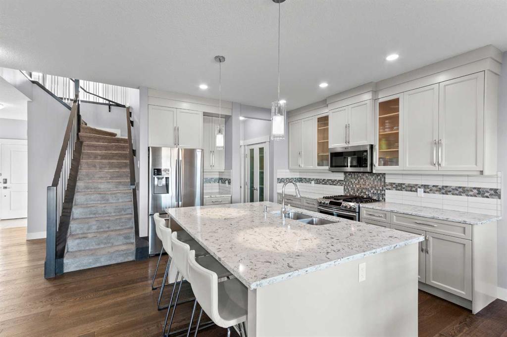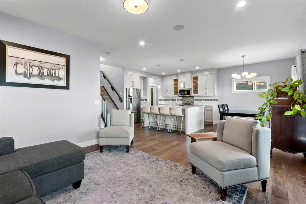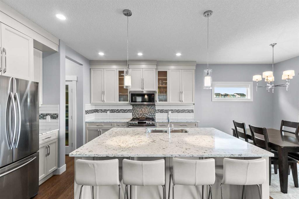Welcome to this fully developed, 4 bedroom home backing onto a greenspace, located in the family-friendly community of Carstairs, known for its small-town charm, great schools, and easy access to everyday amenities. A large front porch invites you inside to a spacious foyer, leading into a bright, open-concept main floor. The large living room with a gas fireplace and engineered hardwood floors creates a warm, welcoming space for relaxing or entertaining. The chef’s kitchen offers a generous island with ample storage, gas stove, and a walk-through pantry that connects seamlessly to a large mudroom. The spacious dining area opens onto a private deck where you can enjoy peaceful views of the greenspace behind. A main floor office and 2-piece powder room complete this level. The upper level offers 3 generously sized bedrooms, including 2 large secondary bedrooms perfect for a growing family. You will also appreciate the convenience of upstairs laundry and a spacious bonus room complete with a second gas fireplace. The primary suite is a true retreat, featuring a 5-pc ensuite with a makeup area and a large walk-in closet. The fully developed basement adds even more living space with a very large bedroom, generous family room, and an additional bathroom, ideal for guests or teens. Central air conditioning will ensure summer comfort. Set in a welcoming community and backing onto greenspace, this is a home you will enjoy for years to come.