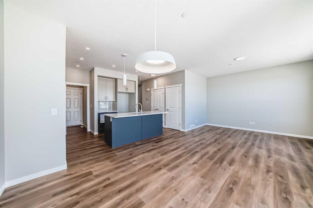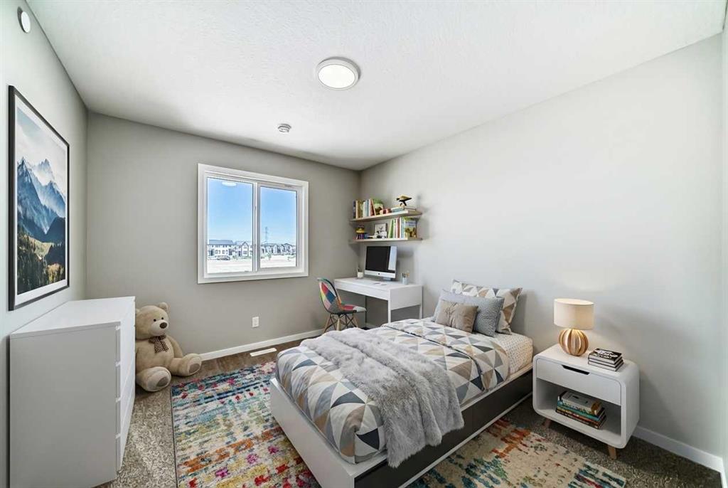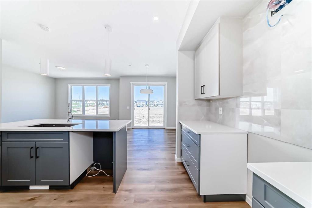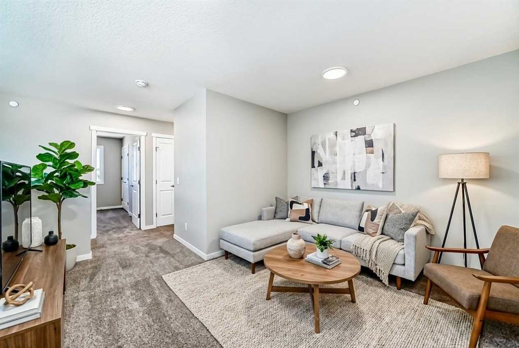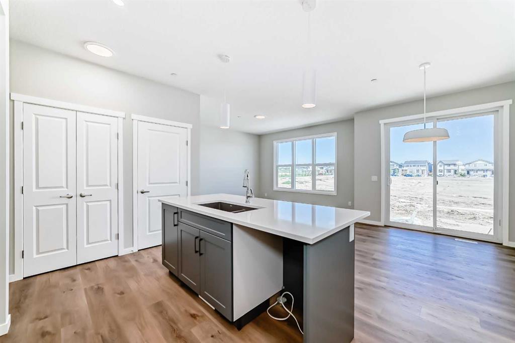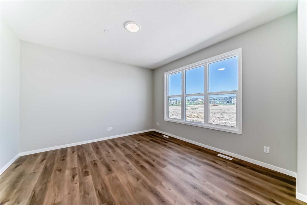 Welcome to the exquisite “Carisa” floor plan, where nearly 1,700 SqFt of thoughtfully designed space combines modern elegance with unmatched functionality. This home’s layout is tailored for both comfort and style, creating the perfect setting for family living and entertaining. As you step inside, you’ll be greeted by the warmth and durability of vinyl plank flooring that flows seamlessly throughout the main level, accentuating the modern finishes and striking architectural details. Natural light pours in through the back wall of windows, infusing the open-concept living areas with an inviting ambiance. Dual sliding patio doors extend your living space to the expansive backyard, ready for your personal touch to create the ultimate indoor-outdoor oasis. At the heart of the home, the kitchen is a chef’s dream. Featuring two-tone cabinetry, sleek quartz countertops, and a stylish tile backsplash that wraps elegantly around a chimney-style hood fan, this kitchen is as functional as it is beautiful. Stainless steel appliances and a thoughtfully positioned mudroom with direct kitchen access ensure that even grocery days are effortless. A cozy dining nook and a spacious living room, are perfectly positioned to enjoy the home’s abundant natural light. The smartly designed pocket office offers the perfect work-from-home setup or a dedicated homework space for the kids. Upstairs, a versatile bonus room serves as the ideal family retreat, separating the serene primary suite from the secondary bedrooms. The primary suite is a tranquil haven, complete with a luxurious 4-piece ensuite featuring an oversized shower and ample space to unwind. The two additional bedrooms are generously sized, making them ideal for children or guests. With an upstairs laundry room and a stylish 4-piece bathroom, convenience is woven into every detail of this home. **This home also comes complete with full front and backyard landscaping, including sod, mulch on the side yards, and trees/shrubs in the front as per community guidelines. Located in the vibrant southeast Calgary community of Hotchkiss, this home offers more than just a beautiful living space. Residents enjoy stunning mountain views, 51 acres of park space, interconnected walking paths, and a central wetland. Designed with families in mind, Hotchkiss is a community where you can truly belong and thrive.