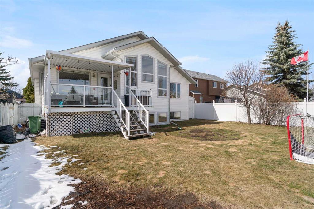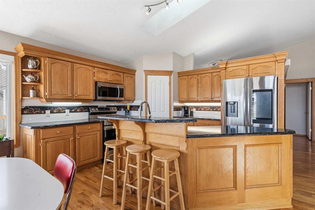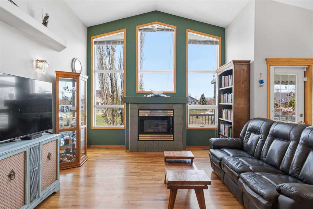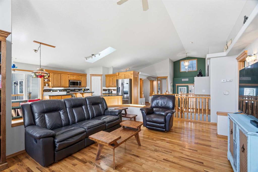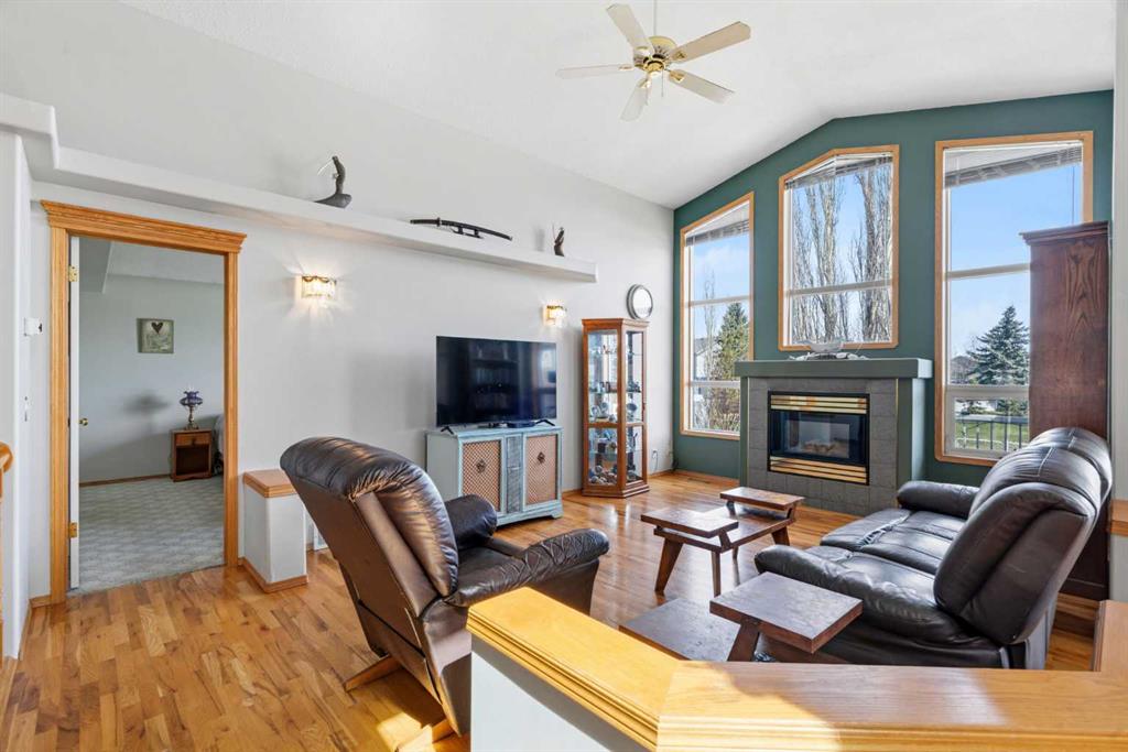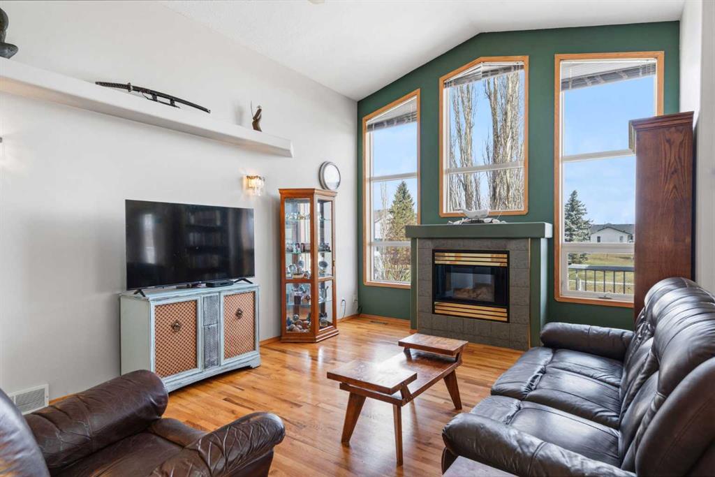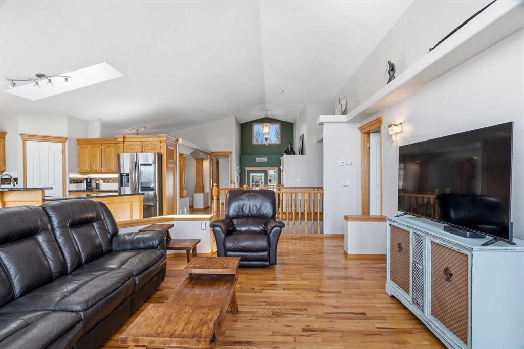 Welcome to this exceptional raised bungalow in the sought after community of Cambridge Glen in Strathmore, an ideal home for the discerning buyer seeking space, quality & a truly special setting. Backing directly onto a massive green space & park, this beautifully maintained & updated residence offers 1,482 sq. ft. above grade & 1,298 sq ft of professional development in the lower level, delivering outstanding functionality for families of all sizes. From the moment you arrive, the home’s curb appeal, featuring stone trim detail & an oversized, double-attached garage with direct interior access & thoughtful built-in storage, sets the tone for what lies within. Inside, the bright, open concept layout greets you, enhanced by soaring vaulted ceilings, new skylights, solid hardwood flooring & expansive windows that flood the home with natural light. The main floor is designed for both everyday comfort & elegant entertaining. A stunning great room features a cozy gas fireplace & a full wall of windows overlooking the park behind, while a formal dining room with artistic pillar detailing adds a touch of sophistication. The spacious kitchen is well appointed with granite countertops, newer stainless steel appliances, including a side-by-side fridge with front display, ample solid oak cabinetry, a central island with a raised eating bar, a corner walk-in pantry & an adjacent spacious nook area surrounded by windows. The primary suite is a true retreat, showcasing vaulted ceilings, a spacious walk-in closet & a luxurious 4 piece ensuite complete with a deep soaker tub, plus a separate shower & water closet area. A second main floor bedroom, also ideal as a home office, along with convenient main floor laundry enhances the home’s versatility. The raised bungalow design & oversized windows make the lower level incredibly bright & inviting, offering incredible additional living space. Here you’ll find three generous bedrooms, a large recreation and games area (perfect for a pool table or movie nights), a full 3-piece bathroom & abundant additional storage. Step outside to your private backyard oasis. The covered composite deck overlooks a beautifully landscaped, fully fenced yard that seamlessly extends into the expansive park / green space beyond, connecting you to many parks including Dinosaur Hill – an unbeatable setting for families, entertaining, or simply enjoying the outdoors. This home has been meticulously maintained & thoughtfully upgraded. Updates include new shingles (2025), fresh interior paint (2026), newer appliances, furnace serviced & air ducts cleaned(2025), water tank (2023), updated skylights (2023), removal of all Poly-B plumbing, central A/C, central vacuum & underground irrigation. With five bedrooms, 2.5 bathrooms, multiple living & entertaining spaces, plus a premium park location, this home offers an exceptional balance of luxury, practicality & lifestyle. Close to schools, pathways, recreation facilities, shopping, hospital, golf course