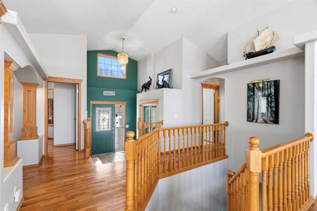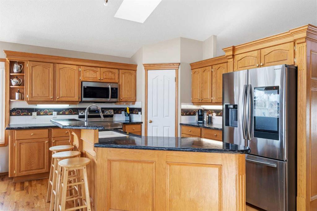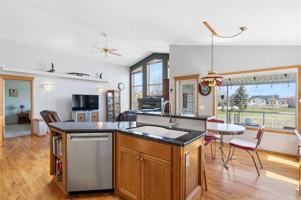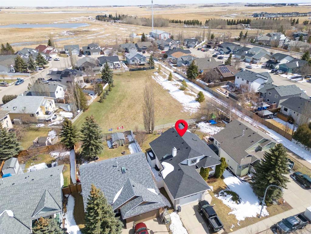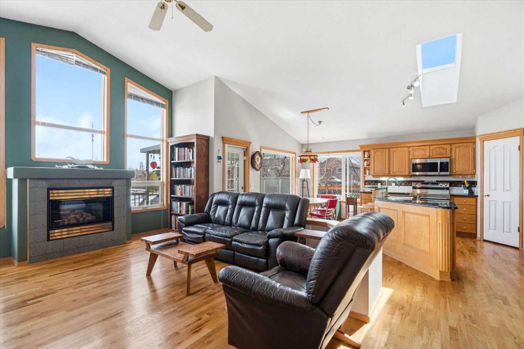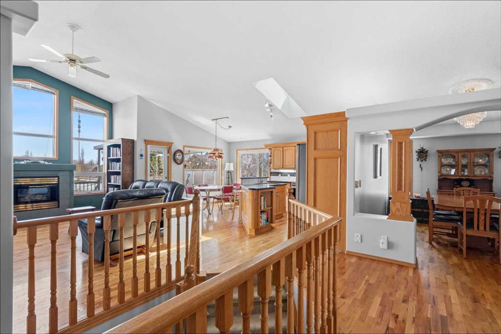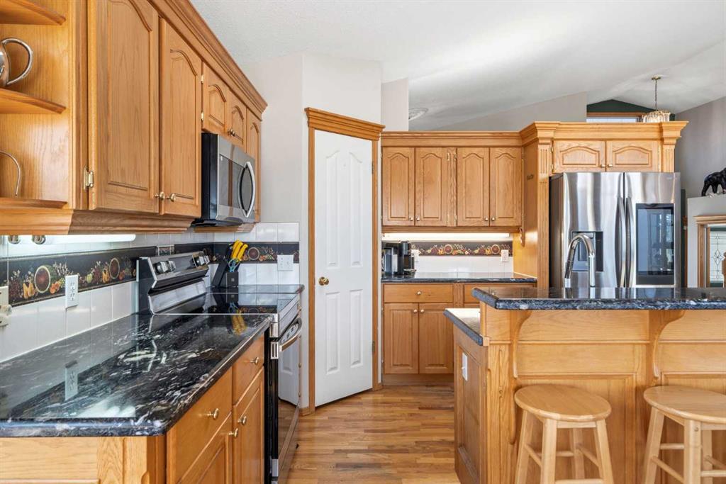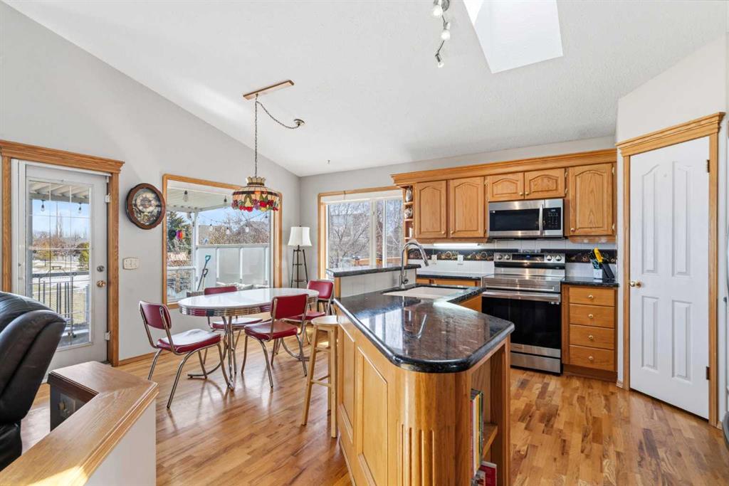 Welcome to this exceptional raised bungalow in the sought after community of Cambridge Glen in Strathmore, an ideal home for the discerning buyer seeking space, quality & a truly special setting. Backing directly onto a massive green space & park, this beautifully maintained & updated residence offers 1,482 sq. ft. above grade & 1,298 sq ft of professional development in the lower level, delivering outstanding functionality for families of all sizes. From the moment you arrive, the home’s curb appeal, featuring stone trim detail & an oversized, double-attached garage with direct interior access & thoughtful built-in storage, sets the tone for what lies within. Inside, the bright, open concept layout greets you, enhanced by soaring vaulted ceilings, new skylights, solid hardwood flooring & expansive windows that flood the home with natural light. The main floor is designed for both everyday comfort & elegant entertaining. A stunning great room features a cozy gas fireplace & a full wall of windows overlooking the park behind, while a formal dining room with artistic pillar detailing adds a touch of sophistication. The spacious kitchen is well appointed with granite countertops, newer stainless steel appliances, including a side-by-side fridge with front display, ample solid oak cabinetry, a central island with a raised eating bar, a corner walk-in pantry & an adjacent spacious nook area surrounded by windows. The primary suite is a true retreat, showcasing vaulted ceilings, a spacious walk-in closet & a luxurious 4 piece ensuite complete with a deep soaker tub, plus a separate shower & water closet area. A second main floor bedroom, also ideal as a home office, along with convenient main floor laundry enhances the home’s versatility. The raised bungalow design & oversized windows make the lower level incredibly bright & inviting, offering incredible additional living space. Here you’ll find three generous bedrooms, a large recreation and games area (perfect for a pool table or movie nights), a full 3-piece bathroom & abundant additional storage. Step outside to your private backyard oasis. The covered composite deck overlooks a beautifully landscaped, fully fenced yard that seamlessly extends into the expansive park / green space beyond, connecting you to many parks including Dinosaur Hill – an unbeatable setting for families, entertaining, or simply enjoying the outdoors. This home has been meticulously maintained & thoughtfully upgraded. Updates include new shingles (2025), fresh interior paint (2026), newer appliances, furnace serviced & air ducts cleaned(2025), water tank (2023), updated skylights (2023), removal of all Poly-B plumbing, central A/C, central vacuum & underground irrigation. With five bedrooms, 2.5 bathrooms, multiple living & entertaining spaces, plus a premium park location, this home offers an exceptional balance of luxury, practicality & lifestyle. Close to schools, pathways, recreation facilities, shopping, hospital, golf course