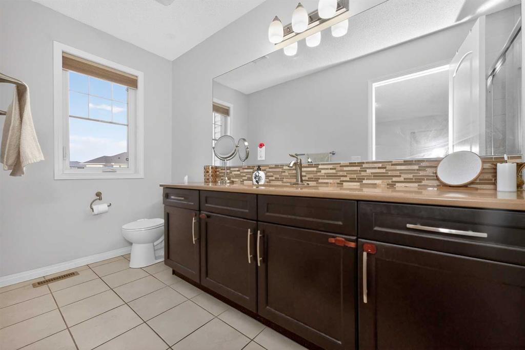 Ascend the stunning Maple staircase with sleek black spindles to the upper floor. The primary suite is a true retreat, boasting a spacious bespoke walk-in closet and a spa-like ensuite. The ensuite features an oversized fully tiled shower with a glass door, a custom double vanity with granite countertops, and tile flooring. Two additional generously sized bedrooms, each with large windows, share a well-appointed main bathroom featuring a combined shower and bathtub. The convenience of an upper-floor custom-built laundry room with shelving adds to the home’s thoughtful design.