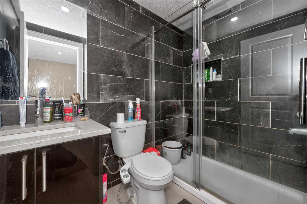 The fully developed basement offers an incredible space for recreation. It features a statement wet bar with a sleek quartz countertop, a large recreation area ideal for movie nights or games, and a full bathroom with a fully tiled custom shower and glass door.