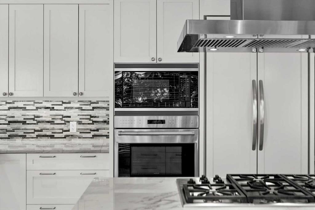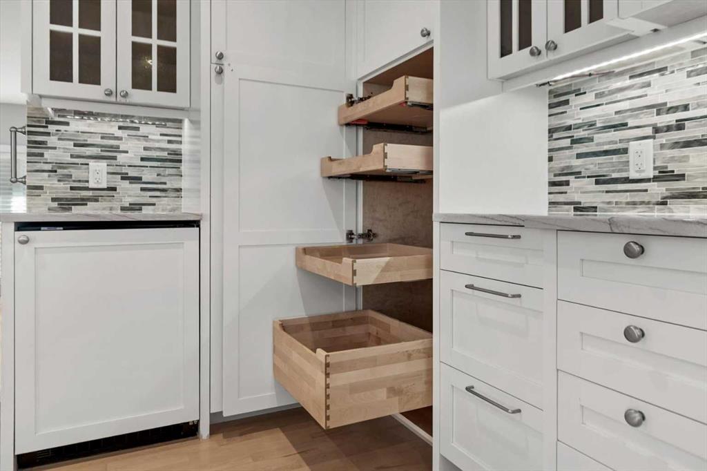 The luxurious renovated kitchen (2015) features a large island with quartz countertops, breakfast bar, and exceptional storage including soft-close drawers (approx. 20), corner organizer, and pullout pantry. Stainless steel appliances (2015) include an integrated-front refrigerator, dishwasher, and bar fridge, plus a gas cooktop with chimney-style hood fan, built-in wall oven and microwave. The kitchen overlooks the warm family room with a brick-faced wood-burning fireplace and views of the fully fenced backyard.