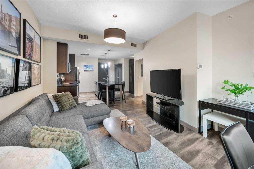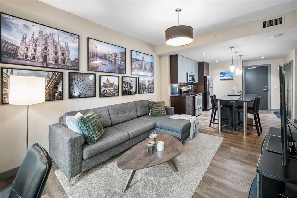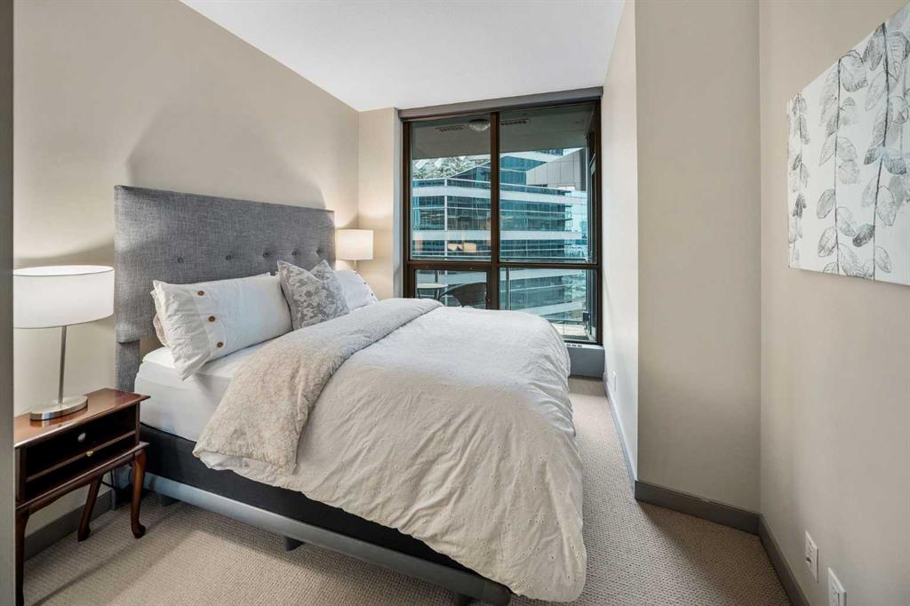 SLEEK 2 BED, 2 BATH, TURNKEY CONDO IN THE HEART OF CALGARY! Imagine living above Sunterra Market with fresh groceries, ready-to-go meals, and your morning coffee just an elevator ride away. This is the Beltline, Calgary’s most vibrant inner-city community where everything happens. Walk to the Saddledome for concerts or Flames games, experience the buzz of Stampede Park, shop and dine along 17th Avenue, or head out to the river pathways for a change of pace. Living the life in the Beltline means your days are connected, your evenings are lively, and your weekends are filled with endless options. At Keynote 1 you are not just buying a condo, you are putting yourself in the center of Calgary’s energy where work, play, and lifestyle all come together. This 15th floor residence offers nearly 900 sqft of chic and functional living with two bedrooms and two full bathrooms. Floor-to-ceiling windows flood the open-concept space and the dining area flows seamlessly onto your spacious balcony finished with interlocking wood tiles that add warmth and style to your private outdoor retreat. Inside, the kitchen is designed to impress with granite countertops, stainless steel appliances, and a custom-style shelving unit that extends your pantry or provides a showcase for glassware, plus a convenient breakfast bar perfect for pre-game cocktails with friends or a post-concert Skip order. Recently updated luxury vinyl plank flooring enhances the modern feel, while in-suite laundry deliver convenience. Unlike most condos, this property comes with not one but two storage lockers, a rare and valuable feature for condo living, along with a titled, secure, heated underground parking stall. BONUS: All the furniture, cookware/glassware, small appliances, cutlery, TV, dining room set can stay. Keynote residents enjoy premium amenities including two fitness facilities, one dedicated to weights and the other to cardio, a stylish owner’s lounge with table games and gathering spaces, and a landscaped courtyard with outdoor BBQs, water feature wall, and room to celebrate with family and friends. Hosting guests is effortless with access to two fully furnished suites available at an affordable nightly rate. Whether you are seeking your own urban retreat or a smart investment in Calgary’s most undeniable location, this home delivers lifestyle, convenience, and exceptional value all in one.
