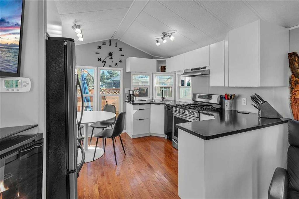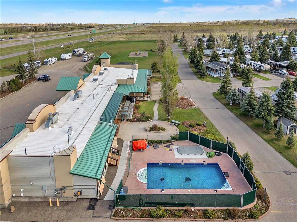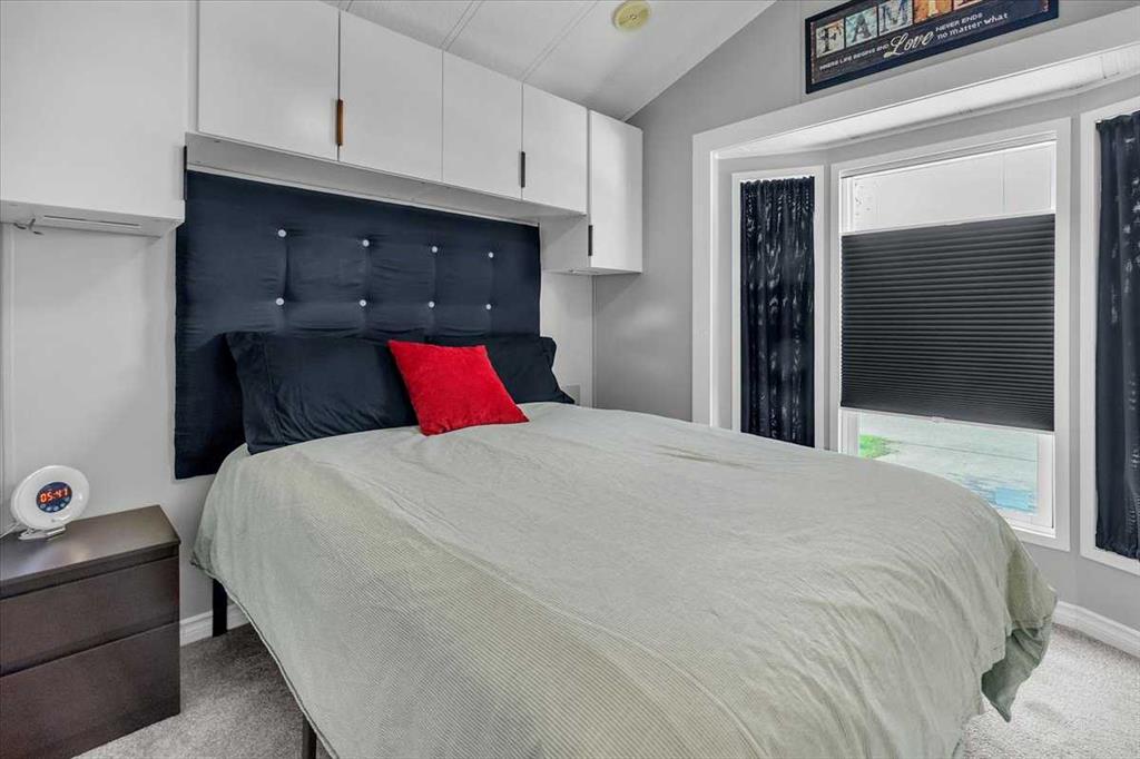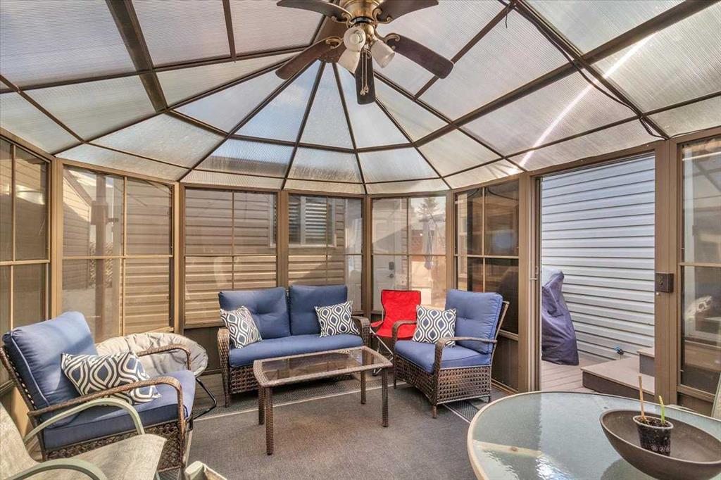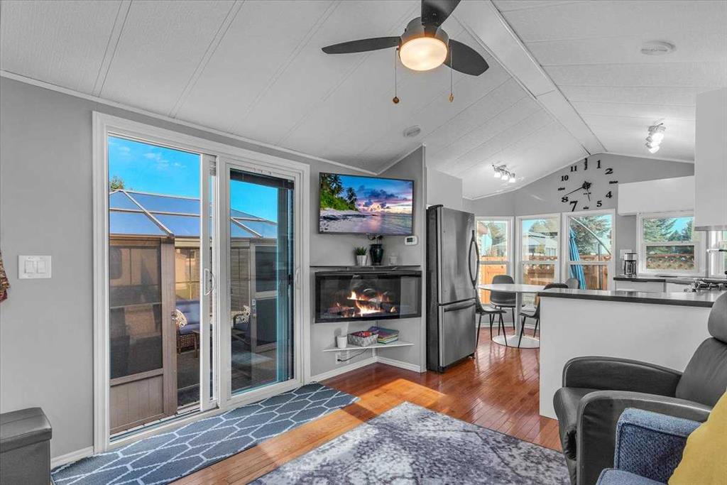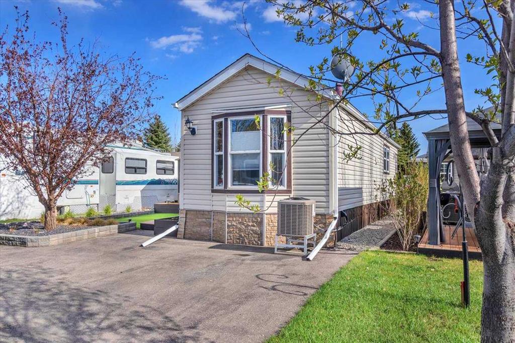 Welcome to Country Lane Estates, a neat RV community alongside the Sheep River and just outside of Okotoks, with close proximity to Calgary! This park has a sense of pride of ownership throughout the community and is seasonal-open from April 1st to October 31st. You will absolutely ENJOY this renovated park model which comes fully furnished with all the furniture inside and out except for the master bed, mattress, office chair and barbeque! You will love the bright, new kitchen, including newer appliances and a pantry in the hallway cabinets (which double up as an entry closet with extra storage), plus the bright cozy dining area with table and chairs. The living room features a newer sofa which doubles up as a hide-a-bed, the 40″ smart TV and a new electric fireplace for those chilly evenings in Alberta. The 4 pc bath comes with a large shower, new vanity and toilet. The laundry area has enough space for the desk which is included and the primary bedroom features a new wall unit as well as extra storage above the bed. This whole unit has been freshly painted and comes with hardwood in the main living area, newer carpet in the bedroom and new flooring in the rest of the home. You have the advantage of a maintenance free yard which is freshly manicured with some green turf, perennials, a large 3 season solarium which includes the furniture and lots of deck area. You will love the 12×12 storage shed which has recently been converted into a bedroom and comes with all the furniture-so convenient for family or guests that come. The Clubhouse at the entrance to the park boasts a fitness gym, an outdoor pool, hot tub, laundry facility, BBQs, meeting spaces and a lounge with pool table, games, books and an auditorium with a stocked kitchenette for larger events that you may want to host. Being that it’s right alongside the river you can enjoy fishing, walks along the river or the walking path in the park so you can stop to chat with neighbors AND your kids will enjoy the playground and the dog park. This is a very friendly RV park that definitely has a great sense of community. This is a bare land condo and the power meters will be installed on each individual lot this June bringing the condo fees down to $188. per month.