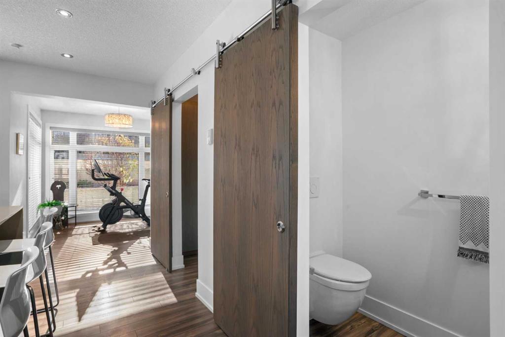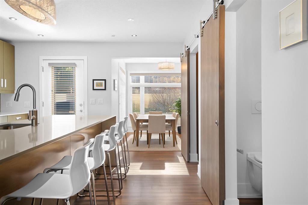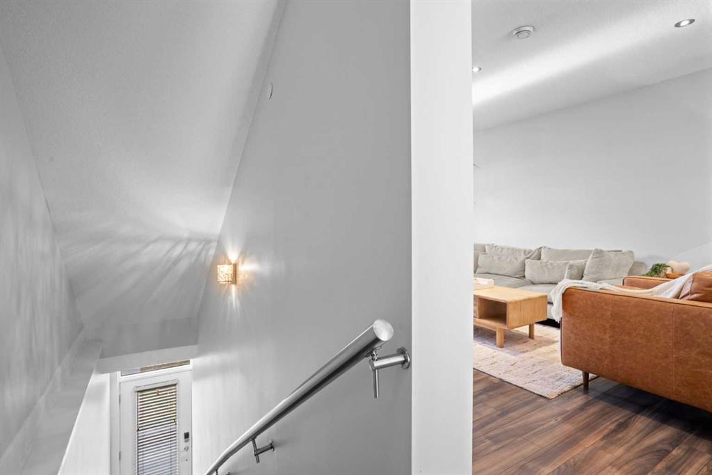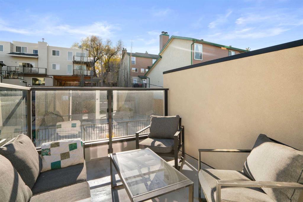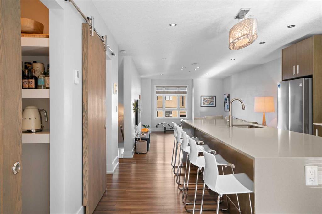 This stylish and sun-filled townhouse in Bankview offers the perfect blend of modern design, functional space, and unbeatable value. Featuring two heated and secure underground parking stalls, this home stands out with thoughtful upgrades and a layout ideal for both everyday living and entertaining. The open-concept main floor is anchored by soaring 9-foot ceilings and durable laminate flooring throughout. A spacious living room offers plenty of room to relax or host guests, while the kitchen is a true showpiece with a large waterfall quartz island, undermount sink, stainless steel appliances, gas range, and a deep pantry with both open and closed storage. The adjacent dining area is surrounded by two walls of south-facing windows, filling the space with natural light. Just outside, a shared patio with gas hookup creates a perfect spot for summer evenings and weekend lounging. A convenient two-piece bathroom completes the main level. Upstairs, both bedrooms are generously sized and feature their own private ensuite bathrooms and built-in wardrobes. The primary suite is oversized with excellent storage and a sleek 4-piece bath. The secondary bedroom features a five-piece ensuite, additional closet space, and its own private south-facing balcony overlooking the courtyard. The upper level also includes the laundry machines, conveniently located near both bedrooms for added ease and efficiency. With secure underground parking, modern finishes, and a location close to transit, shopping, parks, and the university, this home is the total package. Monthly condo fees include everything except electricity, offering true peace of mind in this turnkey property.