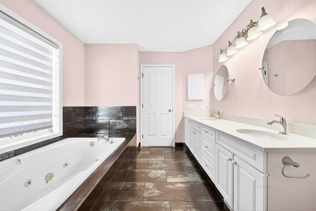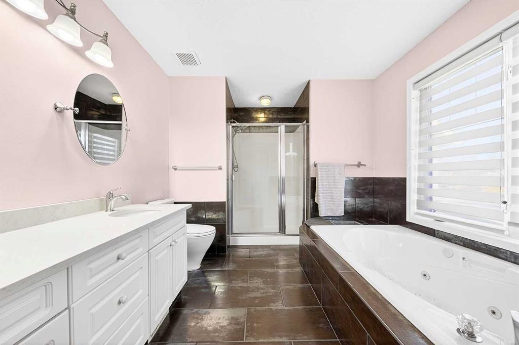 Upstairs, you’ll discover FOUR full bedrooms — a rare find in McKenzie Towne. The primary bedroom is a private retreat with hardwood flooring, double sinks, quartz counters, a jetted soaker tub, and a separate shower. The additional oversized bedroom, complete with its own fireplace and office/study corner, makes for a cozy personal haven, while the other two bedrooms offer plenty of space for family or guests.