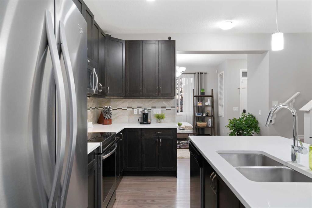 The main floor features a comfortable living area, a spacious dining space, and a stylish kitchen complete with dark cabinetry, stainless steel appliances, and a large island that’s perfect for both daily use and entertaining. A convenient 2-piece bathroom completes the main level.