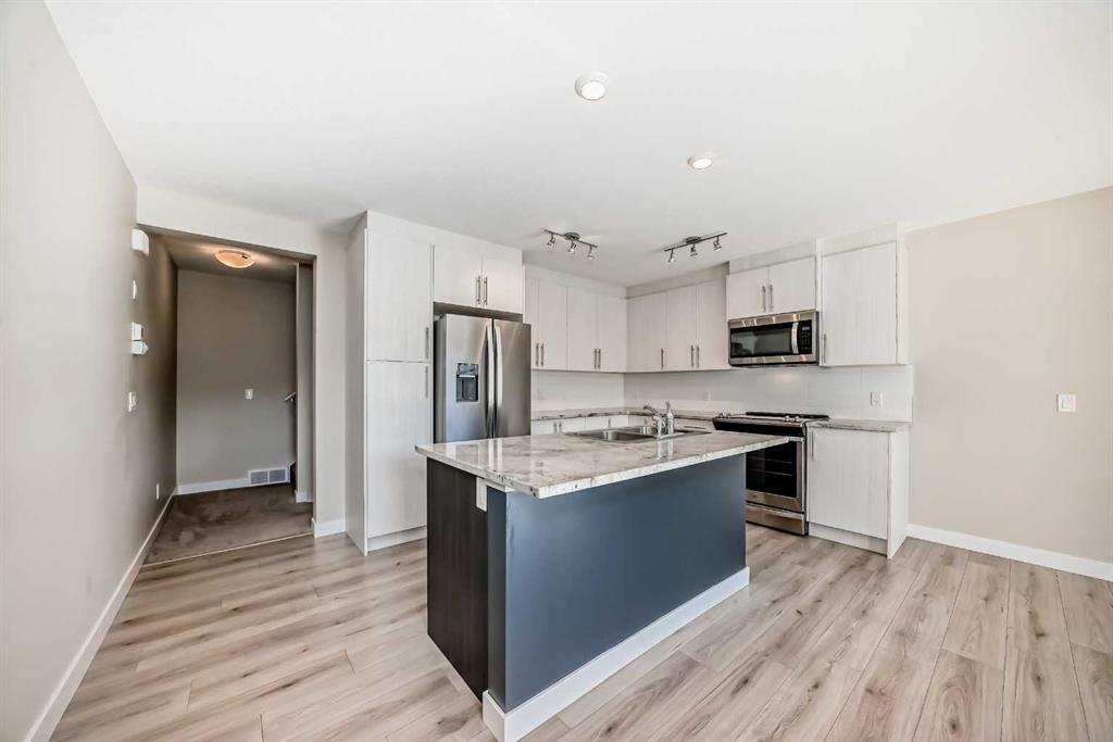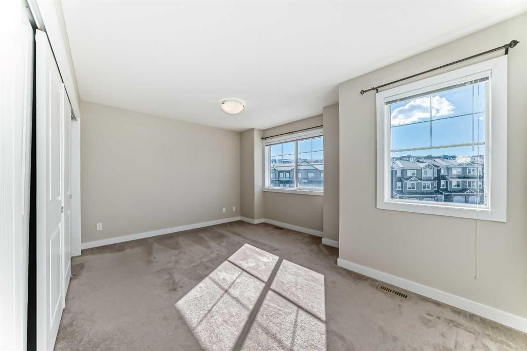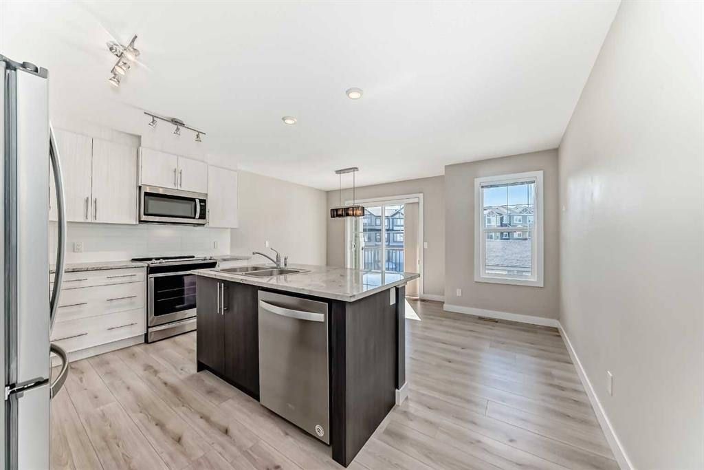 Do you dream of a modern, 3 bedroom, 3 bathroom townhome, boasting TWO balconies, 1 lower patio, walkout, an attached garage, and still be close to shopping & have quick commutes AND still be able to afford it? This is your NEW HOME. The heart of home, the kitchen, has an immense central island, ideal for your family to gather around. Upgraded appliances (space saving microwave hoodfan combo, easy to clean glass stove top, and french style fridge with ice maker). Modern contrasting cabinetry, subway tile backsplash, and oodles of cabinets will ensure you relish your time here. The party can stay contained in the kitchen OR spill onto the rear balcony. Just steps down, you’ll find the amazing 1.5 storey living room, with the tall soaring ceilings, and the SECOND balcony. Going upstairs, you’ll find 2 master ensuites, both boasting 4 piece ensuites, and ample closets (front has his/her closets, rear has walk-in). The walkout level boasts the third bedroom, along with storage / mechanical space. High efficiency furnace to help keep your utilities low.