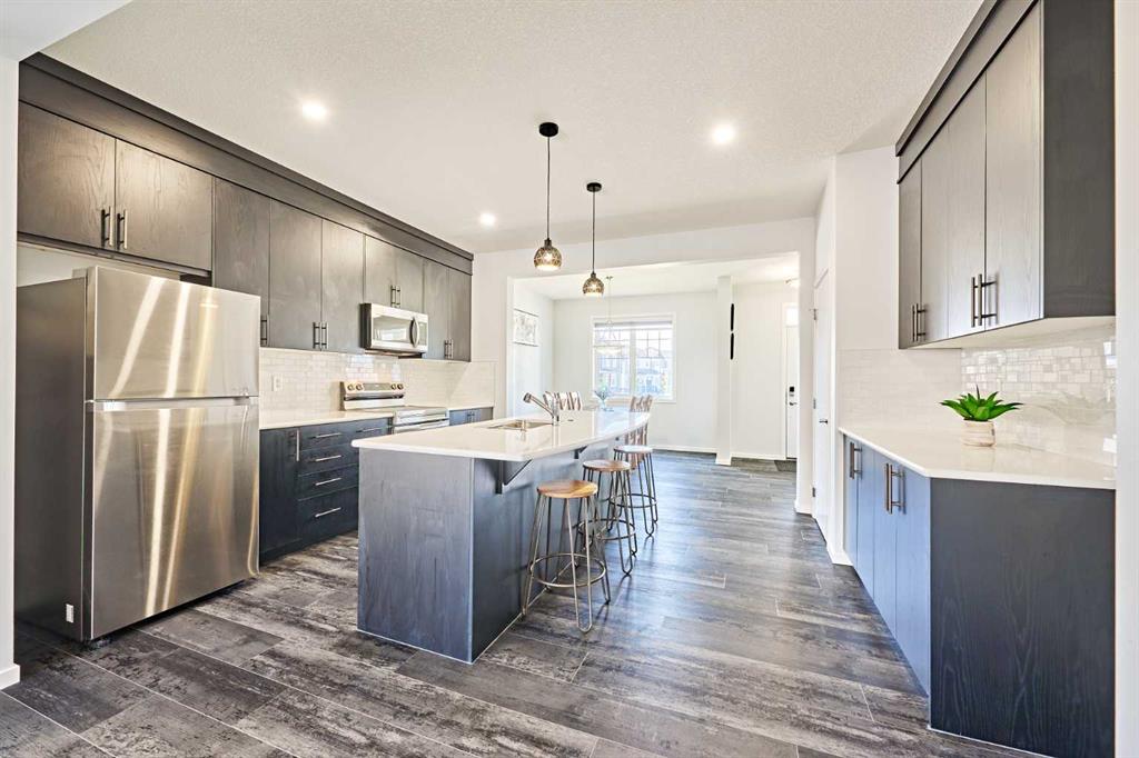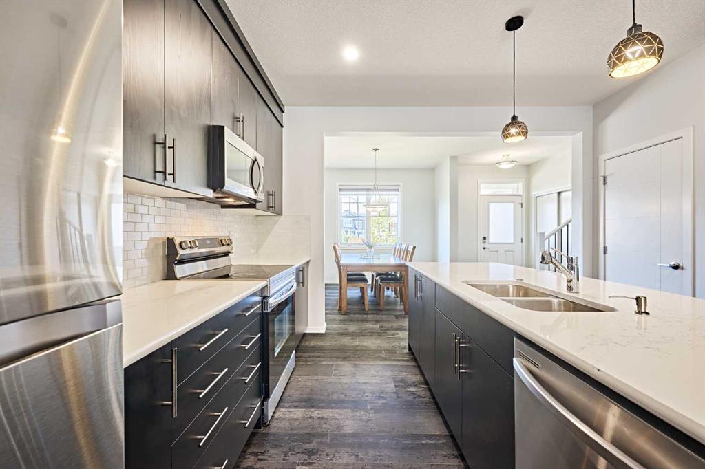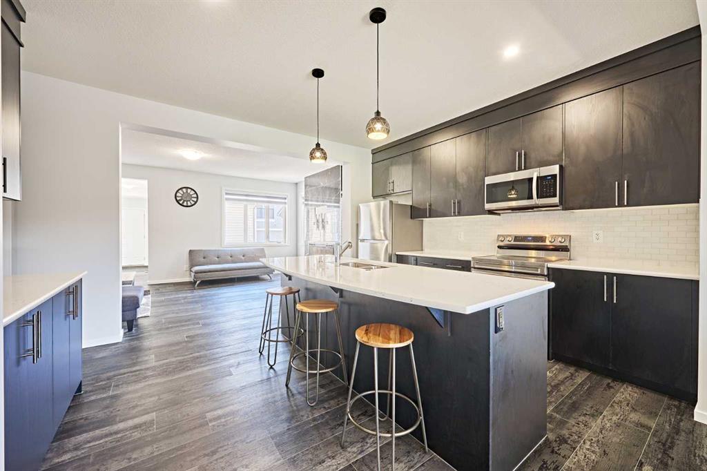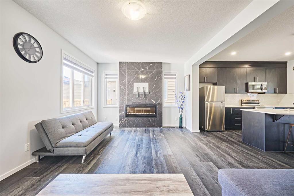 Step through the porch into a spacious front entry, complete with a large closet — perfect for coats and shoes. From there, you’re welcomed into a bright open-concept main floor that seamlessly connects the living room, dining area, and a stunning kitchen featuring a huge quartz island, ceiling-height cabinets, and a custom backsplash. The living room showcases a sleek dark-themed feature TV wall with an electric fireplace, adding a modern and elegant touch.