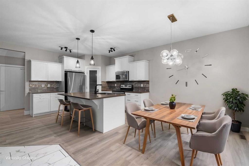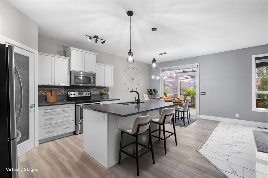 Welcome to this beautifully upgraded two-storey residence nestled in a quiet and desirable location, offering exceptional living space and refined finishes throughout. From the moment you enter, you’ll appreciate the elegant vinyl flooring that flows seamlessly through the foyer, powder room, kitchen, and dining area. The home is highlighted by a stunning oak staircase with modern metal spindles, creating a striking architectural feature. A front flex room with double French doors provides the perfect space for a private office, library, or study. Designed for both everyday living and entertaining, the gourmet island kitchen showcases granite countertops and a full stainless steel appliance package, including refrigerator, dishwasher, over-the-range microwave, and electric glass-top stove. The spacious dining area is filled with natural light and features patio doors leading to a spacious deck, ideal for indoor-outdoor living. The generous living room offers a warm and inviting atmosphere with a corner gas fireplace, perfect for relaxing evenings. Upstairs, you’ll find a spectacular oversized bonus room, along with two well-appointed secondary bedrooms and a stylish 4-piece bathroom featuring tile flooring and a granite vanity. Double doors lead to the luxurious primary retreat, complete with a walk-in closet and a spa-inspired 5-piece ensuite featuring a soaker tub, dual sinks, walk-in shower, private water closet, granite vanity, and tile flooring. The newly developed lower level expands the home’s living space with two additional bedrooms, a full bathroom, and a wet bar, offering incredible flexibility for guests, extended family, or entertaining. Combining thoughtful design, upscale finishes, and a peaceful setting, this exceptional home is move-in ready and sure to impress.